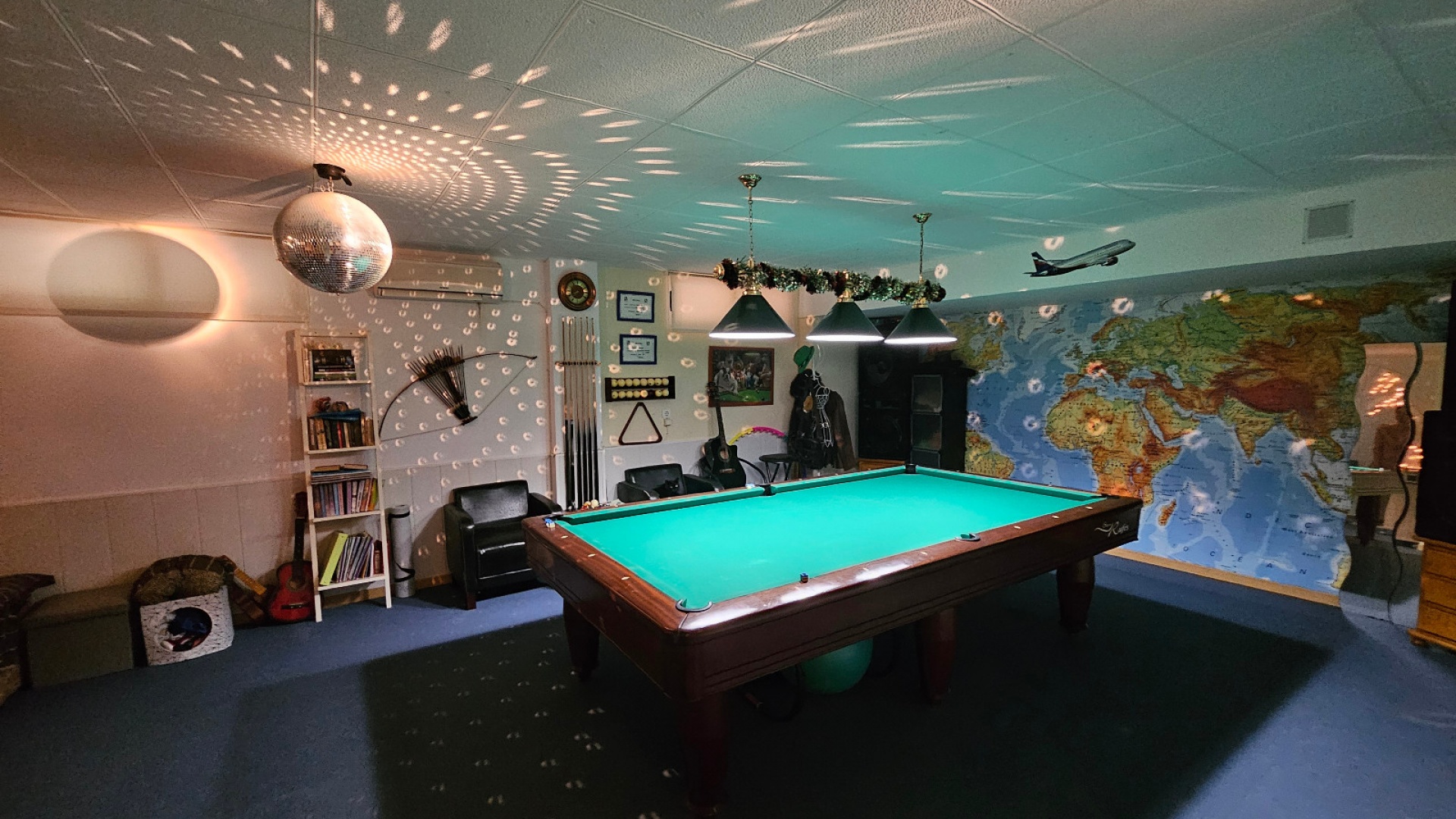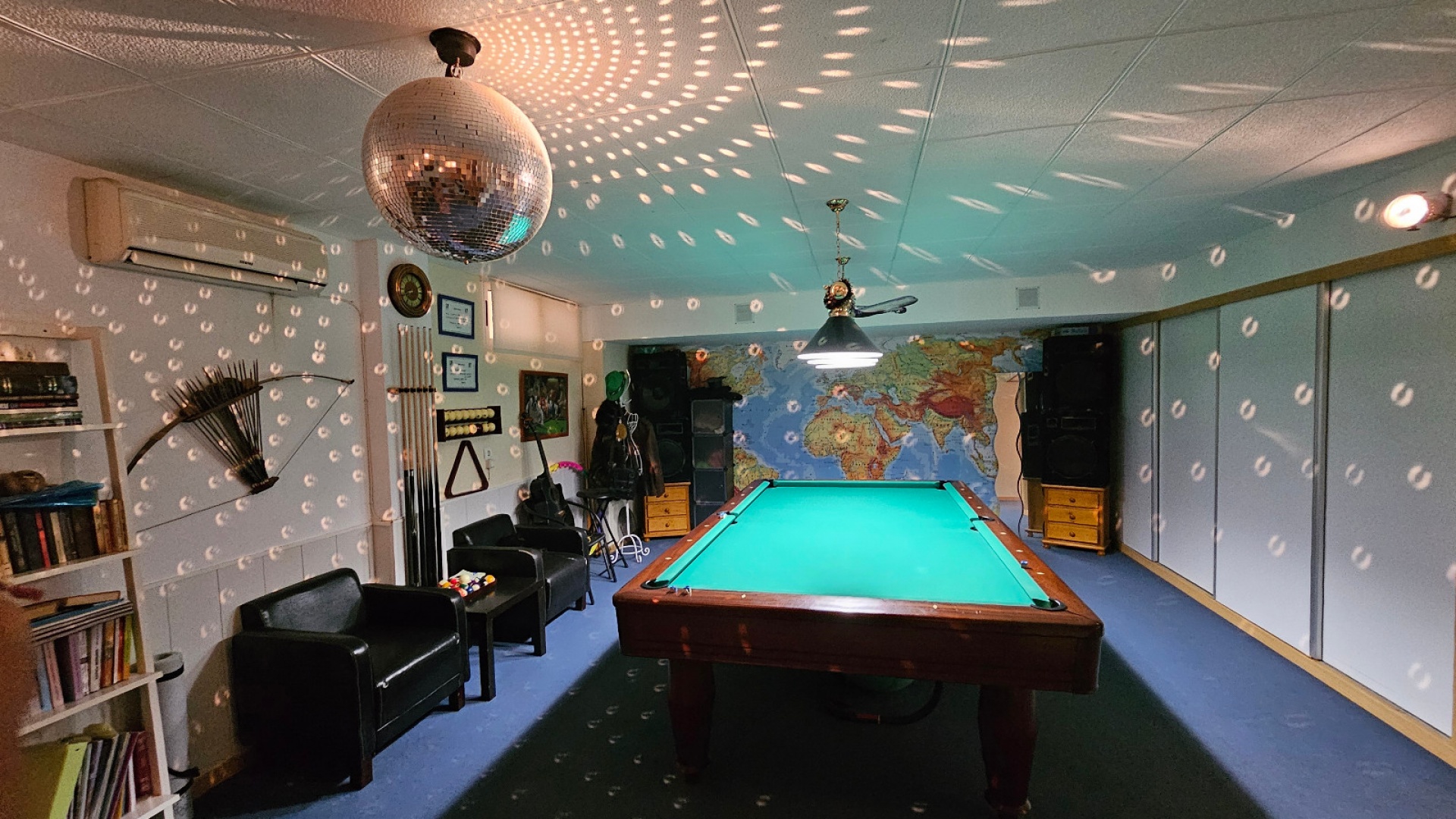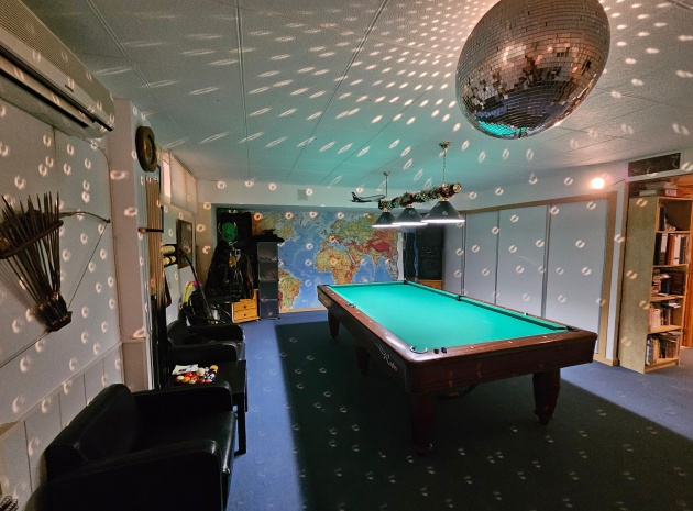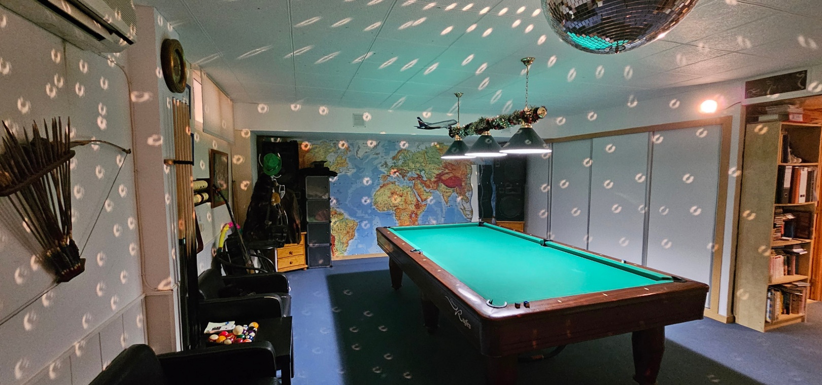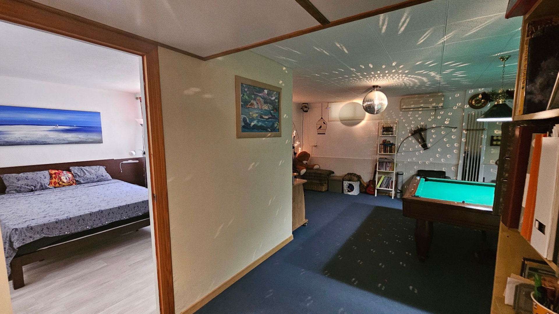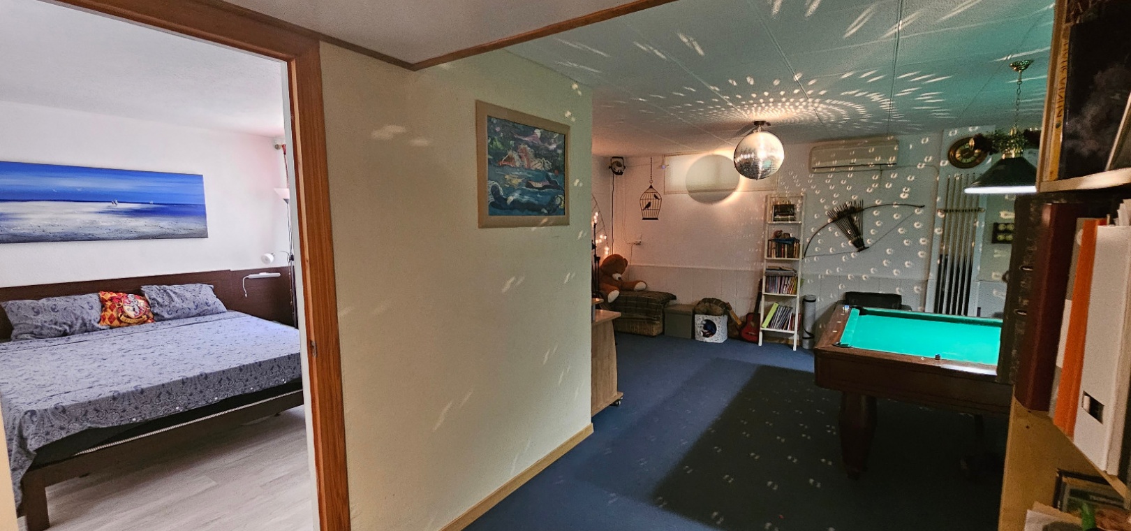 Es gibt einen großen Unterbau mit einem Schlafzimmer, einem Barbereich und einem großen Spielzimmer mit Einbauschränken und Klimaanlage (warm/kalt).