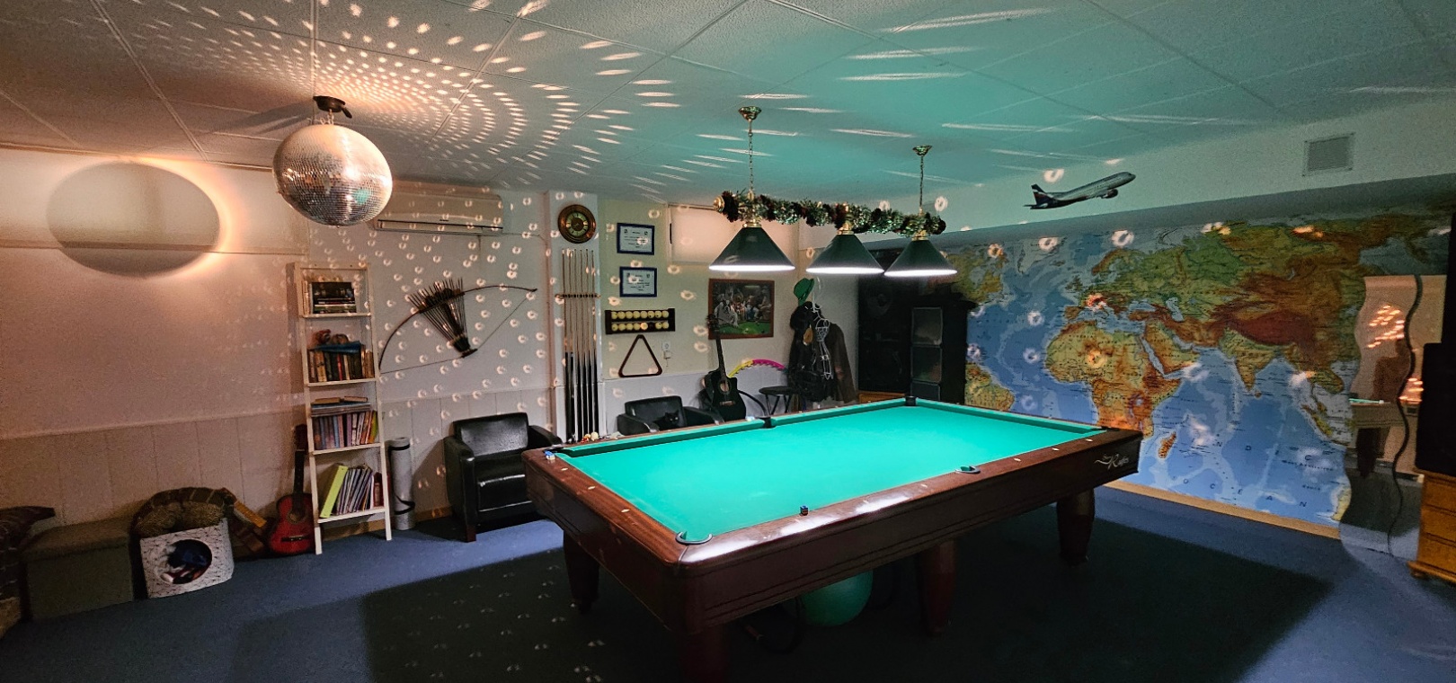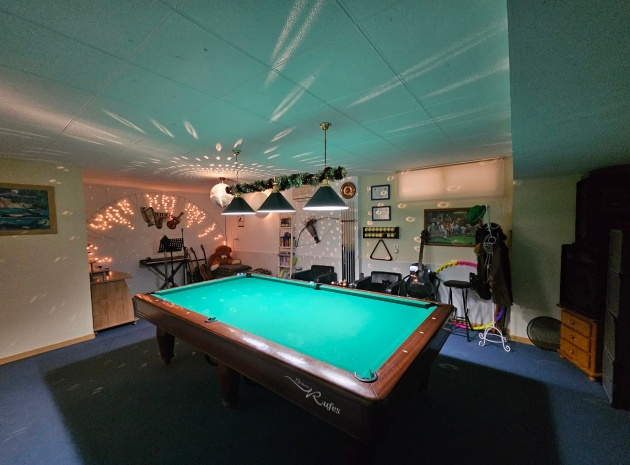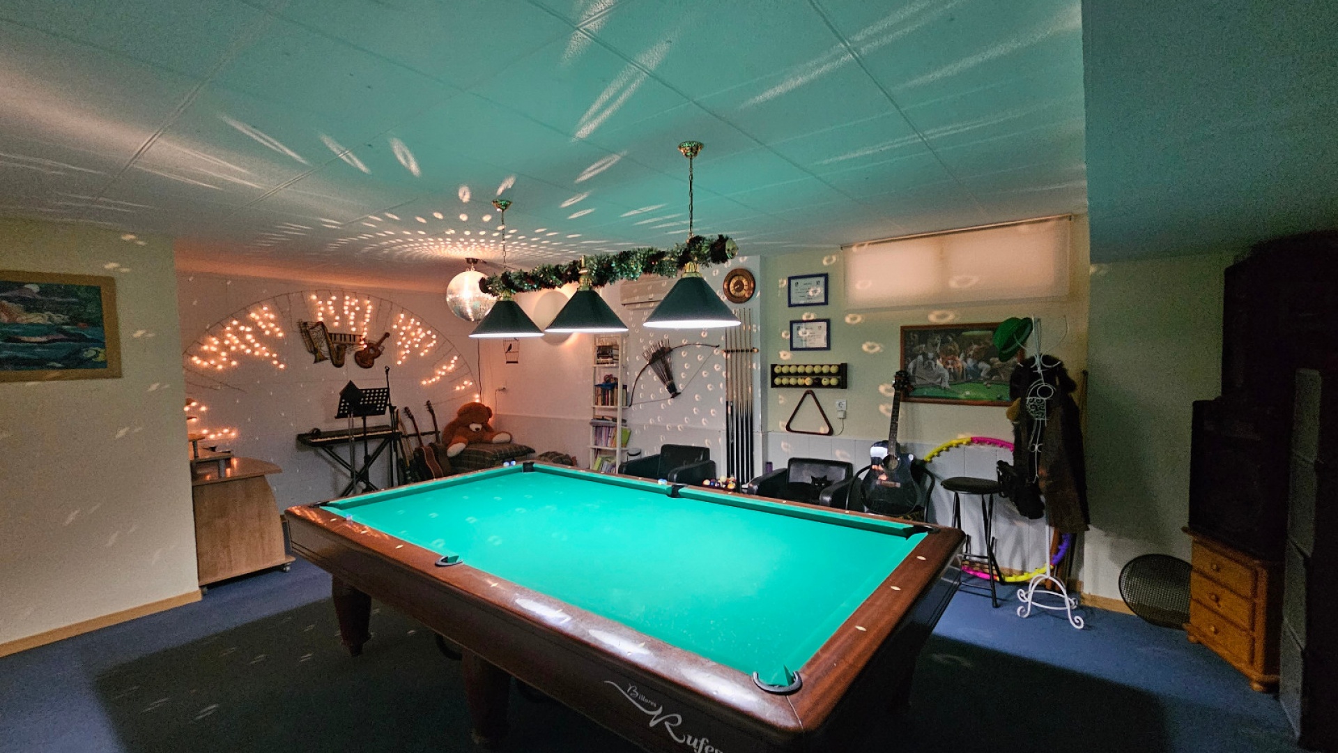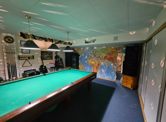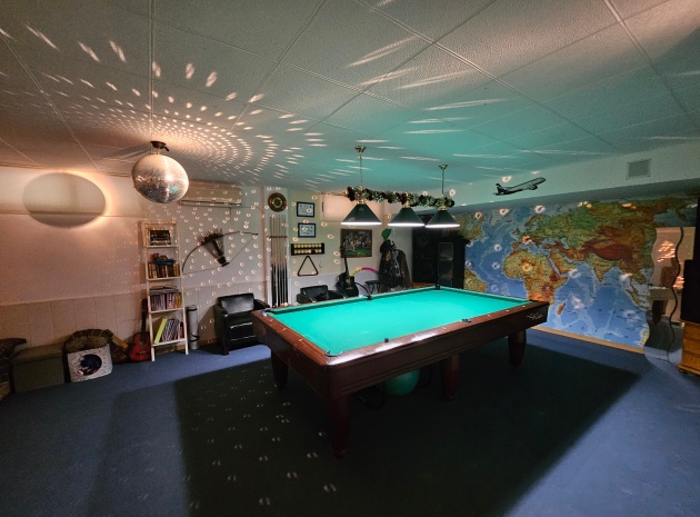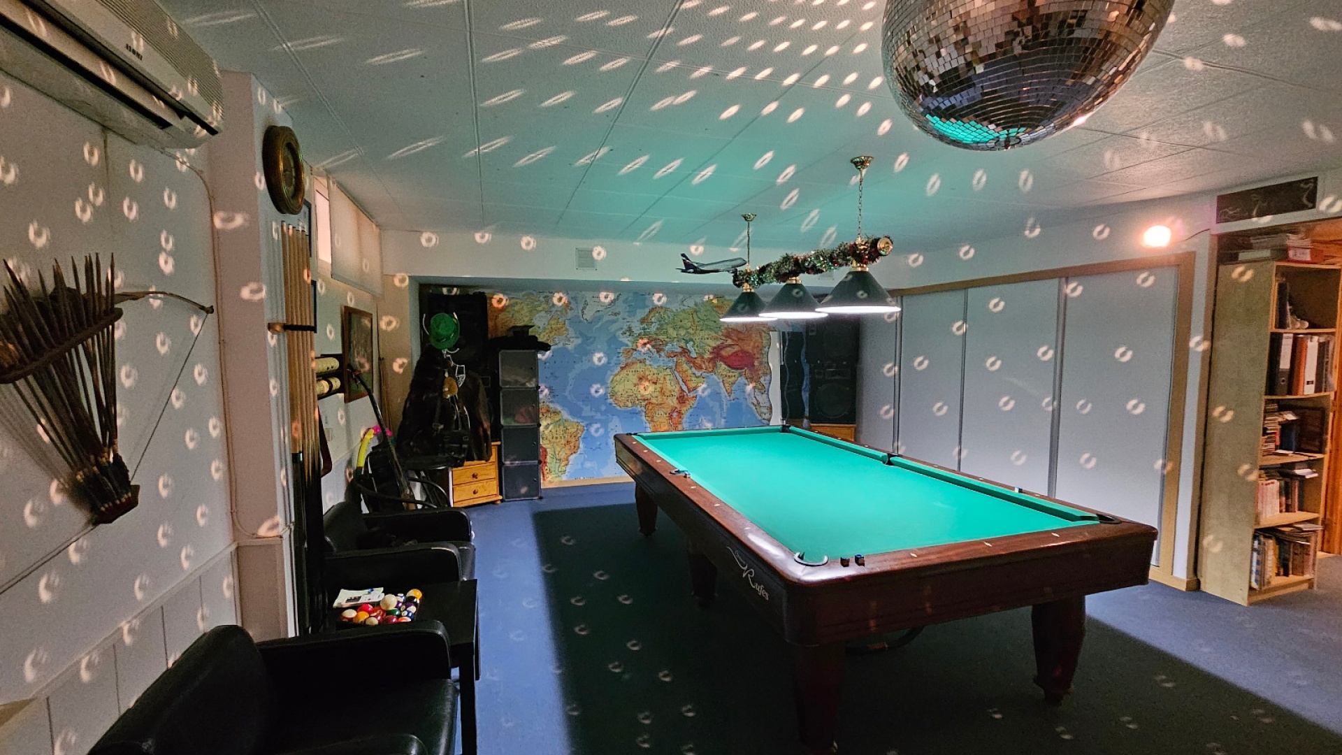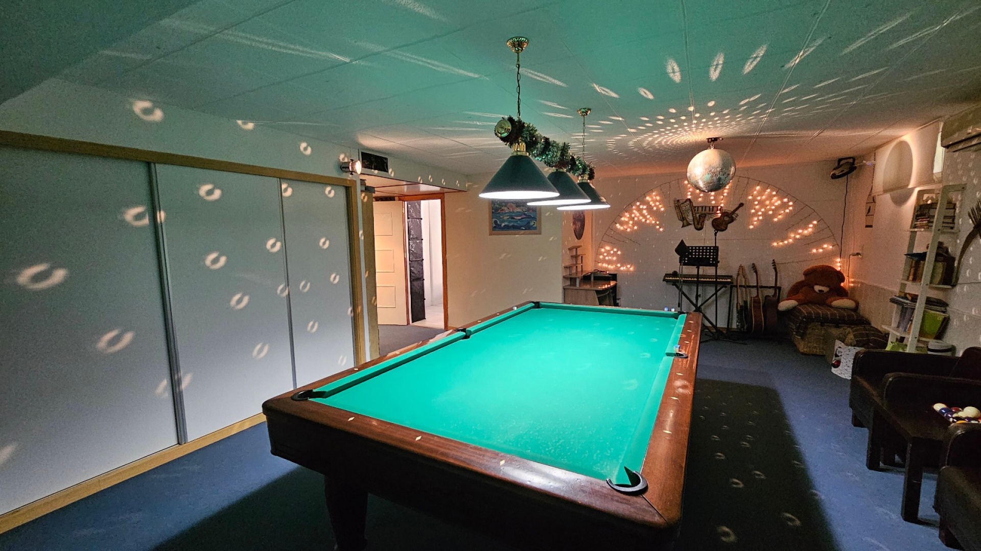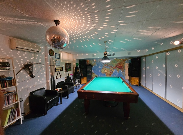 Es gibt einen großen Unterbau mit einem Schlafzimmer, einem Barbereich und einem großen Spielzimmer mit Einbauschränken und Klimaanlage (warm/kalt).