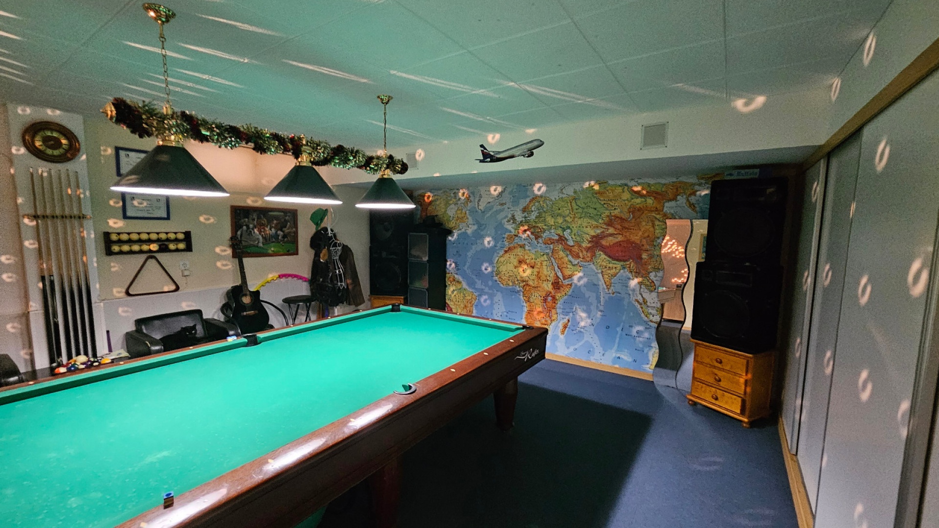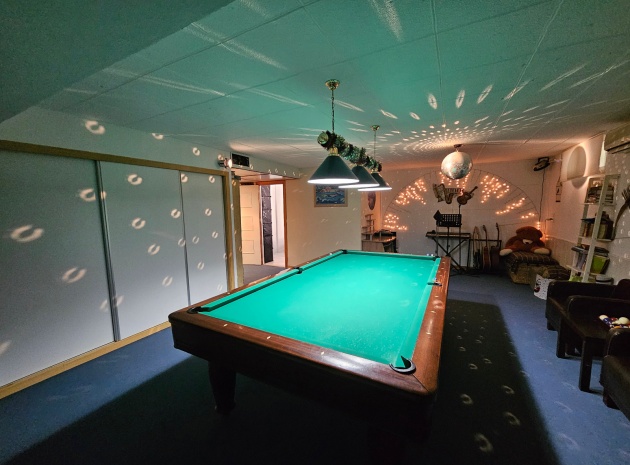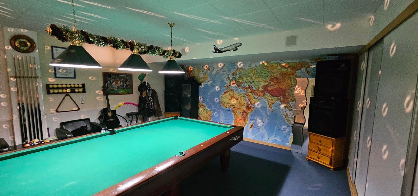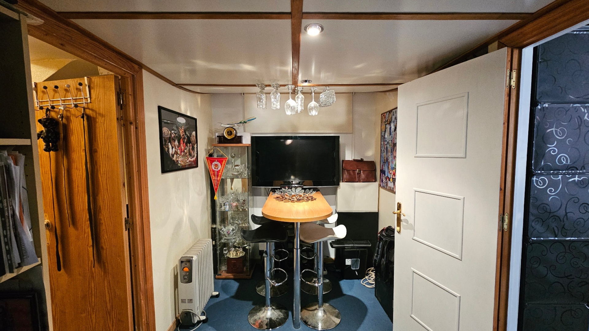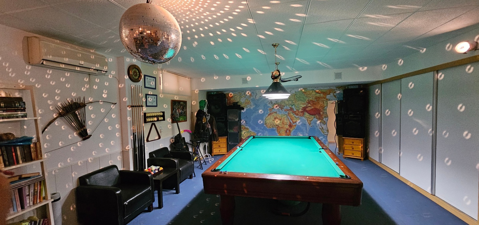 Es gibt einen großen Unterbau mit einem Schlafzimmer, einem Barbereich und einem großen Spielzimmer mit Einbauschränken und Klimaanlage (warm/kalt).