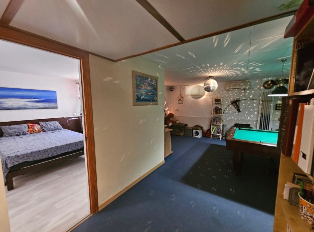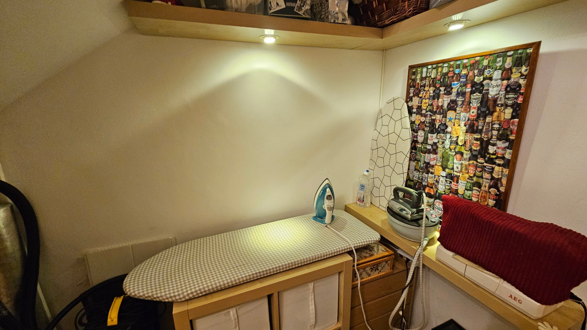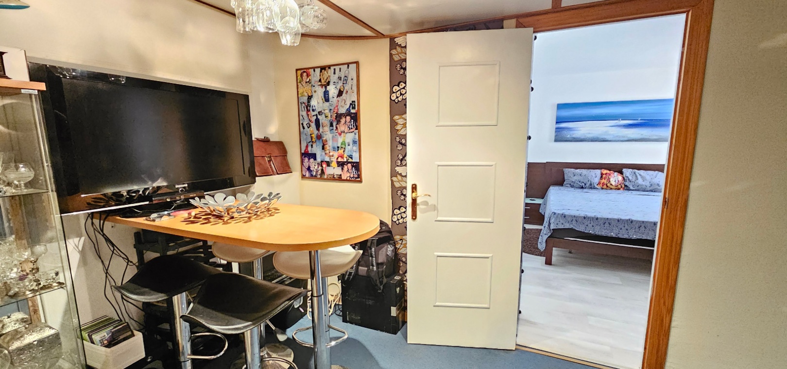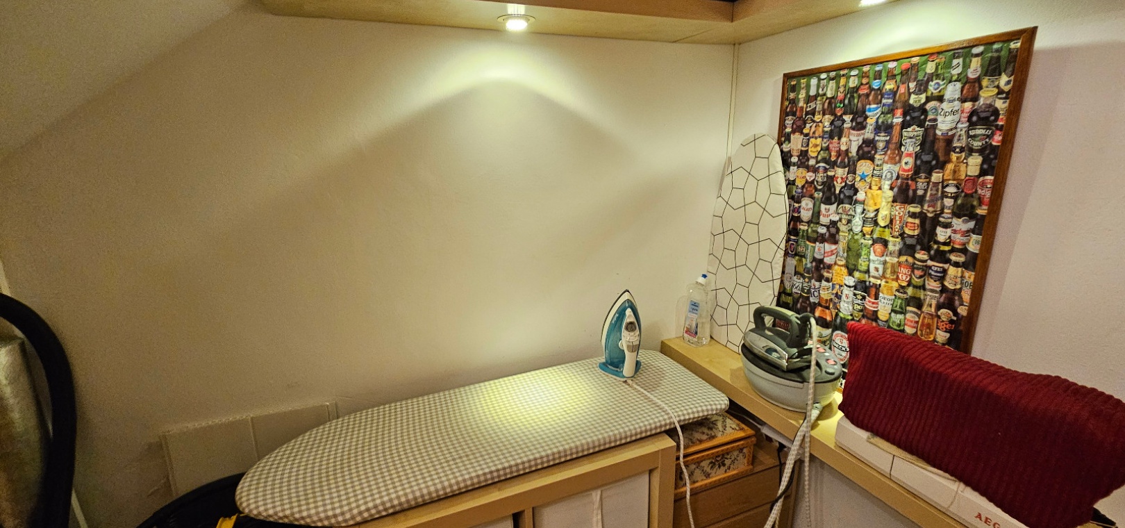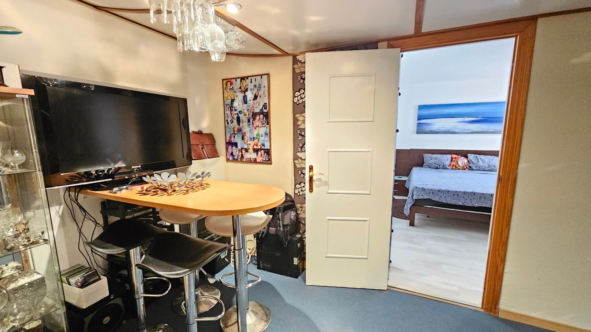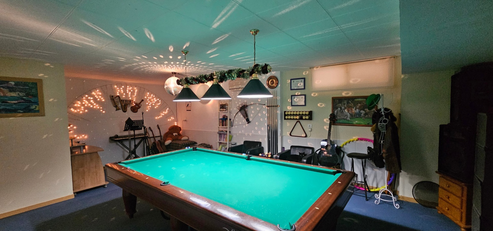 Es gibt einen großen Unterbau mit einem Schlafzimmer, einem Barbereich und einem großen Spielzimmer mit Einbauschränken und Klimaanlage (warm/kalt).