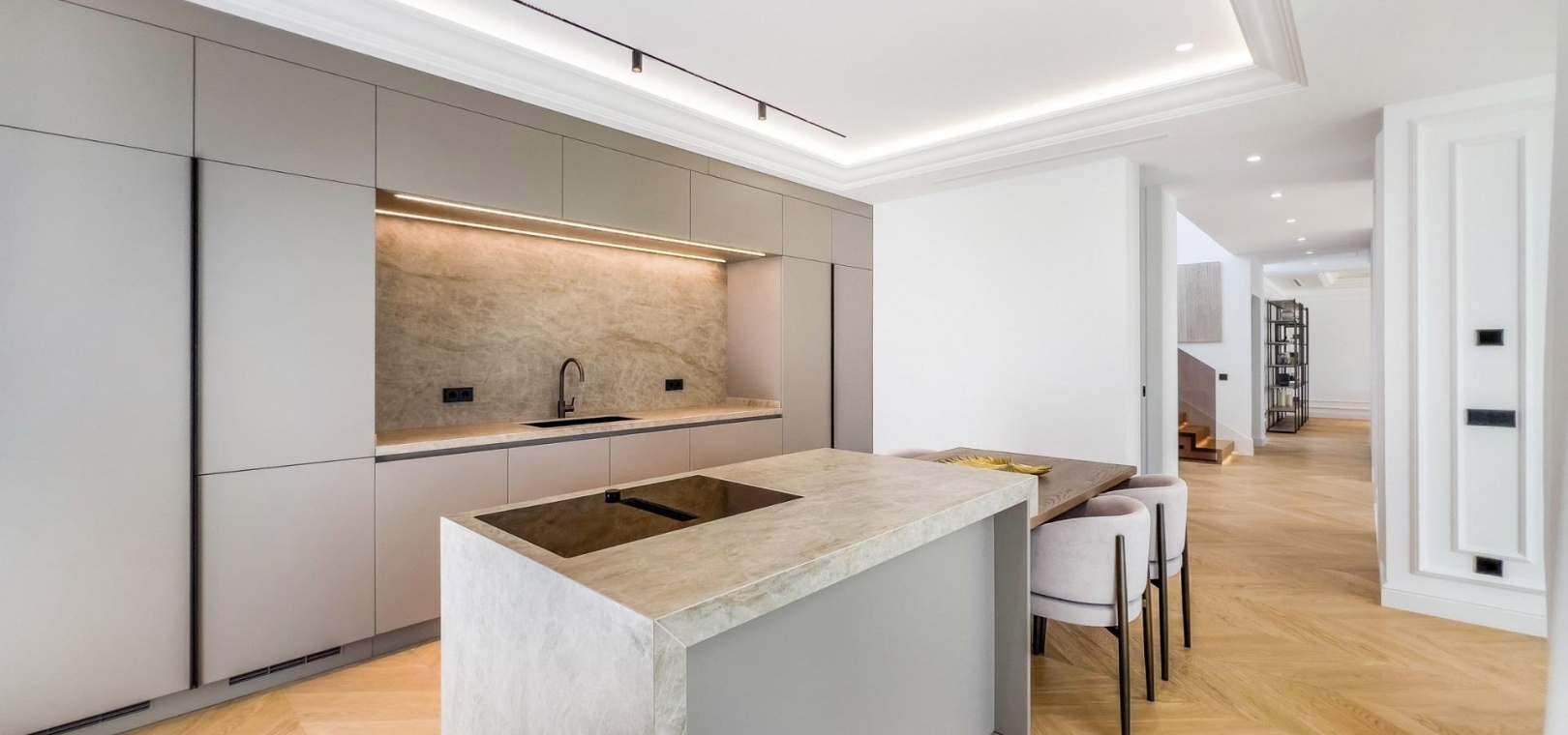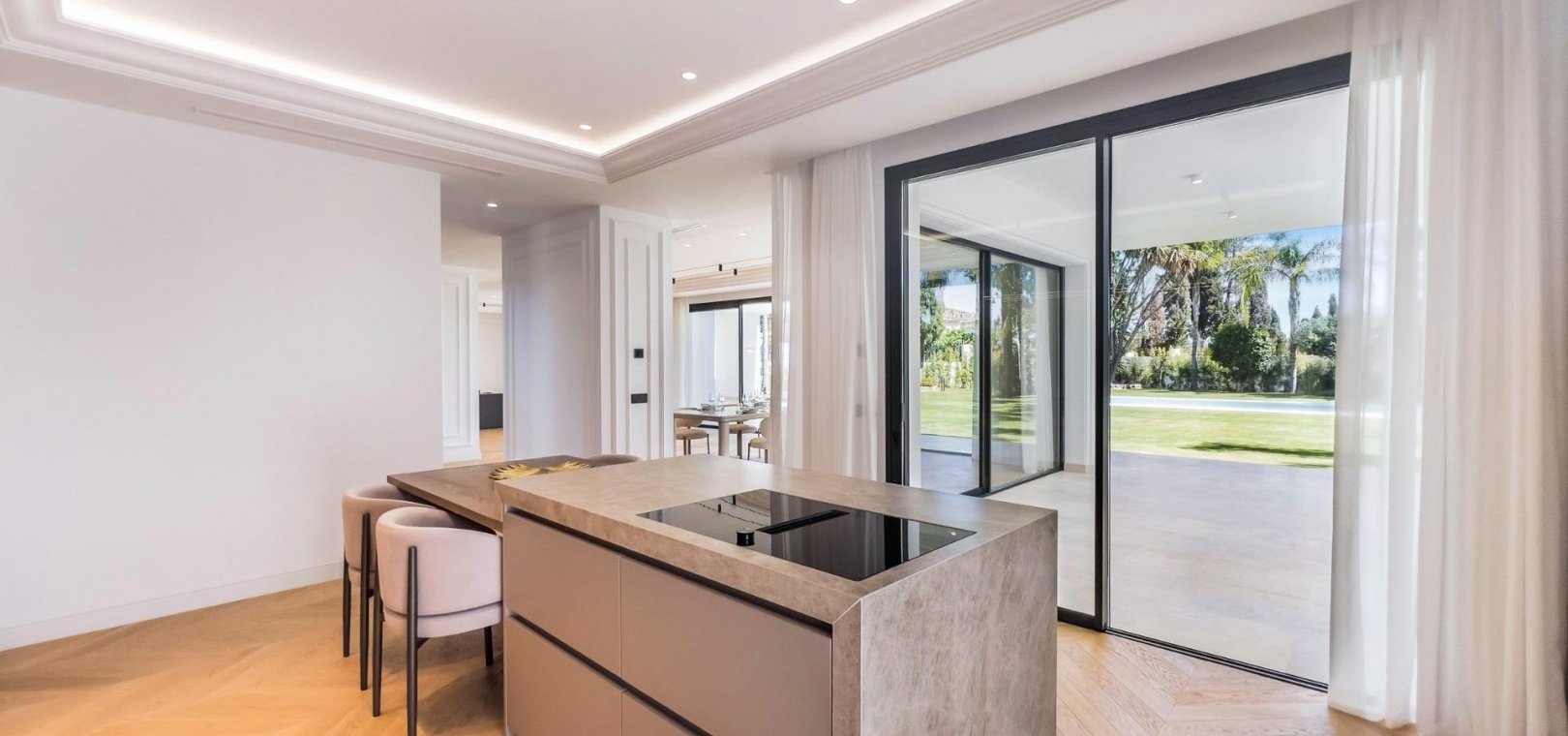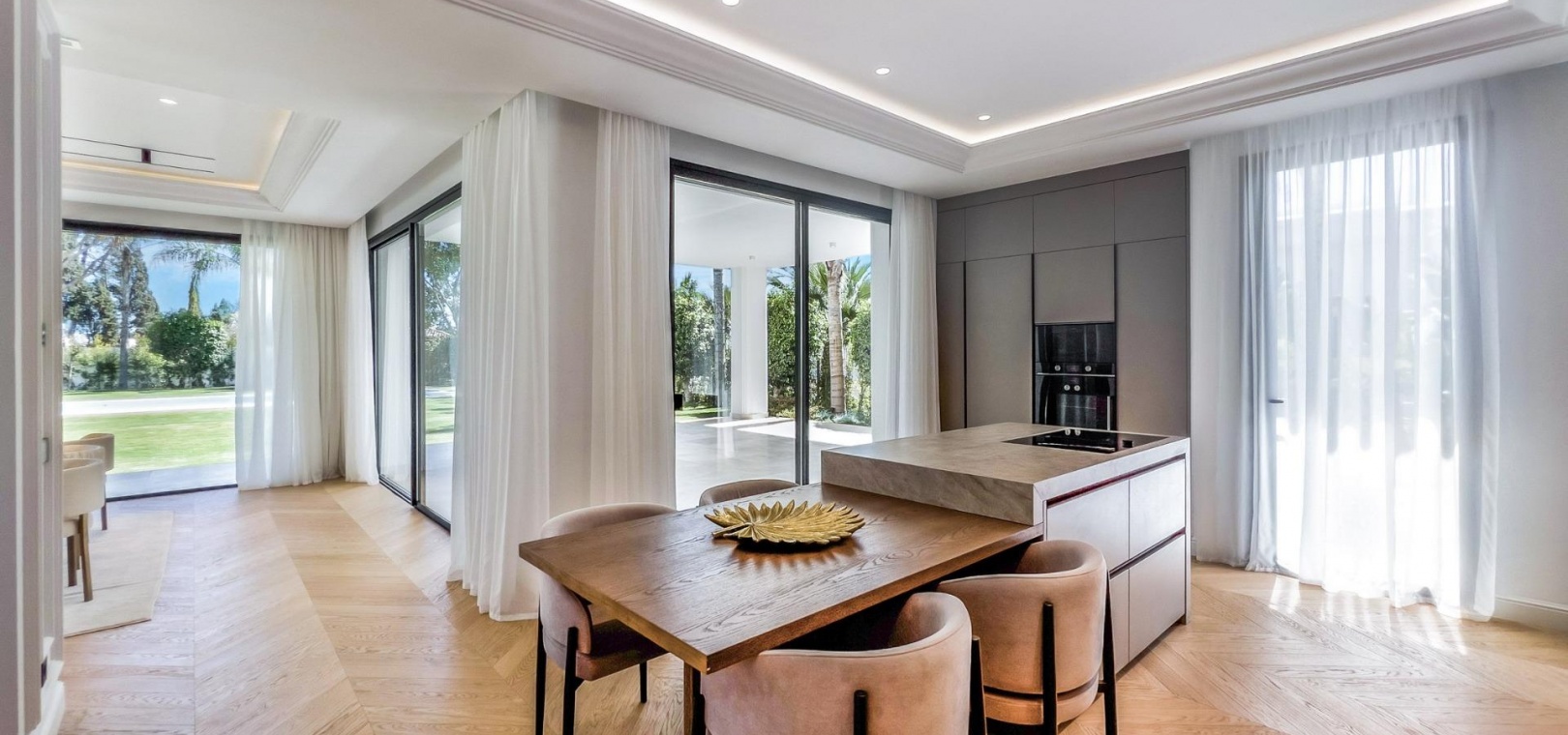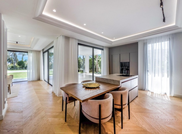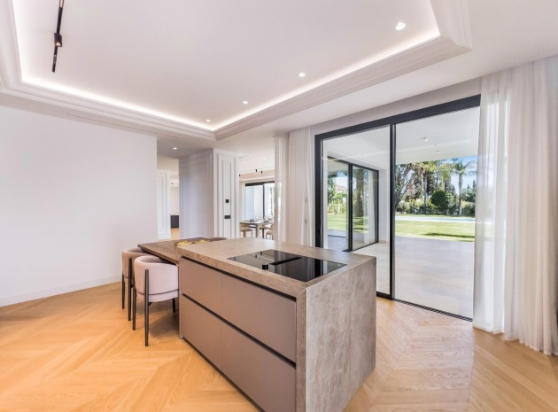 Wenn man die Villa betritt, findet man im Hauptgeschoss einen großen Raum, der in mehrere Bereiche unterteilt ist. Die voll ausgestattete Küche mit modernsten Geräten verfügt über eine maßgefertigte Insel.