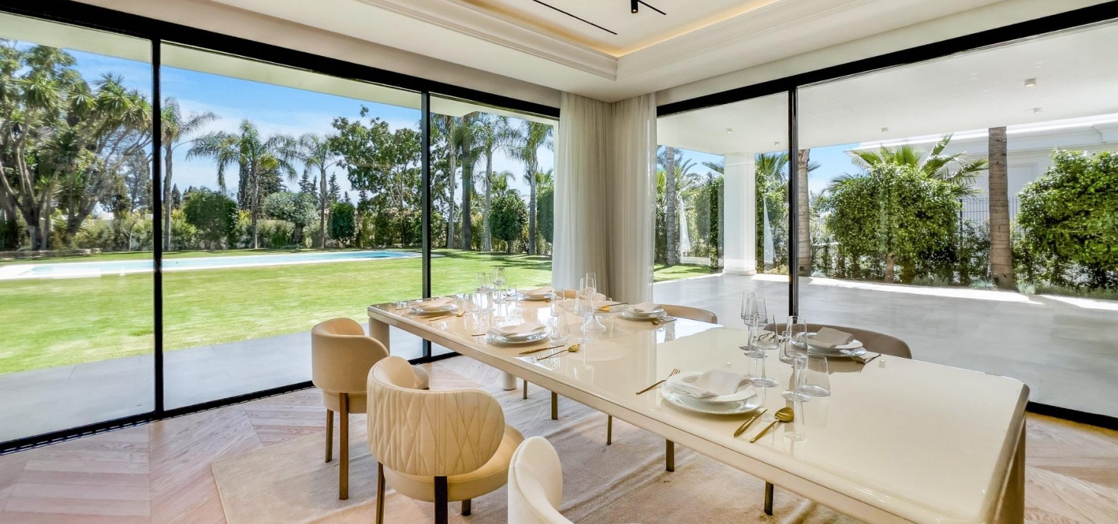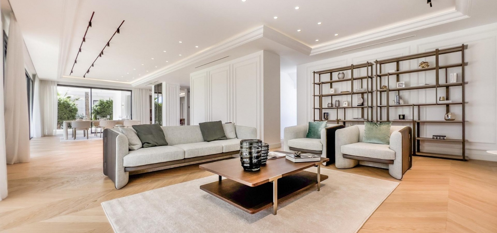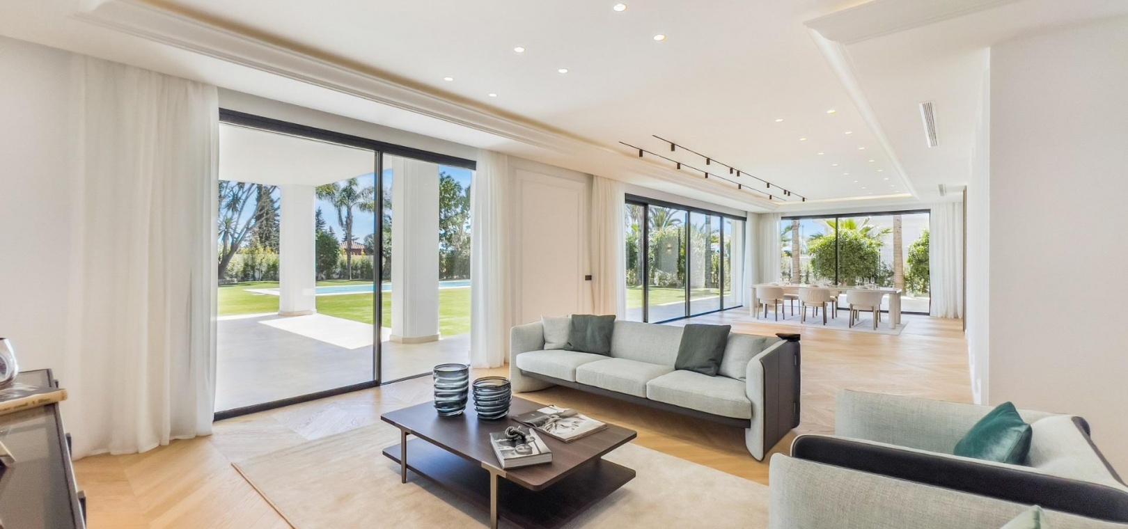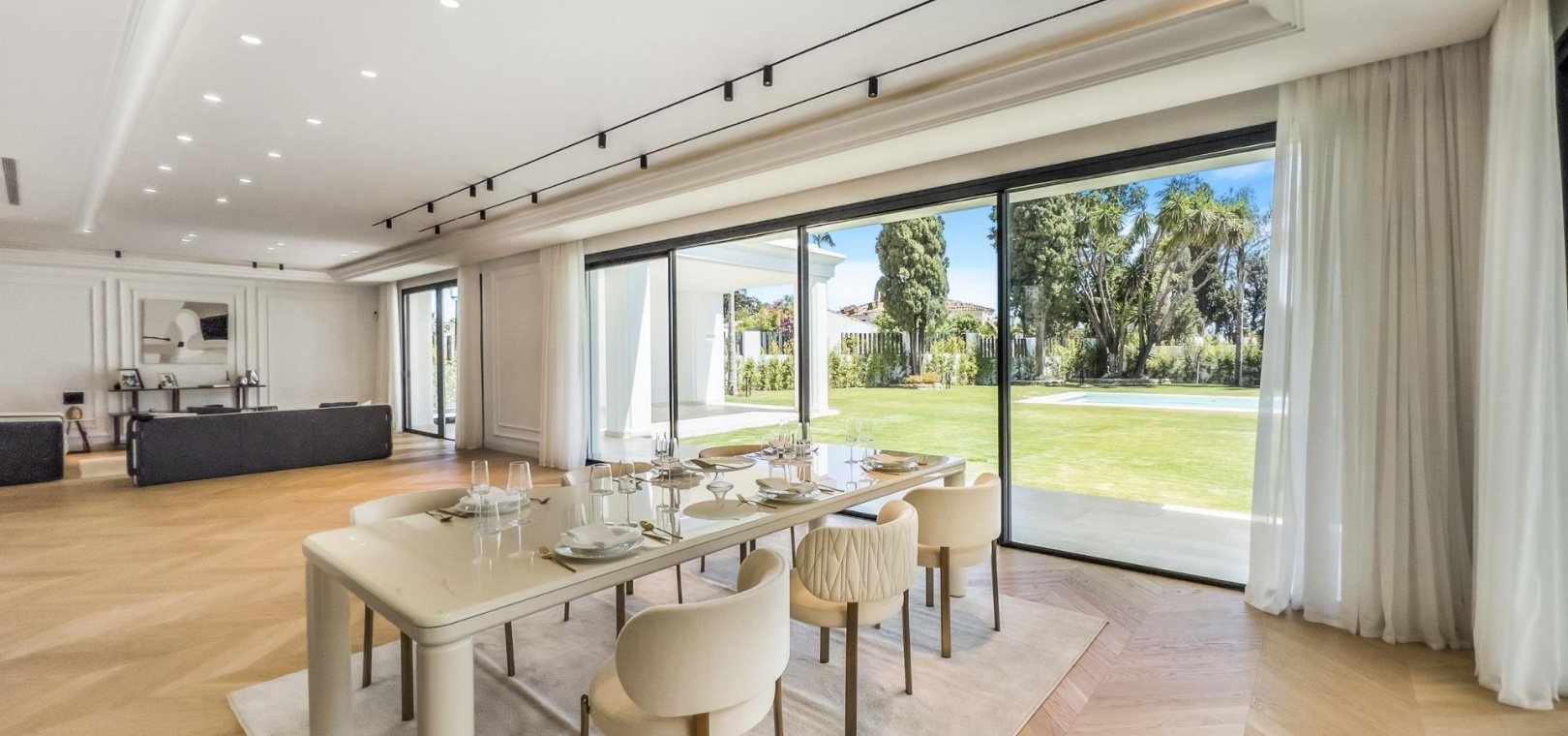 Wenn man die Villa betritt, findet man im Hauptgeschoss einen großen Raum, der in mehrere Bereiche unterteilt ist. Die voll ausgestattete Küche mit modernsten Geräten verfügt über eine maßgefertigte Insel.