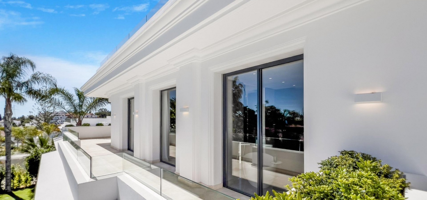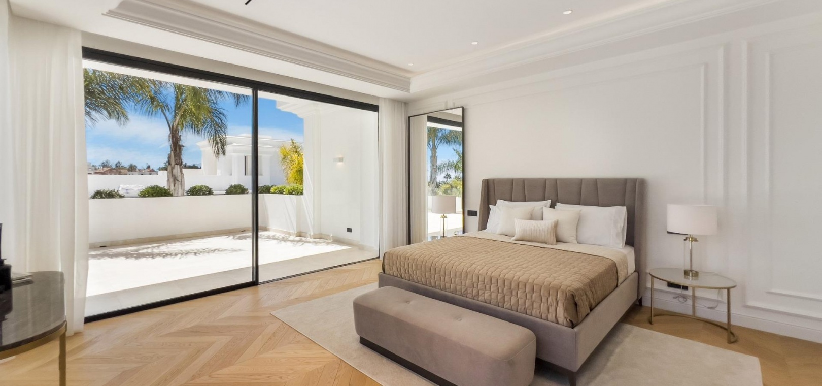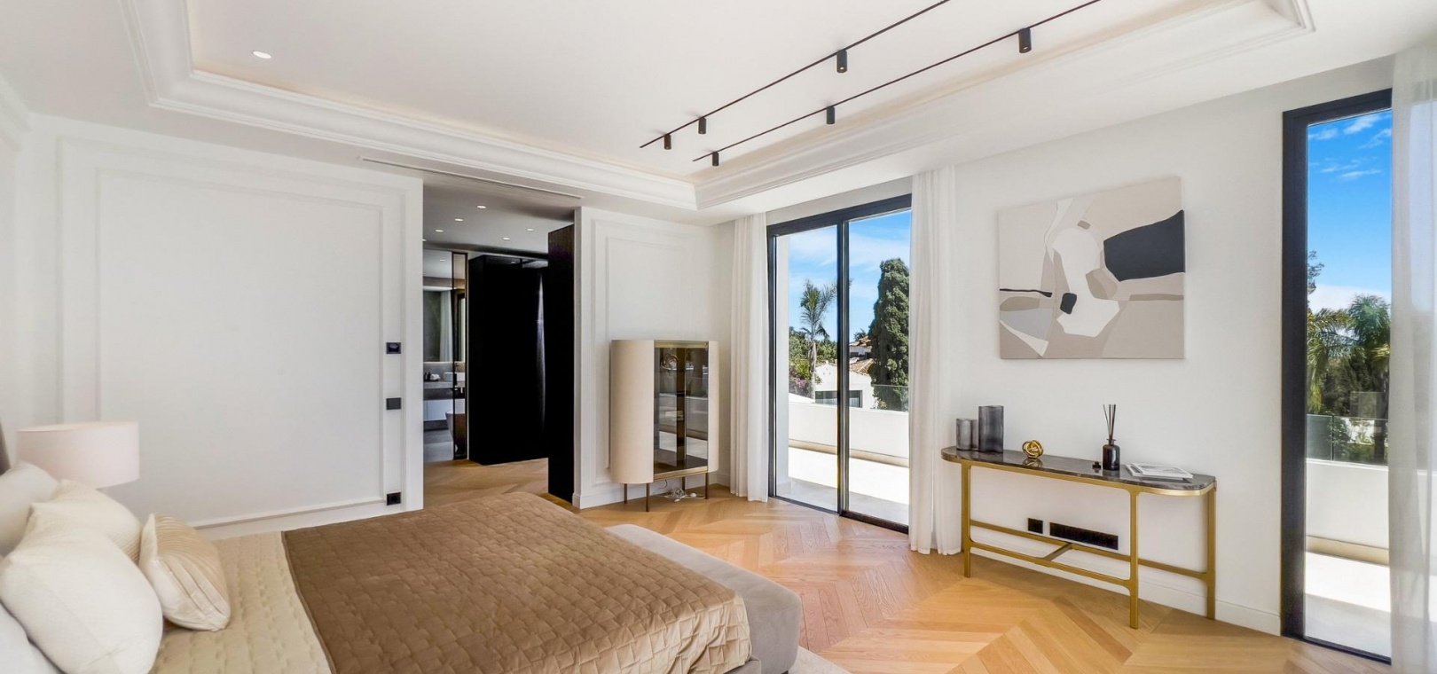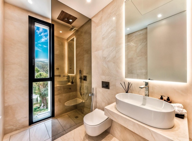 Das Obergeschoss besteht aus 3 Schlafzimmern mit Bädern und Ankleideräumen en-suite. Das Hauptschlafzimmer mit Zugang zur großen Terrasse bietet einen spektakulären Blick auf den Pool und das Meer.