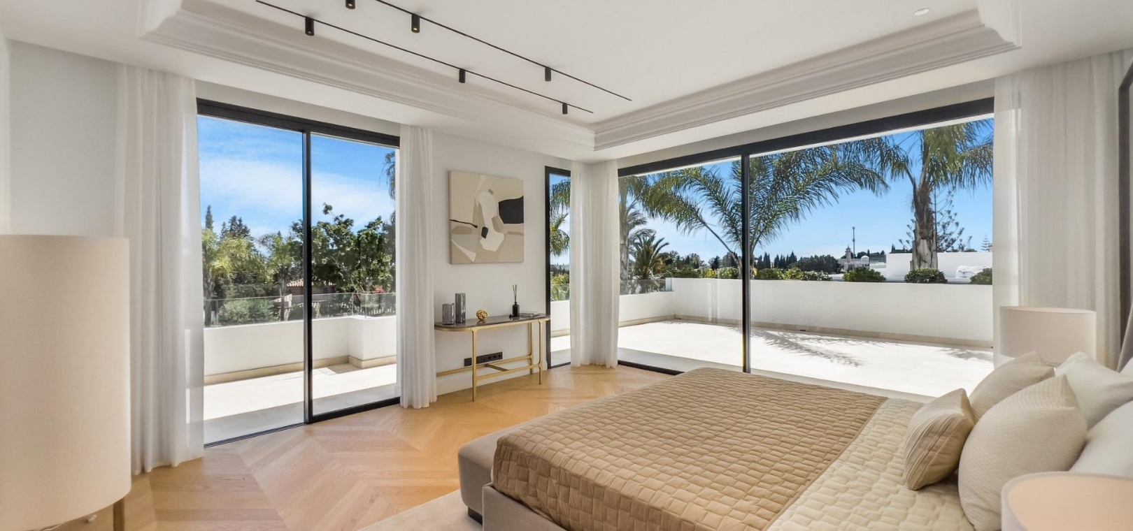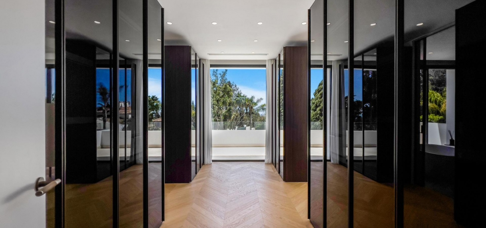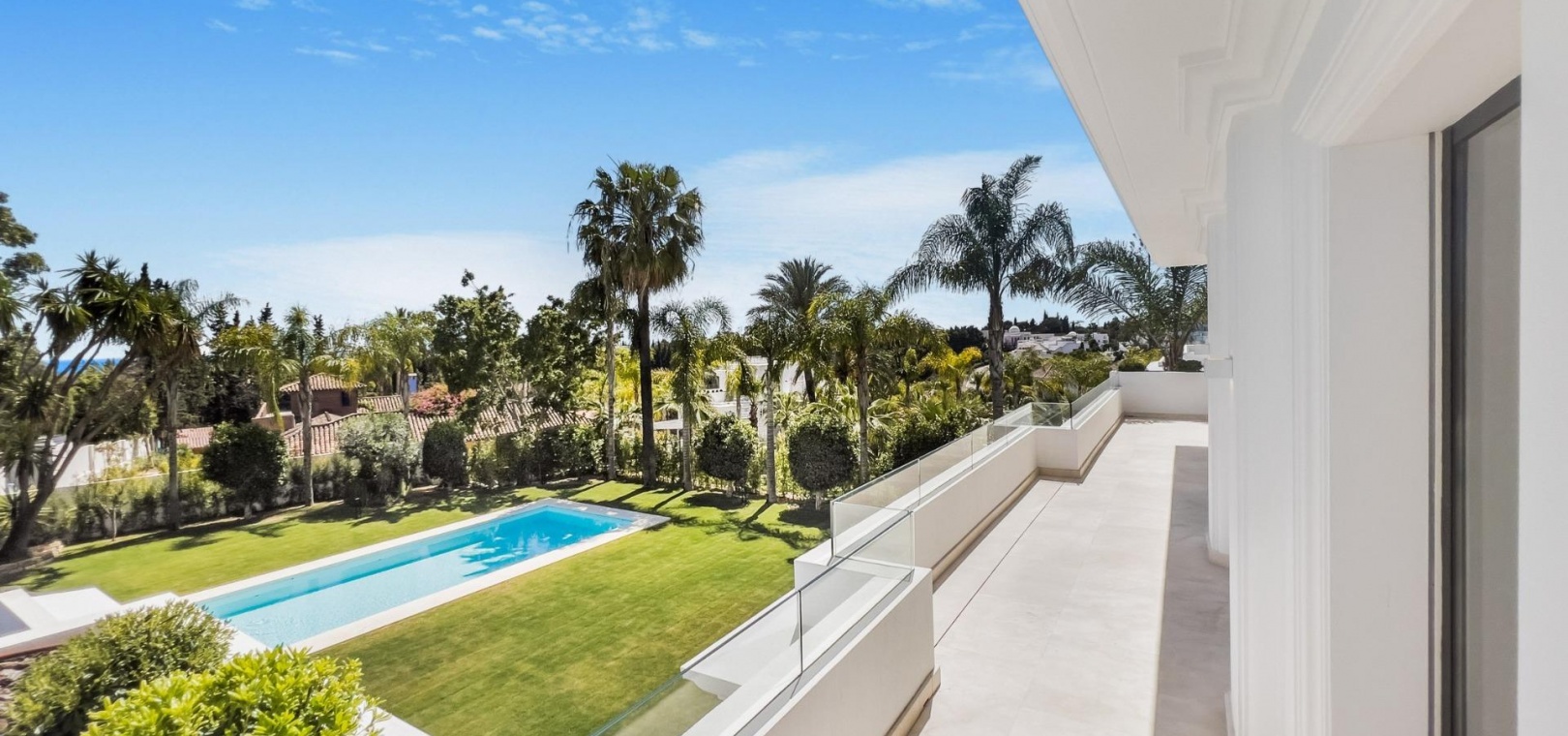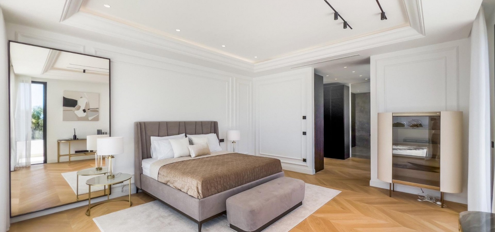 Das Obergeschoss besteht aus 3 Schlafzimmern mit Bädern und Ankleideräumen en-suite. Das Hauptschlafzimmer mit Zugang zur großen Terrasse bietet einen spektakulären Blick auf den Pool und das Meer.