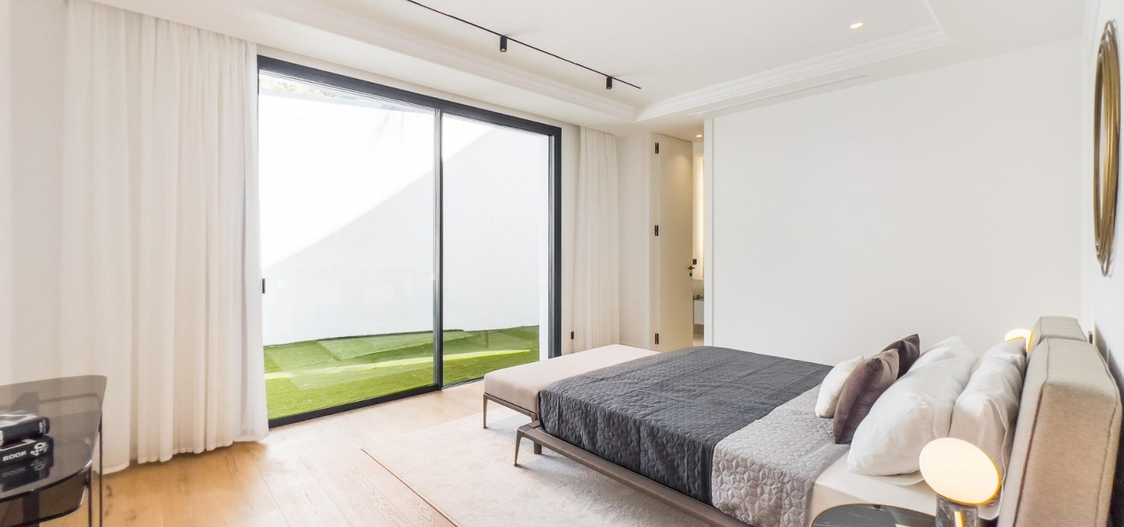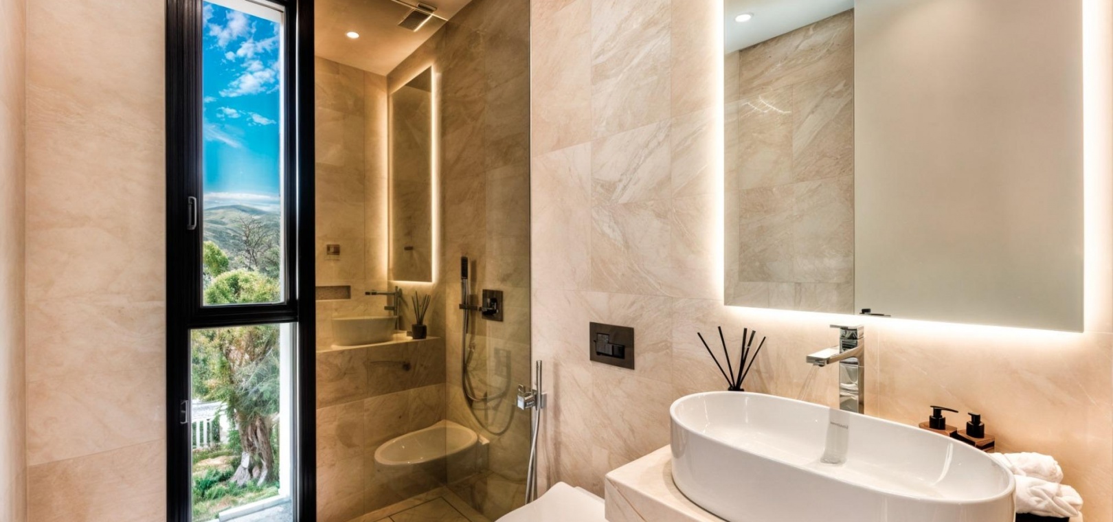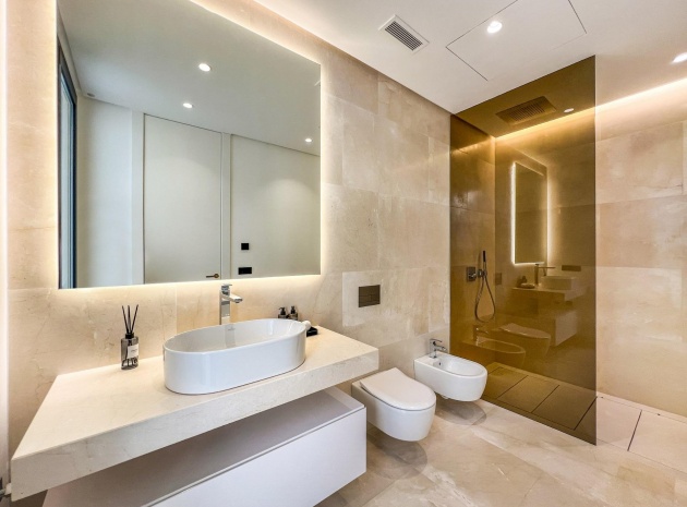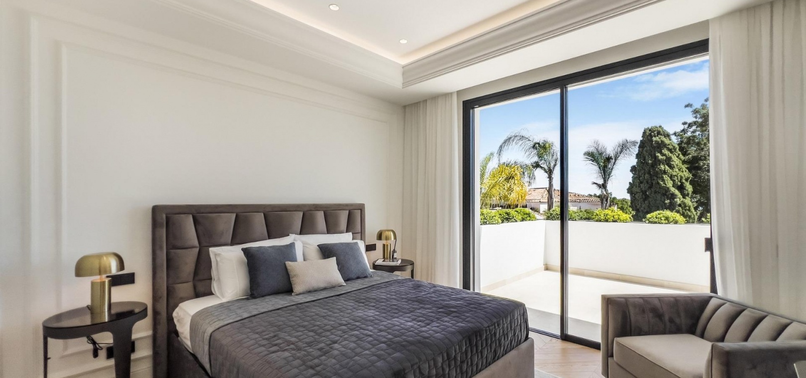 Das Obergeschoss besteht aus 3 Schlafzimmern mit Bädern und Ankleideräumen en-suite. Das Hauptschlafzimmer mit Zugang zur großen Terrasse bietet einen spektakulären Blick auf den Pool und das Meer.