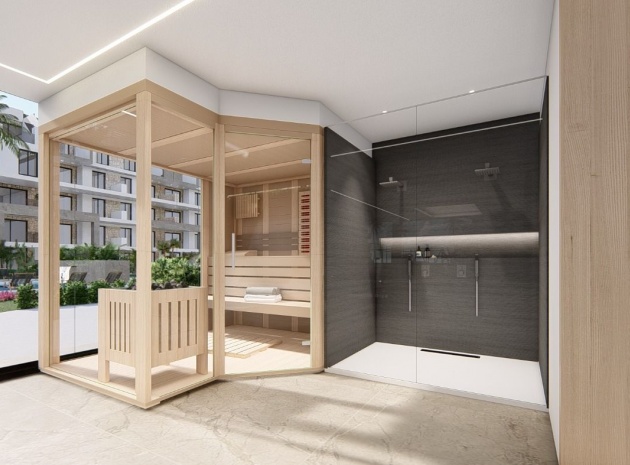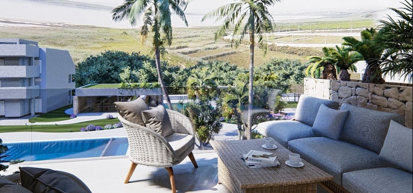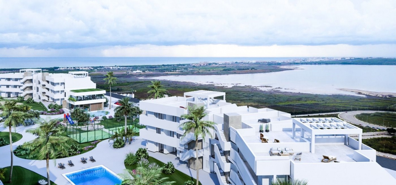 Wunderschöne Wohnanlagen, darunter ein verglaster GYM-Spa-Bereich mit Blick auf Grünflächen, Swimmingpools und von der Terrasse aus auf die Salzlagune von La Mata, Paddle-Tennisplatz, etc.