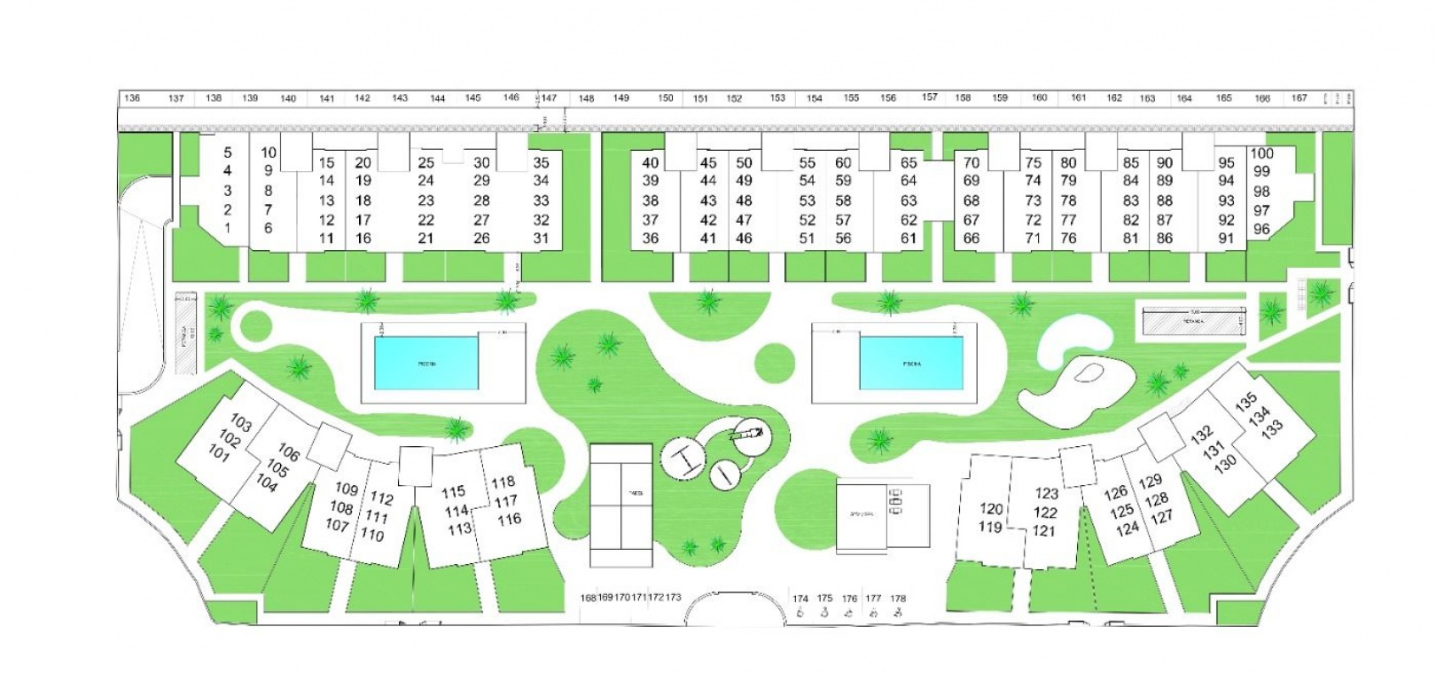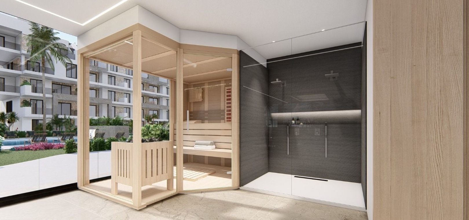 Die Anlage besteht aus 135 Wohnungen mit 2 oder 3 Schlafzimmern in Blöcken mit 3 oder 5 Etagen plus Solarium, die minimalistisch und mit hohen Qualitätsstandards entworfen wurden. Die moderne Architektur harmoniert mit unseren großen Freiflächen, der Natur und den Swimmingpools und bietet eine einzigartige und ruhige Atmosphäre.
