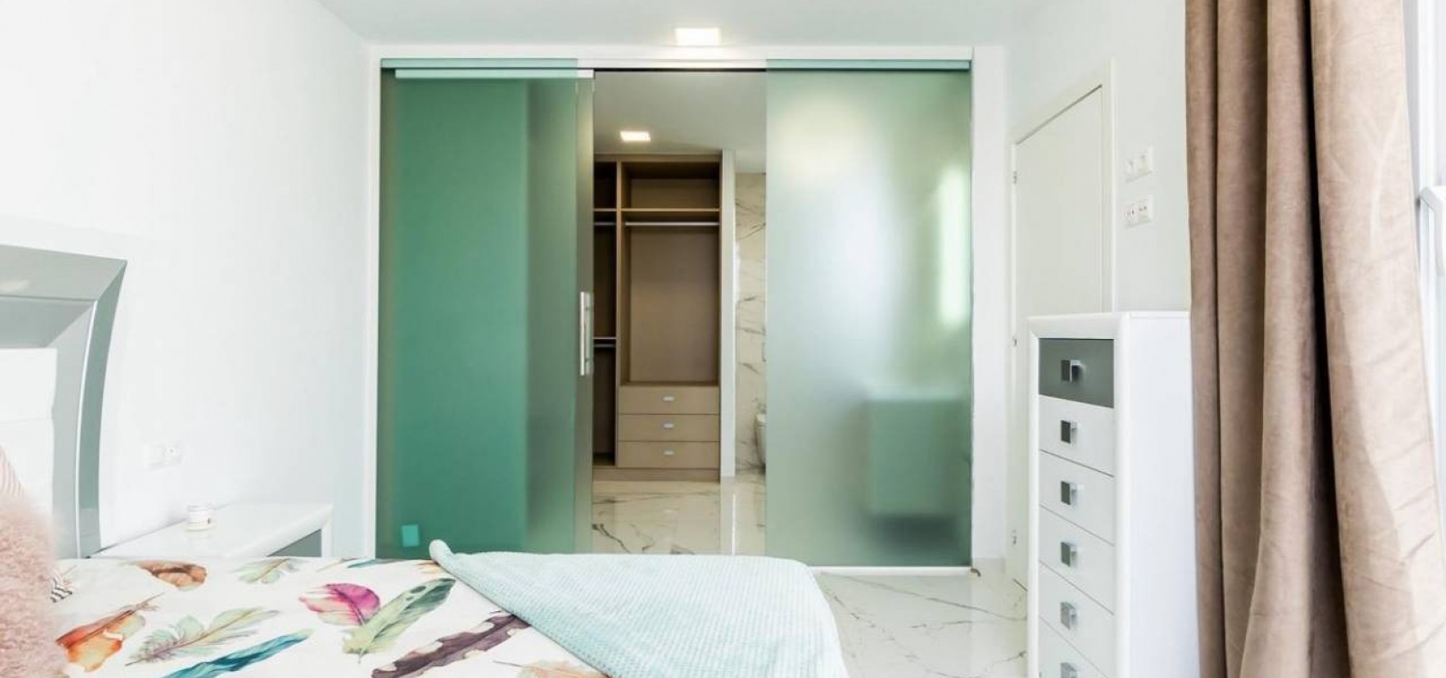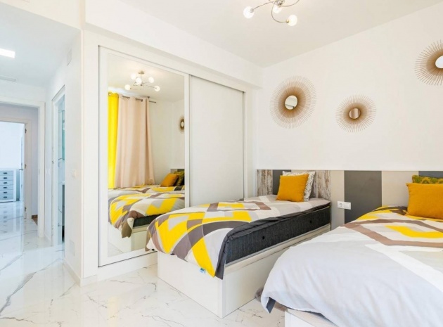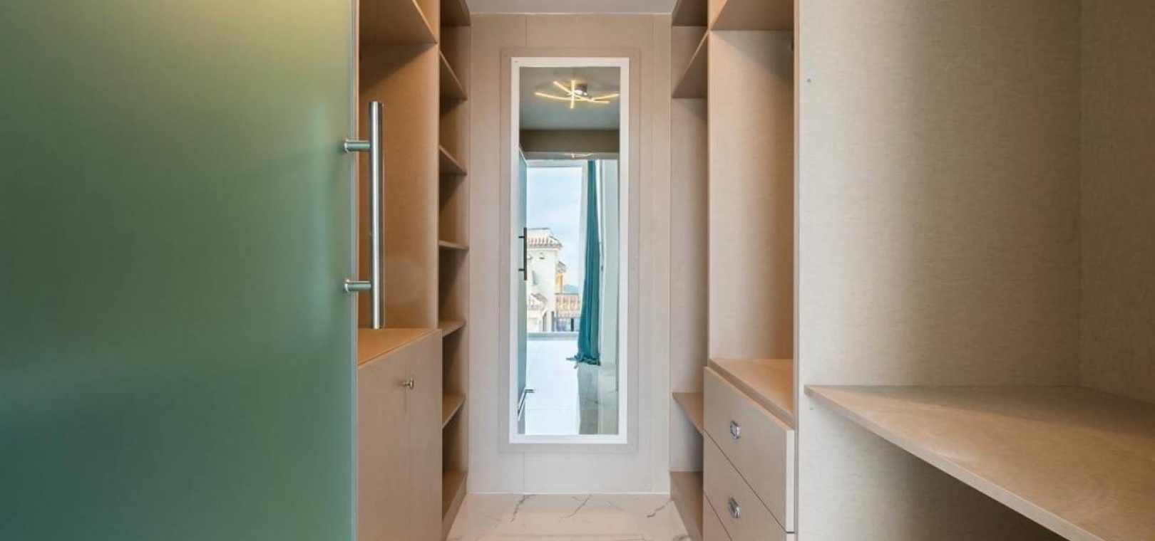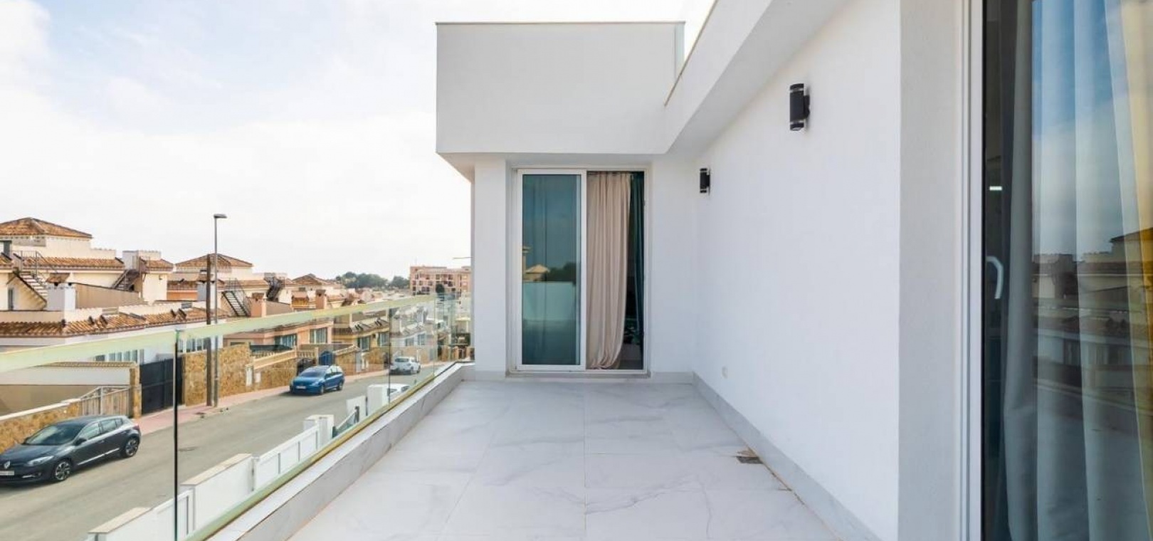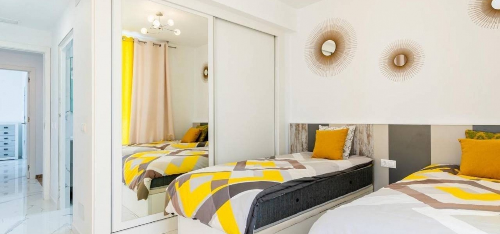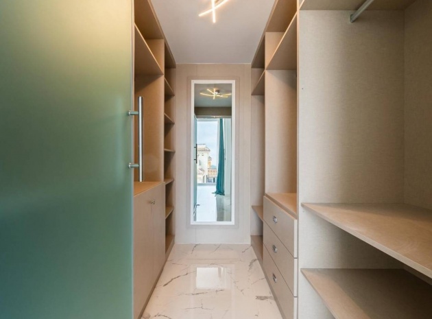 Im ersten Stock befindet sich ein atemberaubendes Hauptschlafzimmer mit begehbarem Kleiderschrank, eigenem Bad und Zugang zu einer privaten oberen Sonnenterrasse. Ein weiteres Doppelzimmer mit Einbauschränken verfügt ebenfalls über ein eigenes Bad und privaten Zugang zur Terrasse. Die Innentreppe der Villa führt zu einem geräumigen, 28 m² großen Solarium auf dem Dach, das einen atemberaubenden Blick auf das Meer in der Ferne und den ganzen Tag Sonnenschein bietet – perfekt zum Entspannen im Freien oder zum Unterhalten.