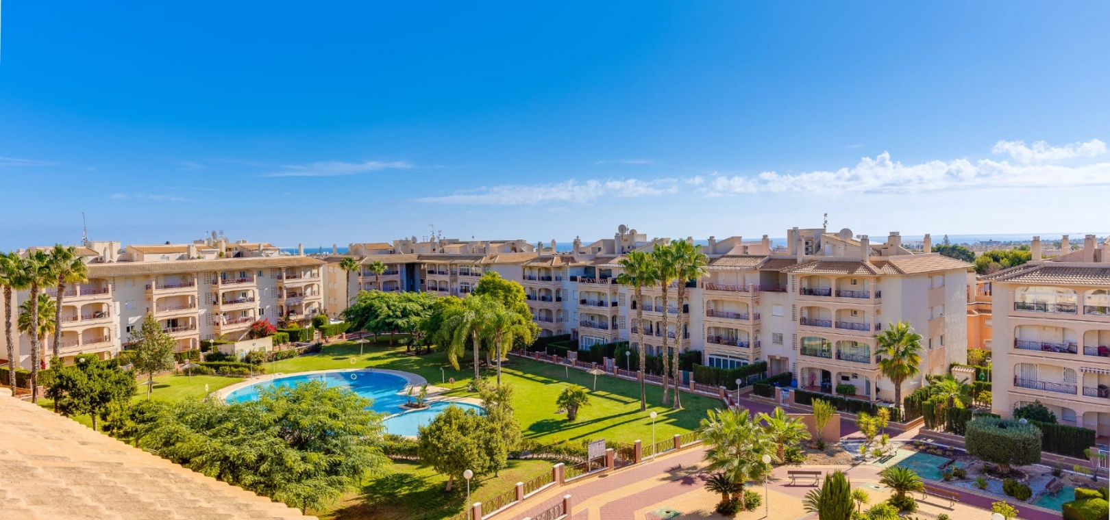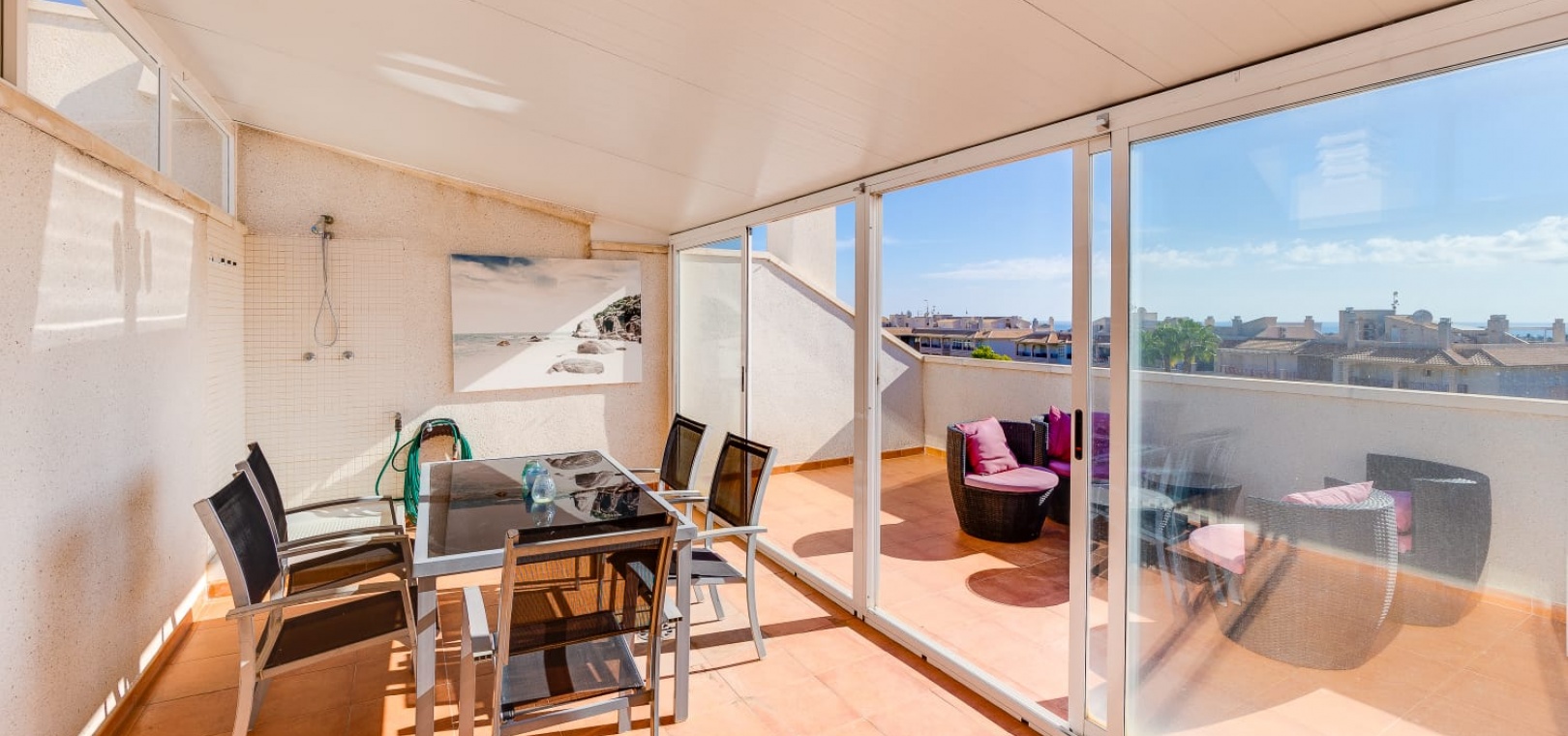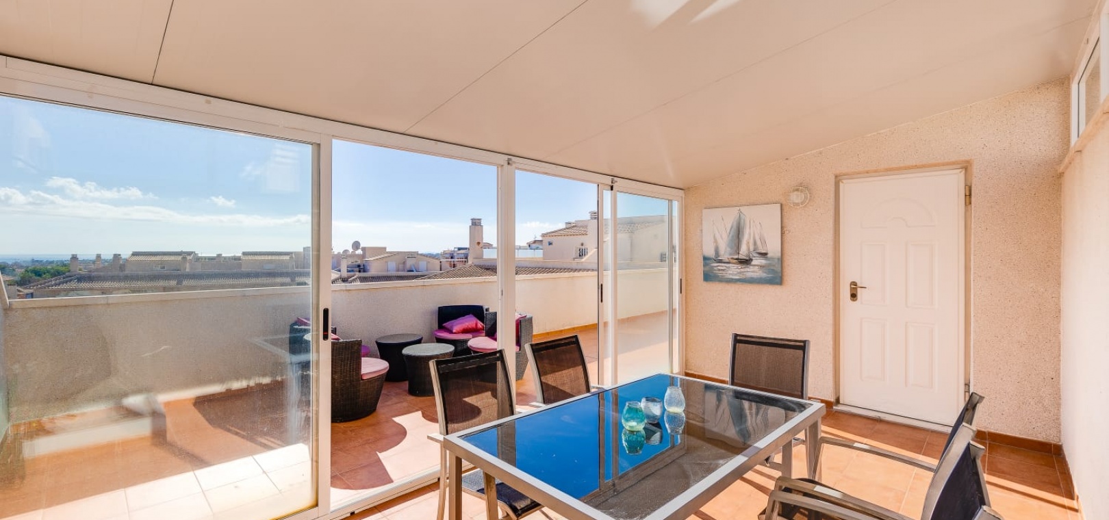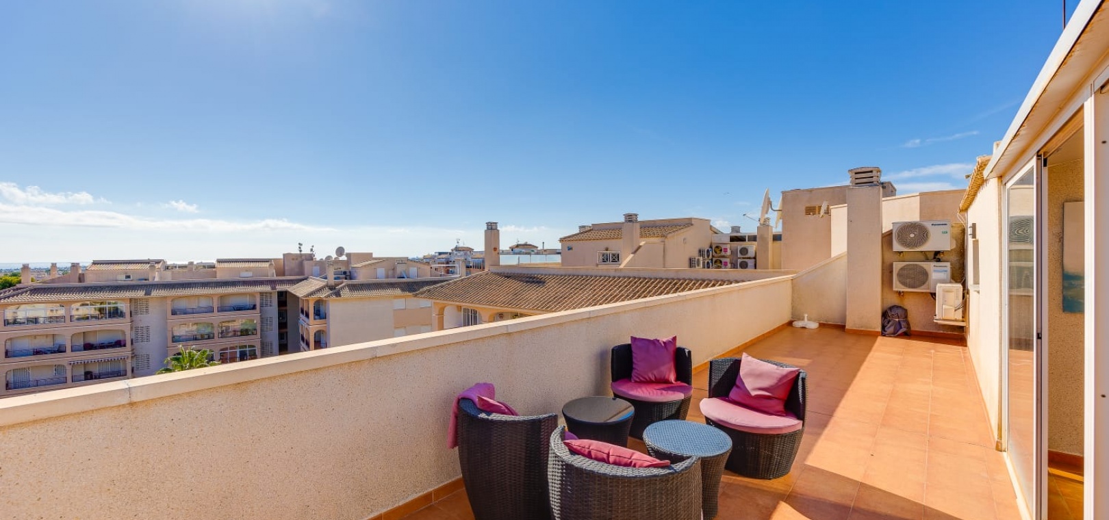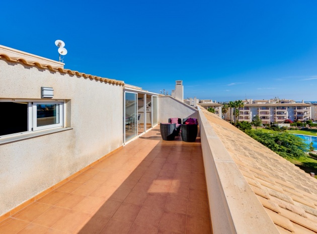 Eine nach Süden ausgerichtete Dachgeschosswohnung mit 3 Schlafzimmern und 2 Bädern und privatem Solarium auf dem Dach in Res Laguna Green, Playa Flamenca, Costa Blanca.