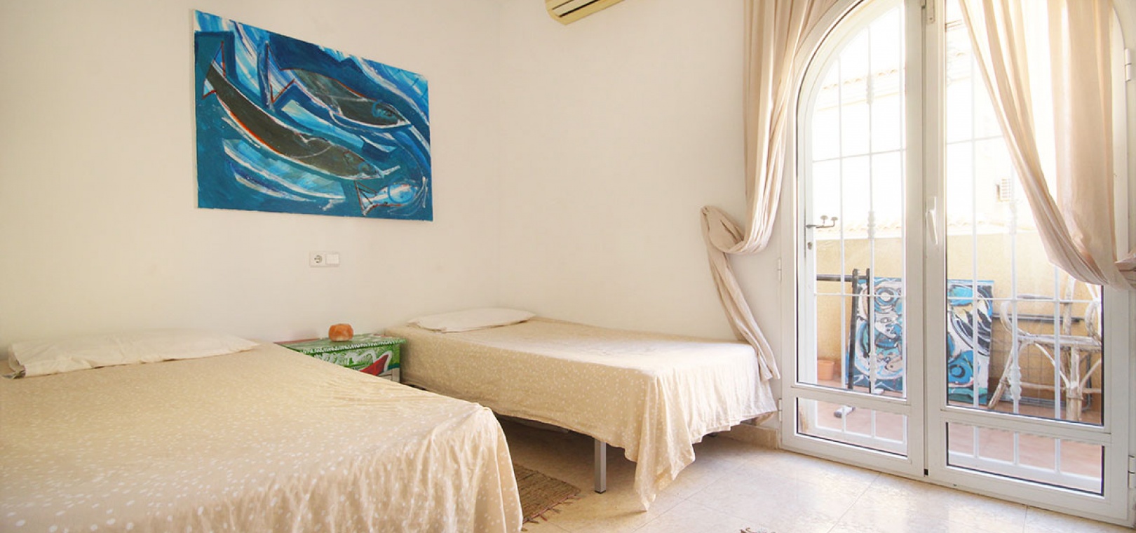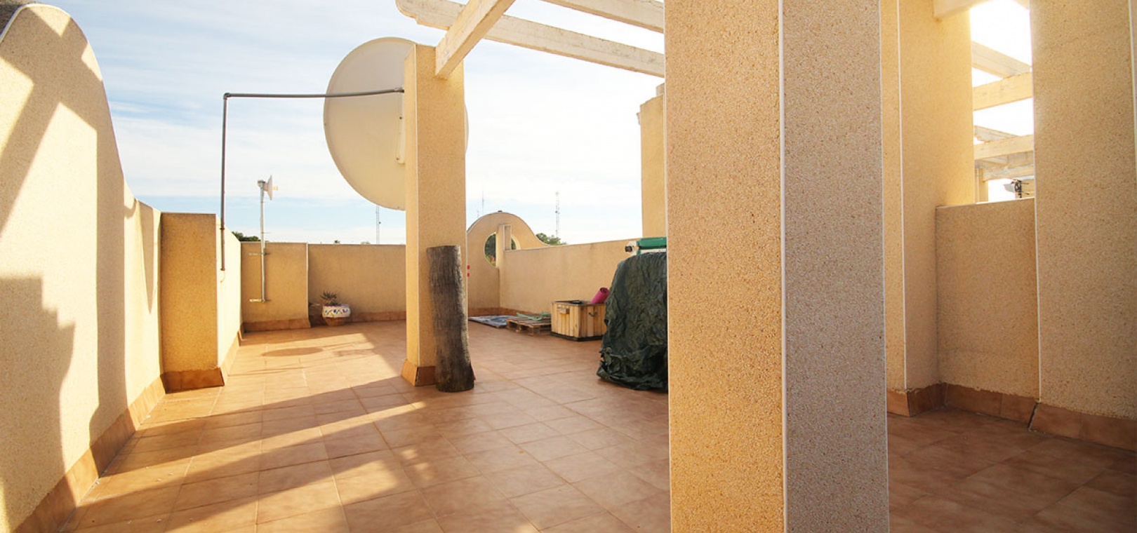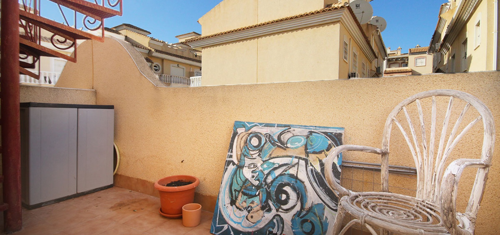 Auf der 2. Etage befinden sich 2 Doppelzimmer, das Hauptschlafzimmer hat Einbauschränke, 1 Familienbadezimmer, einen Balkon auf der Rückseite mit Außentreppe hinauf zum großen privaten Solarium auf dem Dach.