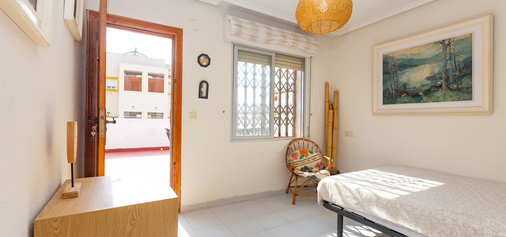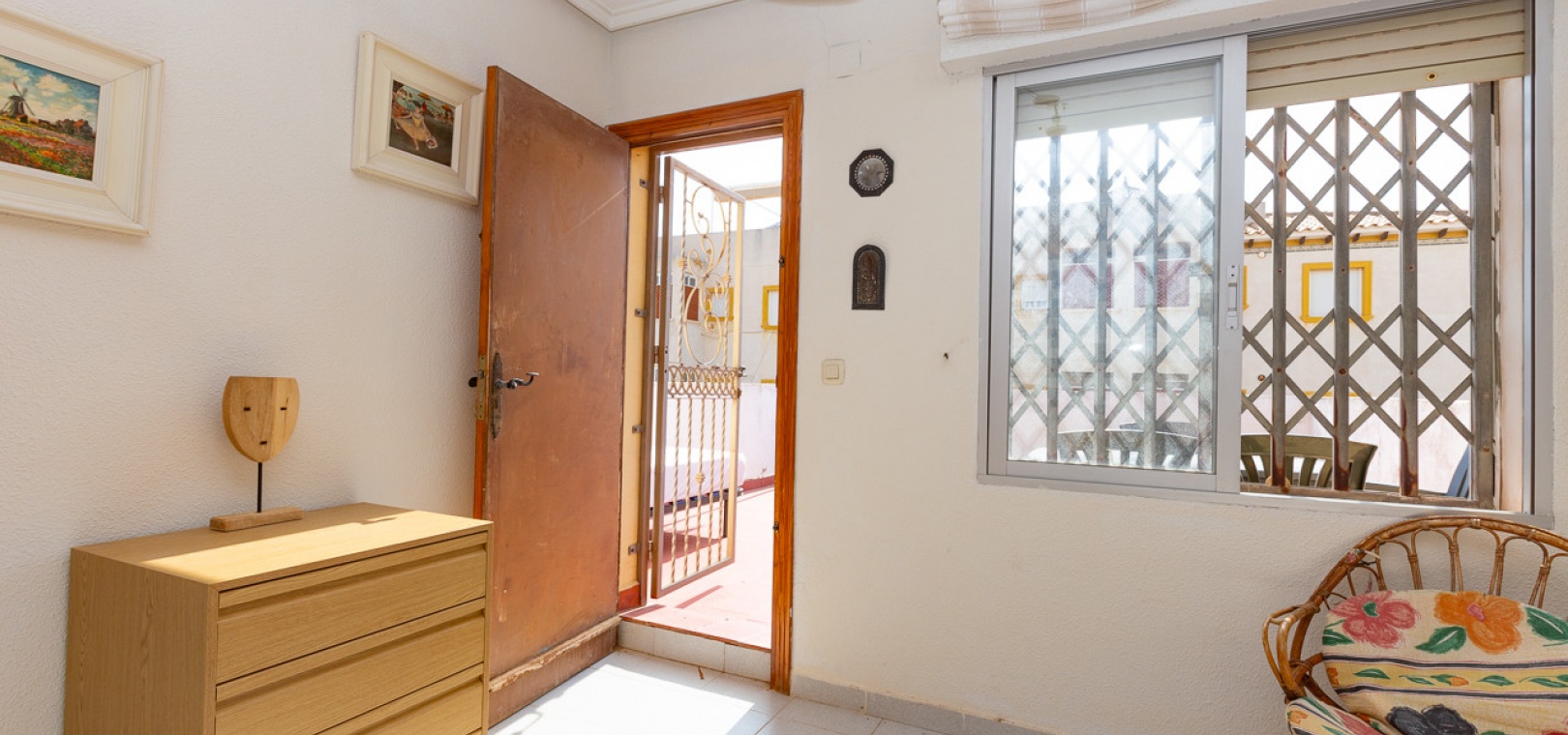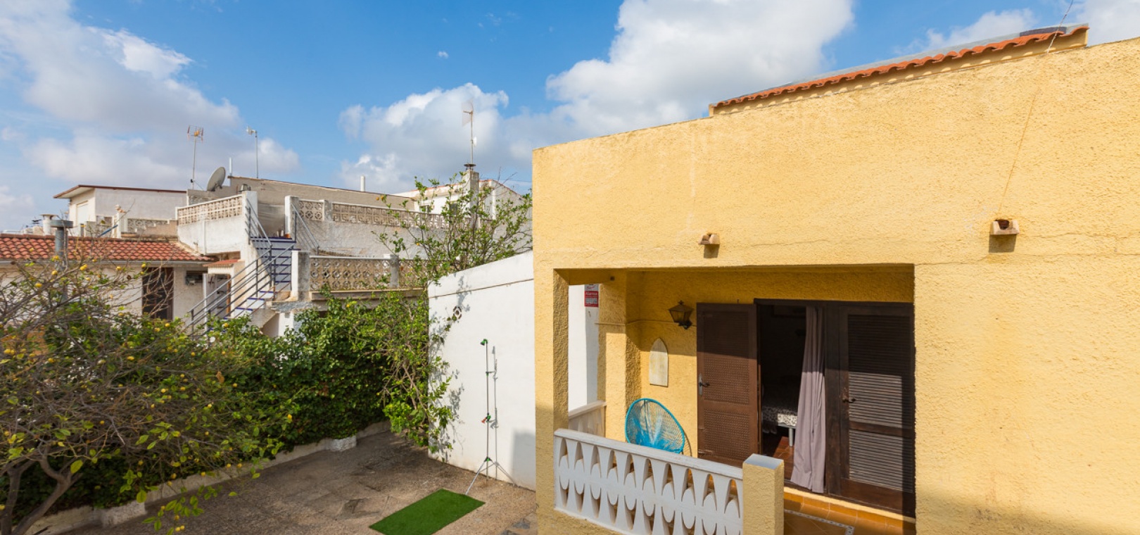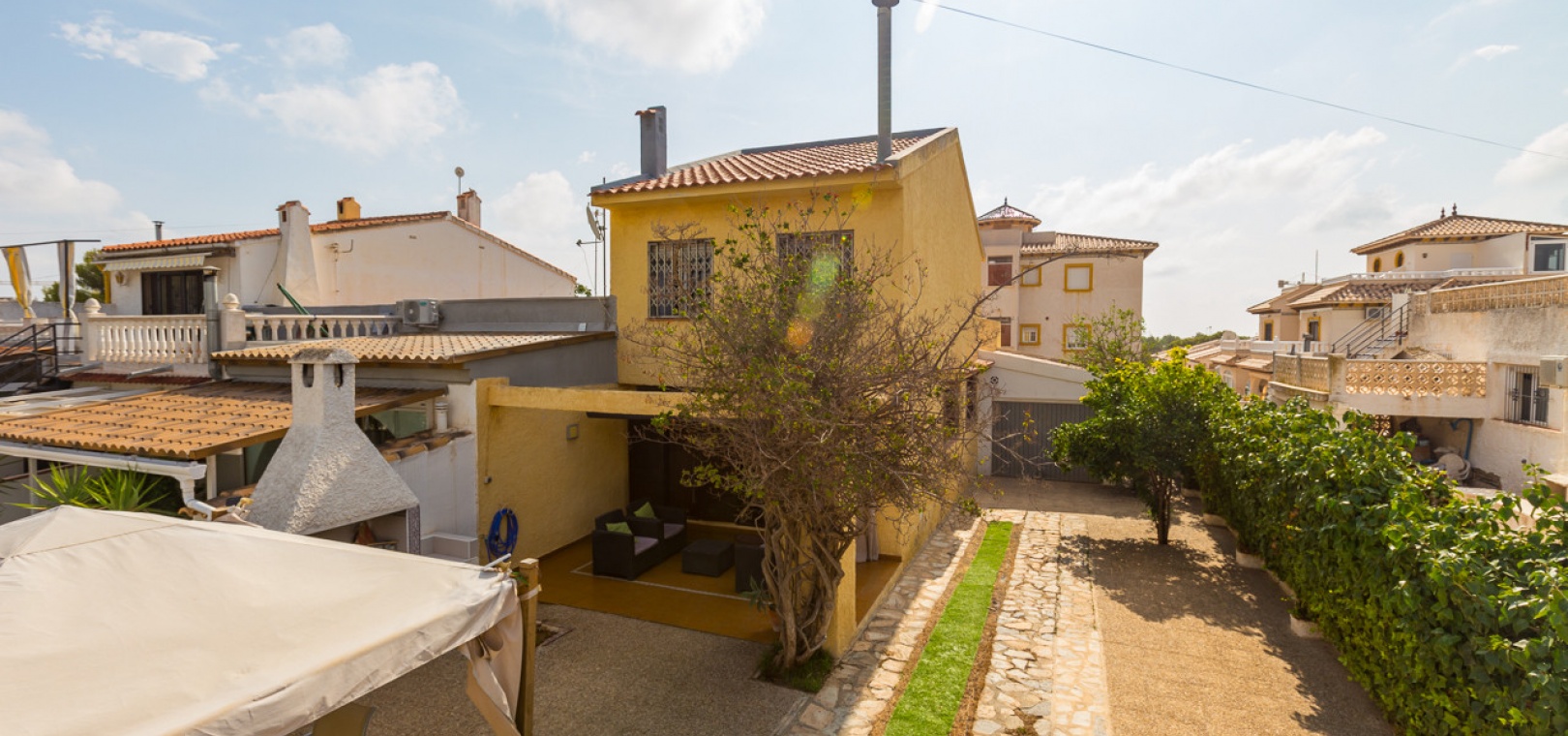Im Erdgeschoss bietet das Anwesen zwei Badezimmer und drei Schlafzimmer, von denen zwei direkten Zugang zu einer Terrasse haben, auf der Sie die Aussicht und die frische Luft genießen können. Im Obergeschoss finden Sie zwei weitere Schlafzimmer, einen zusätzlichen Wohnbereich und ein WC sowie Zugang zu einer weiteren Terrasse. Die Villa verfügt außerdem über eine private Garage, die Ihr Fahrzeug ideal vor der intensiven Sommersonne schützt und zusätzlichen Stauraum bietet. An der Vorderseite des Hauses befindet sich ein großer Garten mit Pavillon, der sich perfekt für Mahlzeiten im Freien mit Familie und Freunden eignet. Im hinteren Garten sorgen ein üppiger Zitronenbaum und eine Außendusche für Frische und Funktionalität. Das Anwesen liegt nur wenige Autominuten von mehreren Supermärkten und 3,1 km vom Strand Aguamarina in Cabo Roig entfernt, einem der besten der Gegend. Diese Doppelhaushälfte ist perfekt für eine große Familie oder für einen Investor, der seinen eigenen Raum an der Orihuela Costa individuell gestalten möchte. Das Anwesen würde in einigen Bereichen von einer weiteren Modernisierung profitieren, was sich im Preis für dieses sehr geräumige Haus widerspiegelt.