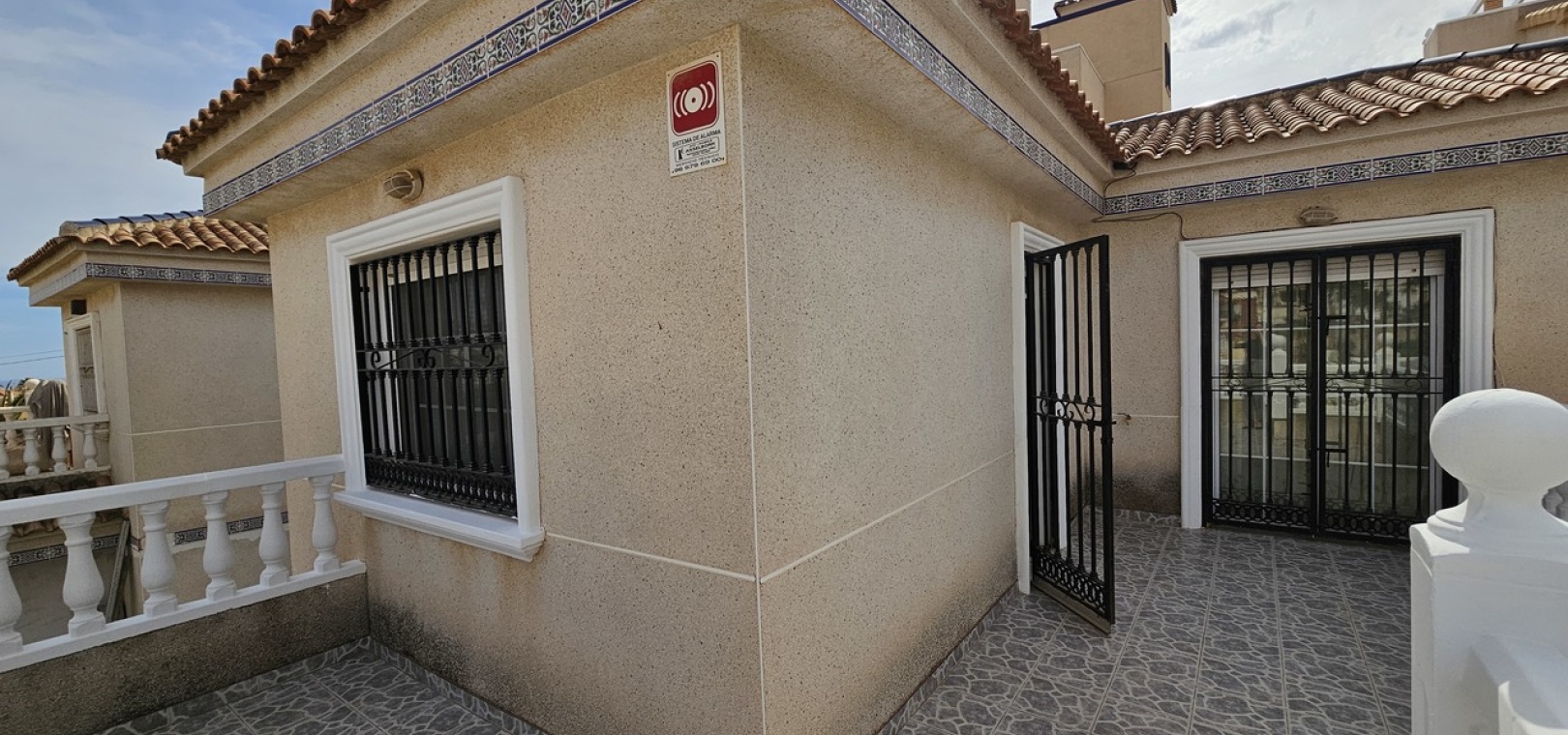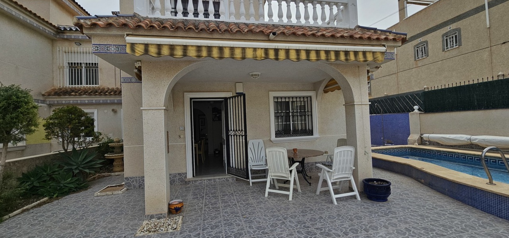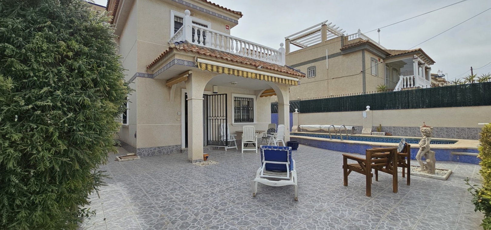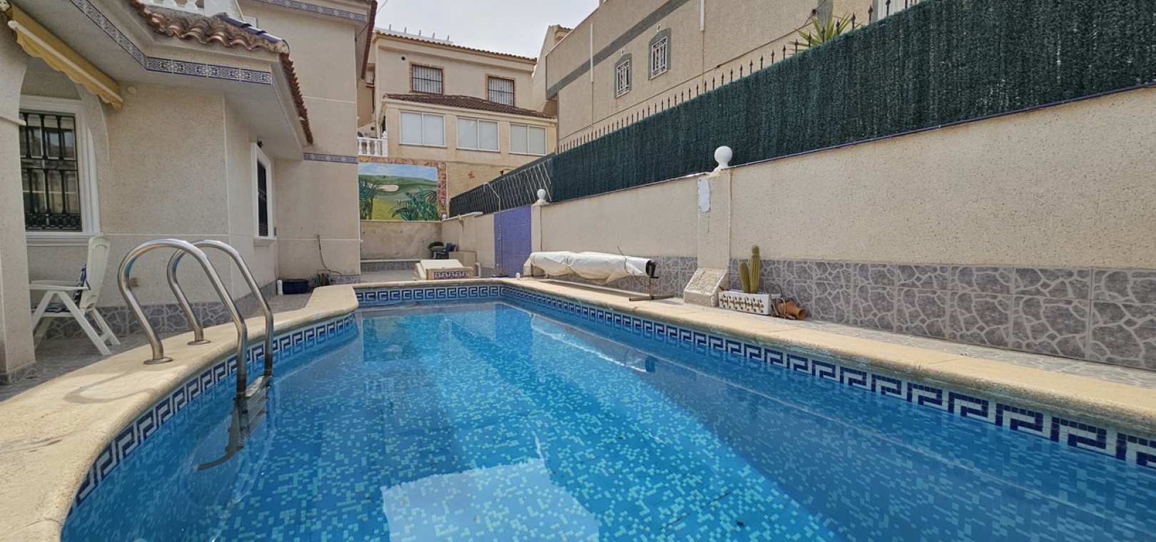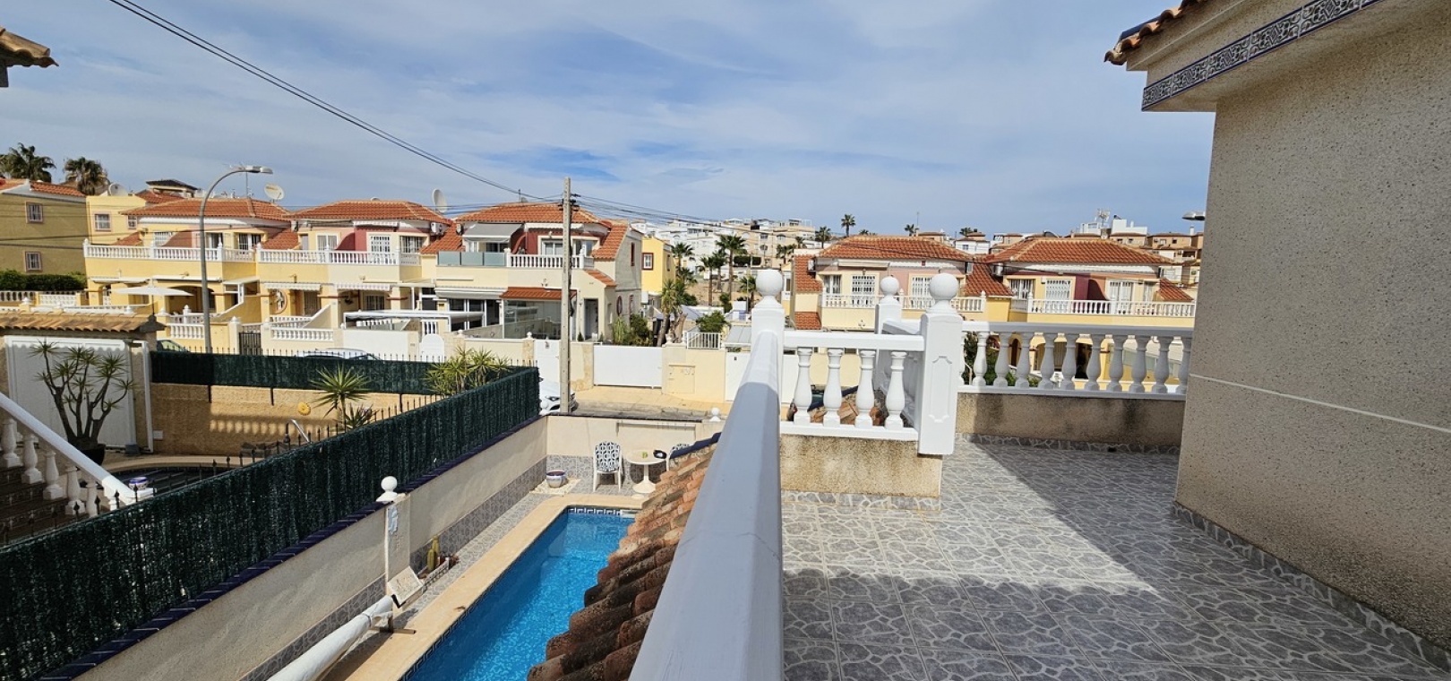 Sehr geräumige Reihenvilla mit 4 Schlafzimmern und 2 Bädern zum Verkauf in El Galan, nur einen Steinwurf und einen kurzen Spaziergang von Villamartin und allen Annehmlichkeiten entfernt, darunter zahlreiche Restaurants und Lebensmittelgeschäfte, der Golfplatz von Villamartin und The Plaza zusammen mit dem Einkaufszentrum La Fuente, Supermärkten und Weinbars. Diese Villa erstreckt sich über zwei Ebenen und liegt auf einem großen Grundstück mit privatem Swimmingpool, Parkplatz und Auffahrt abseits der Straße sowie Blick auf das Mittelmeer vom privaten und sonnigen Solarium aus. Im Inneren befindet sich ein riesiges Wohn- und Esszimmer mit zwei Fenstern, die für viel natürliches Licht sorgen. Es gibt eine voll ausgestattete separate Küche mit Zugang zum Hauswirtschaftsraum und einen sehr nützlichen Schuppen auf der Rückseite des Grundstücks. Im Erdgeschoss der Villa befinden sich ein großes Doppelzimmer und ein Gästebadezimmer mit Dusche. Im Obergeschoss befinden sich zwei weitere Doppelzimmer für Gäste (eines mit Zugang zum Solarium), das Familienbadezimmer und ein riesiges Hauptschlafzimmer, das ebenfalls Zugang zum Solarium mit atemberaubendem Blick über das Grundstück und den Swimmingpool und hinaus auf das Meer hat. Diese Immobilie wird voll möbliert wie gesehen mit vielen Extras verkauft, darunter Klimaanlage, Zentralheizung und ein brandneuer Heizkessel.