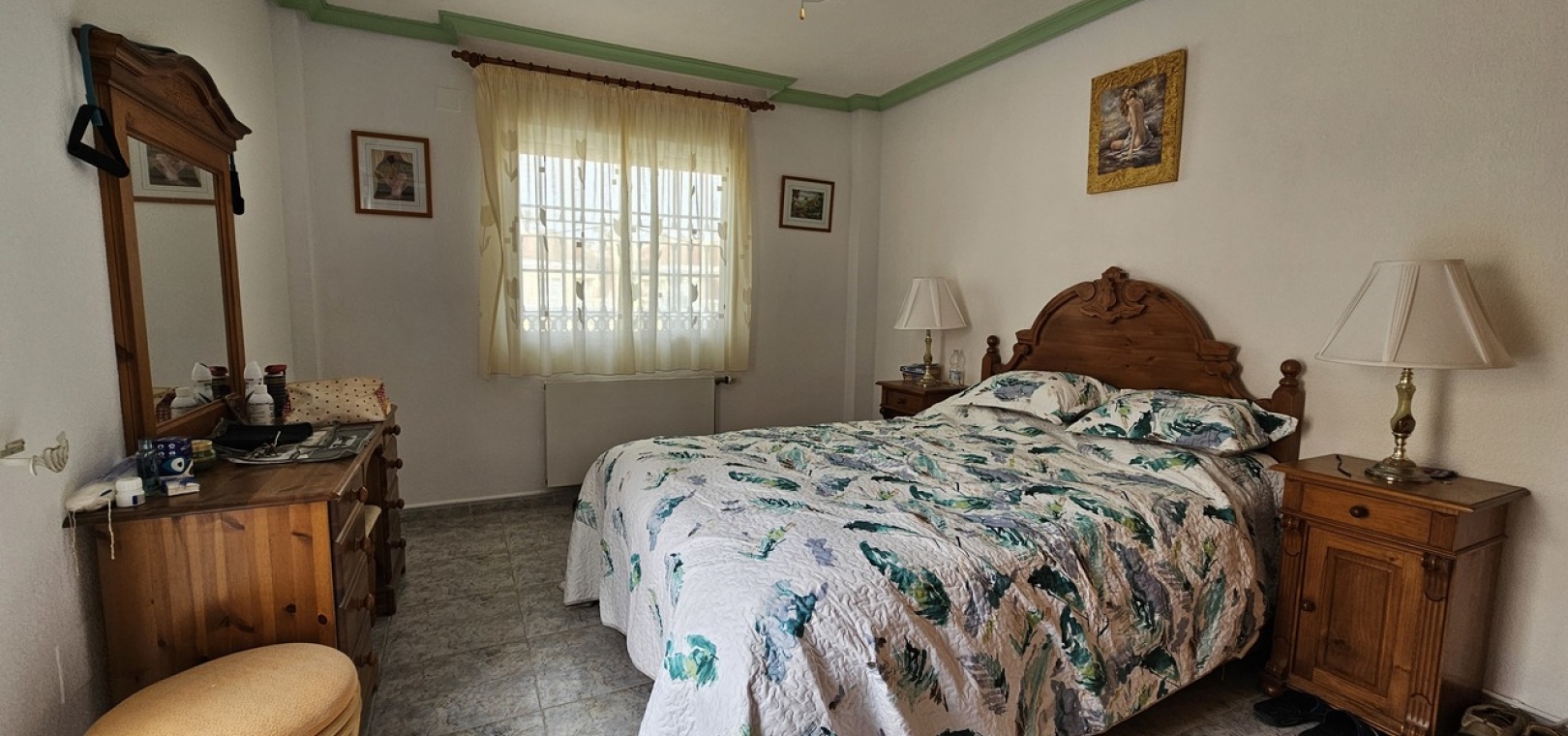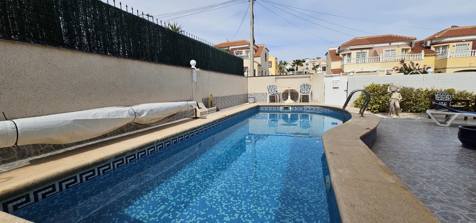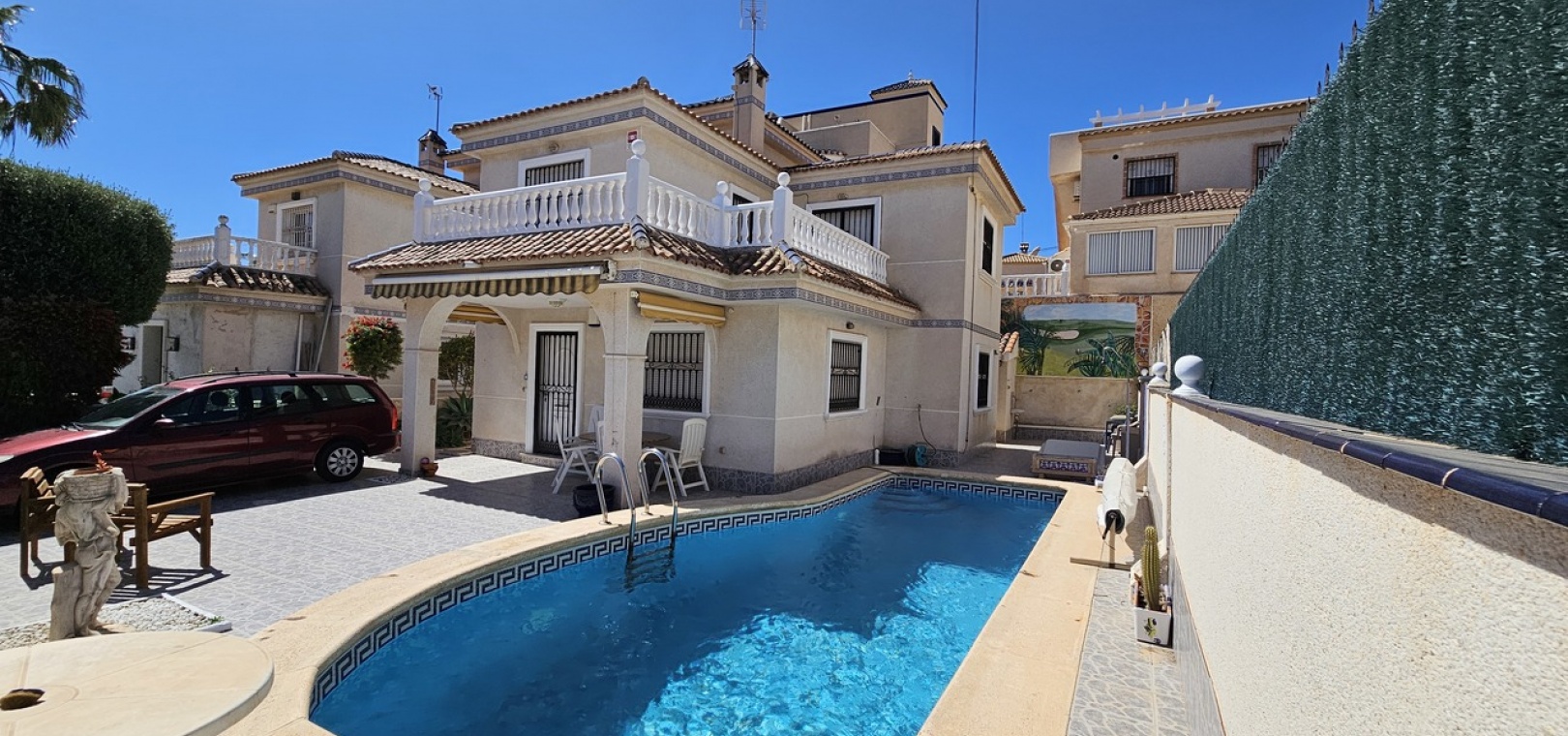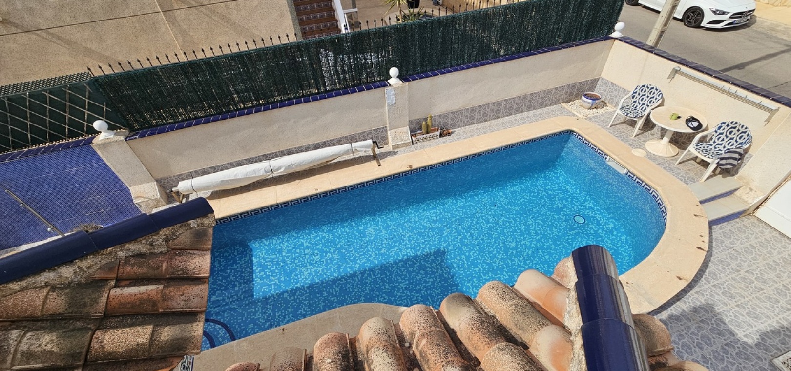 Sehr geräumige Reihenvilla mit 4 Schlafzimmern und 2 Bädern zum Verkauf in El Galan, nur einen Steinwurf und einen kurzen Spaziergang von Villamartin und allen Annehmlichkeiten entfernt, darunter zahlreiche Restaurants und Lebensmittelgeschäfte, der Golfplatz von Villamartin und The Plaza zusammen mit dem Einkaufszentrum La Fuente, Supermärkten und Weinbars. Diese Villa erstreckt sich über zwei Ebenen und liegt auf einem großen Grundstück mit privatem Swimmingpool, Parkplatz und Auffahrt abseits der Straße sowie Blick auf das Mittelmeer vom privaten und sonnigen Solarium aus. Im Inneren befindet sich ein riesiges Wohn- und Esszimmer mit zwei Fenstern, die für viel natürliches Licht sorgen. Es gibt eine voll ausgestattete separate Küche mit Zugang zum Hauswirtschaftsraum und einen sehr nützlichen Schuppen auf der Rückseite des Grundstücks. Im Erdgeschoss der Villa befinden sich ein großes Doppelzimmer und ein Gästebadezimmer mit Dusche. Im Obergeschoss befinden sich zwei weitere Doppelzimmer für Gäste (eines mit Zugang zum Solarium), das Familienbadezimmer und ein riesiges Hauptschlafzimmer, das ebenfalls Zugang zum Solarium mit atemberaubendem Blick über das Grundstück und den Swimmingpool und hinaus auf das Meer hat. Diese Immobilie wird voll möbliert wie gesehen mit vielen Extras verkauft, darunter Klimaanlage, Zentralheizung und ein brandneuer Heizkessel.