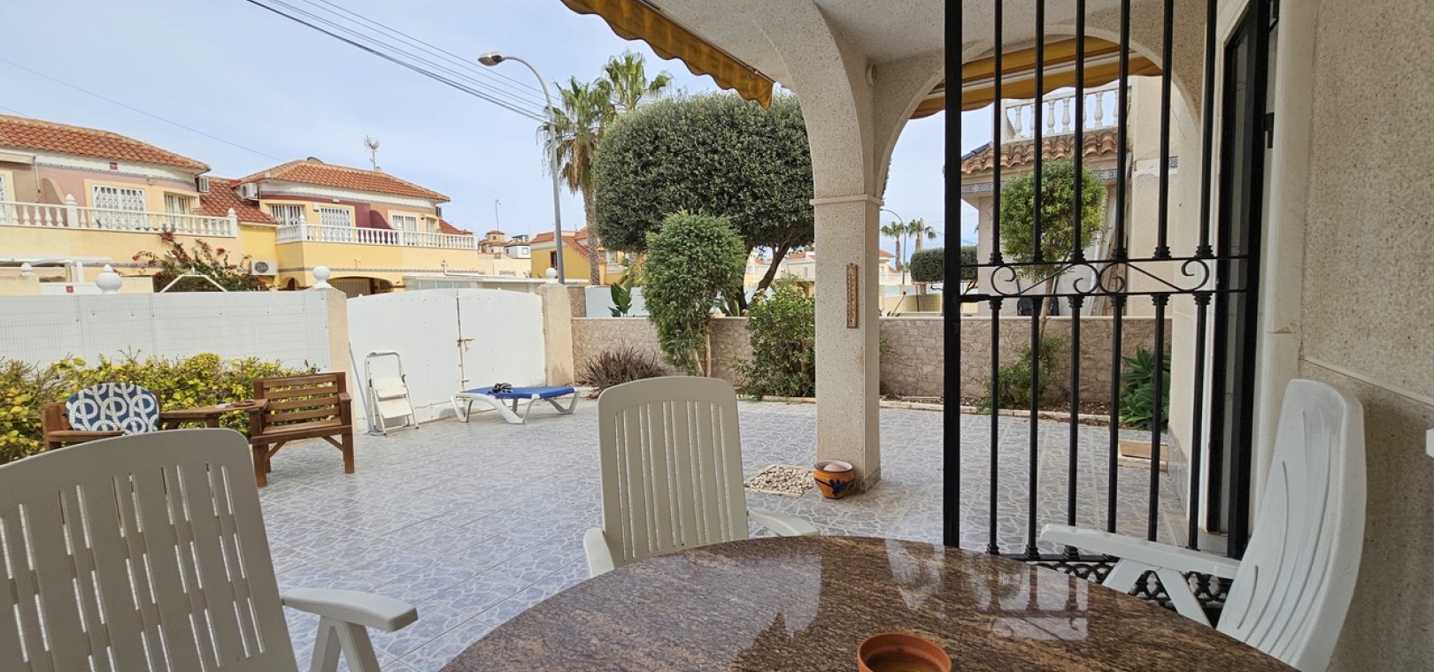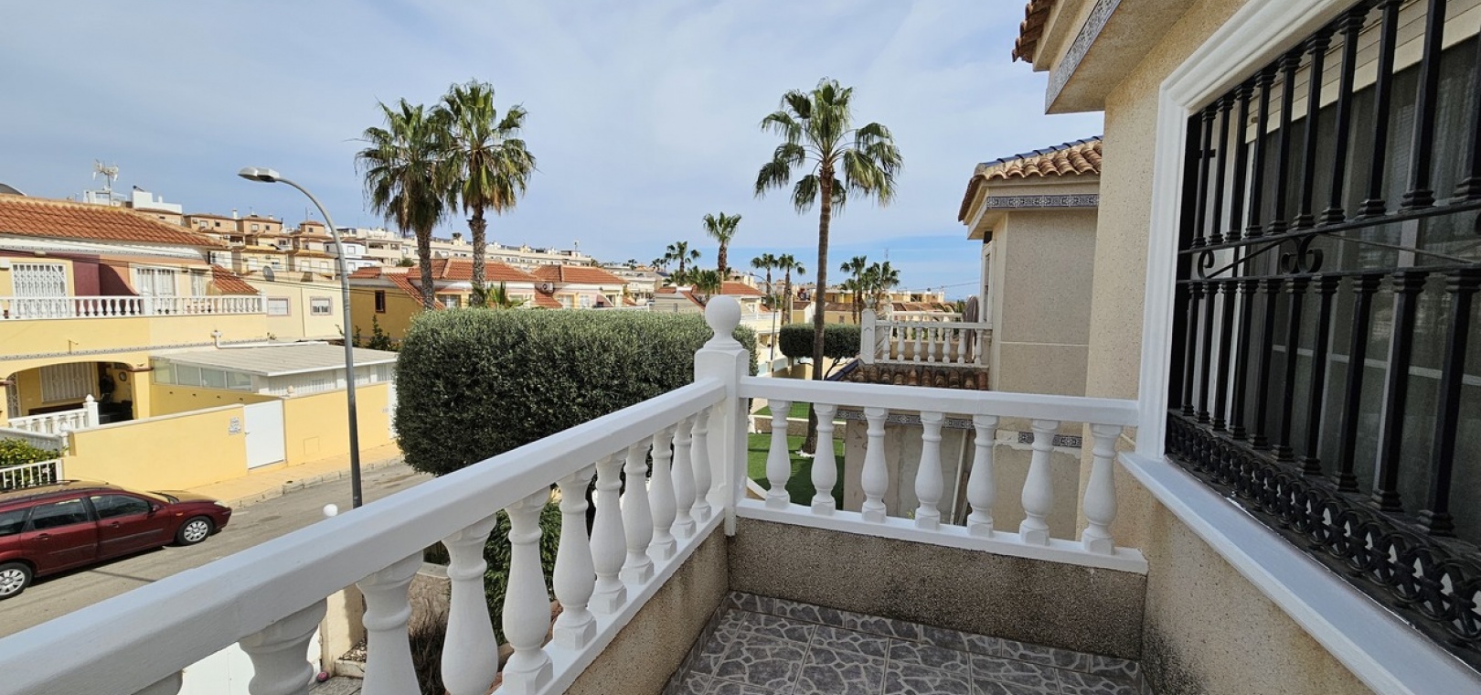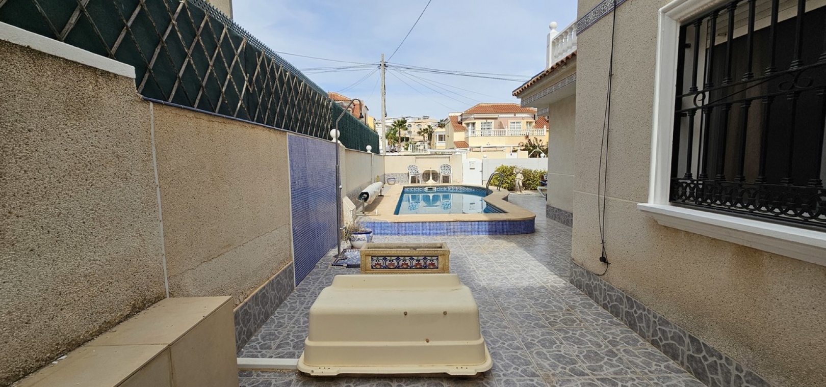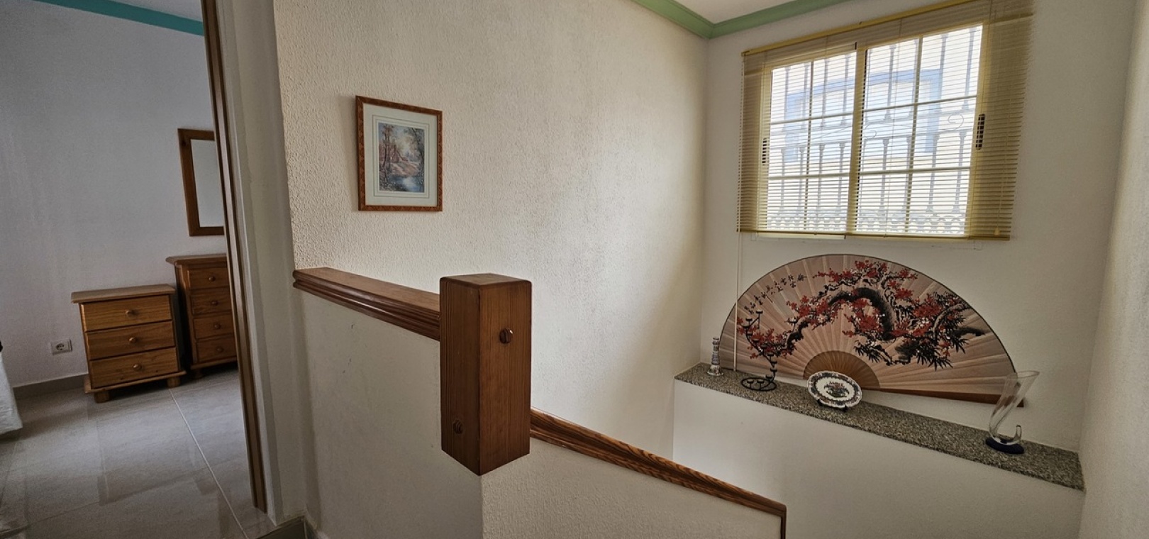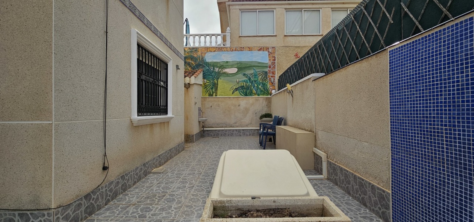 Sehr geräumige Reihenvilla mit 4 Schlafzimmern und 2 Bädern zum Verkauf in El Galan, nur einen Steinwurf und einen kurzen Spaziergang von Villamartin und allen Annehmlichkeiten entfernt, darunter zahlreiche Restaurants und Lebensmittelgeschäfte, der Golfplatz von Villamartin und The Plaza zusammen mit dem Einkaufszentrum La Fuente, Supermärkten und Weinbars. Diese Villa erstreckt sich über zwei Ebenen und liegt auf einem großen Grundstück mit privatem Swimmingpool, Parkplatz und Auffahrt abseits der Straße sowie Blick auf das Mittelmeer vom privaten und sonnigen Solarium aus. Im Inneren befindet sich ein riesiges Wohn- und Esszimmer mit zwei Fenstern, die für viel natürliches Licht sorgen. Es gibt eine voll ausgestattete separate Küche mit Zugang zum Hauswirtschaftsraum und einen sehr nützlichen Schuppen auf der Rückseite des Grundstücks. Im Erdgeschoss der Villa befinden sich ein großes Doppelzimmer und ein Gästebadezimmer mit Dusche. Im Obergeschoss befinden sich zwei weitere Doppelzimmer für Gäste (eines mit Zugang zum Solarium), das Familienbadezimmer und ein riesiges Hauptschlafzimmer, das ebenfalls Zugang zum Solarium mit atemberaubendem Blick über das Grundstück und den Swimmingpool und hinaus auf das Meer hat. Diese Immobilie wird voll möbliert wie gesehen mit vielen Extras verkauft, darunter Klimaanlage, Zentralheizung und ein brandneuer Heizkessel.