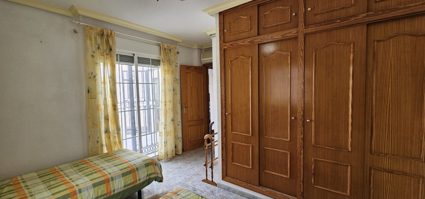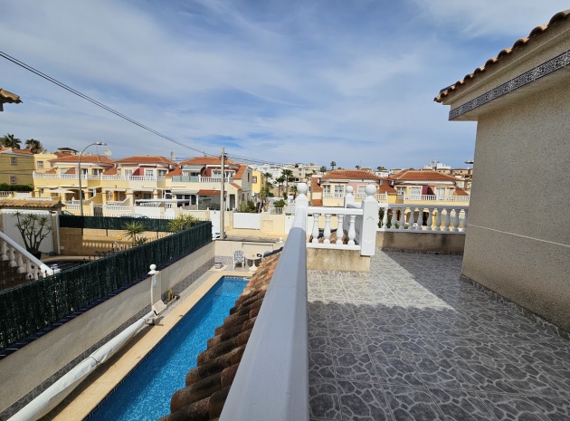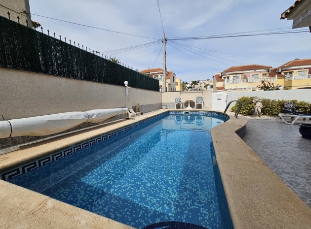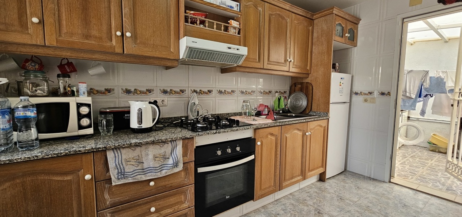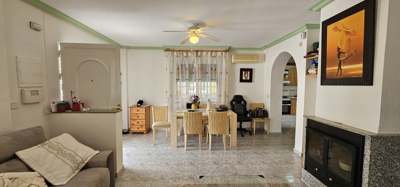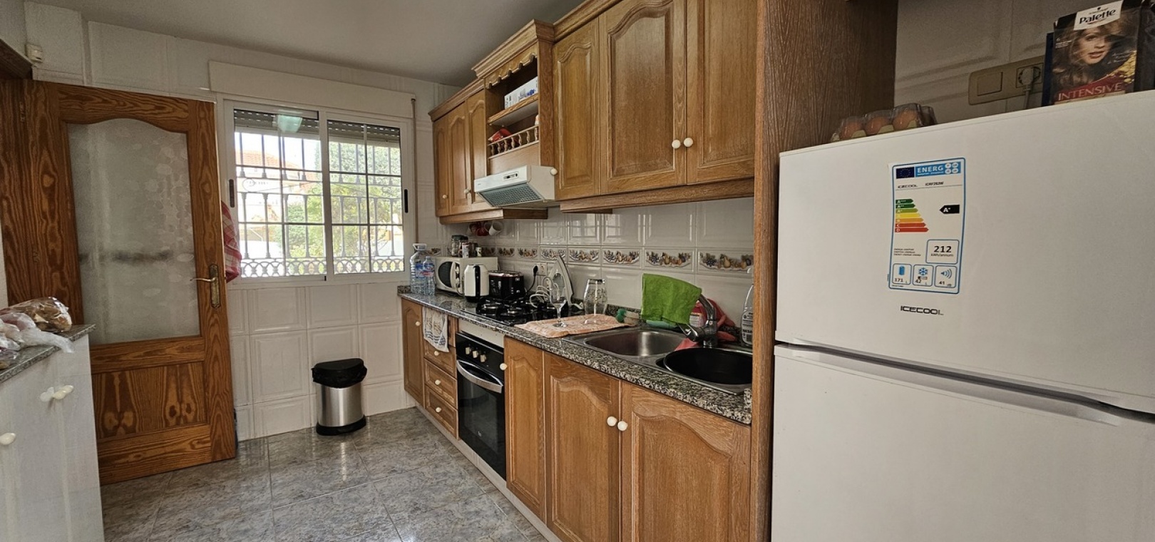 Sehr geräumige Reihenvilla mit 4 Schlafzimmern und 2 Bädern zum Verkauf in El Galan, nur einen Steinwurf und einen kurzen Spaziergang von Villamartin und allen Annehmlichkeiten entfernt, darunter zahlreiche Restaurants und Lebensmittelgeschäfte, der Golfplatz von Villamartin und The Plaza zusammen mit dem Einkaufszentrum La Fuente, Supermärkten und Weinbars. Diese Villa erstreckt sich über zwei Ebenen und liegt auf einem großen Grundstück mit privatem Swimmingpool, Parkplatz und Auffahrt abseits der Straße sowie Blick auf das Mittelmeer vom privaten und sonnigen Solarium aus. Im Inneren befindet sich ein riesiges Wohn- und Esszimmer mit zwei Fenstern, die für viel natürliches Licht sorgen. Es gibt eine voll ausgestattete separate Küche mit Zugang zum Hauswirtschaftsraum und einen sehr nützlichen Schuppen auf der Rückseite des Grundstücks. Im Erdgeschoss der Villa befinden sich ein großes Doppelzimmer und ein Gästebadezimmer mit Dusche. Im Obergeschoss befinden sich zwei weitere Doppelzimmer für Gäste (eines mit Zugang zum Solarium), das Familienbadezimmer und ein riesiges Hauptschlafzimmer, das ebenfalls Zugang zum Solarium mit atemberaubendem Blick über das Grundstück und den Swimmingpool und hinaus auf das Meer hat. Diese Immobilie wird voll möbliert wie gesehen mit vielen Extras verkauft, darunter Klimaanlage, Zentralheizung und ein brandneuer Heizkessel.