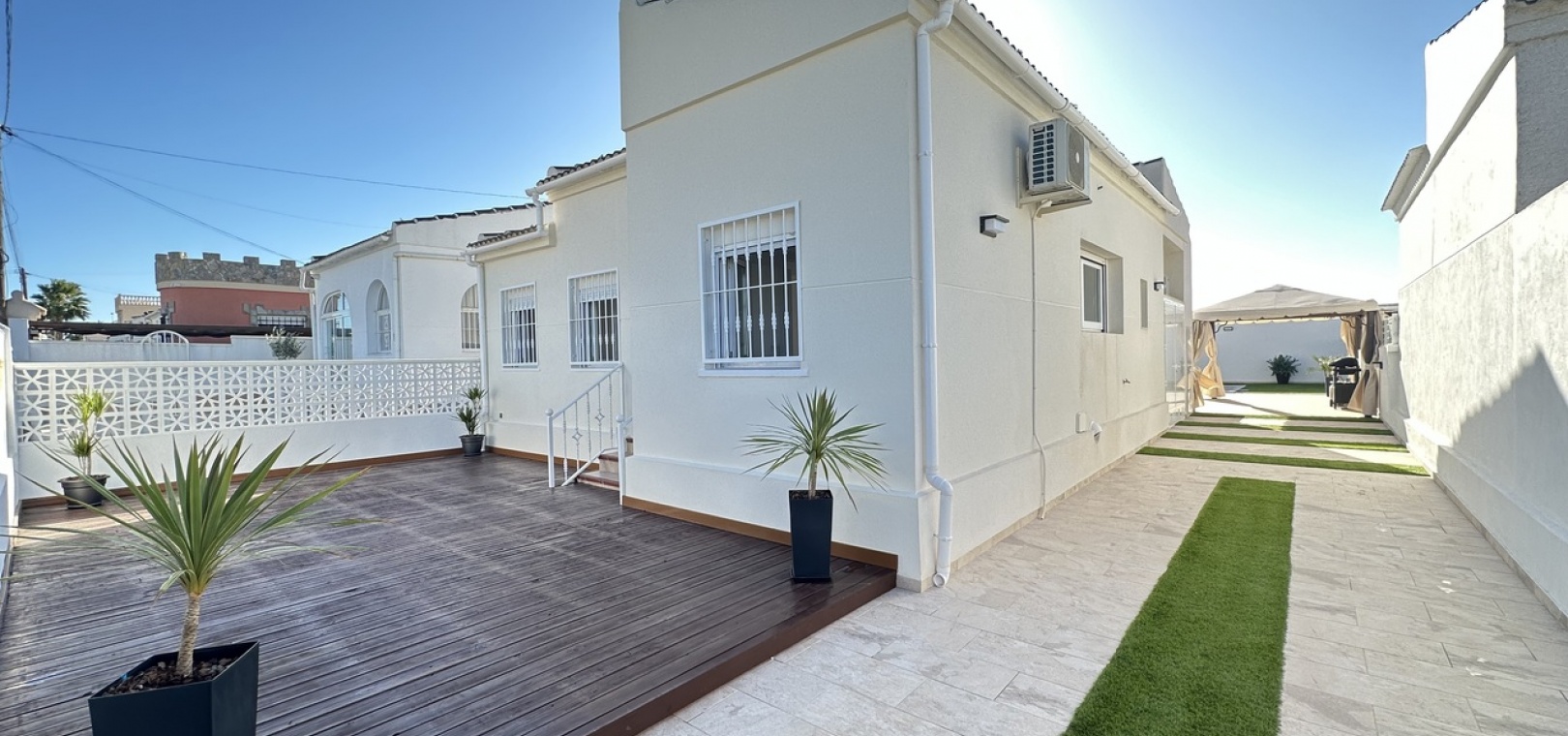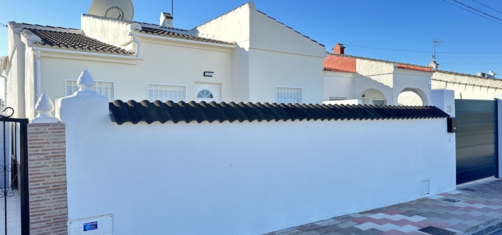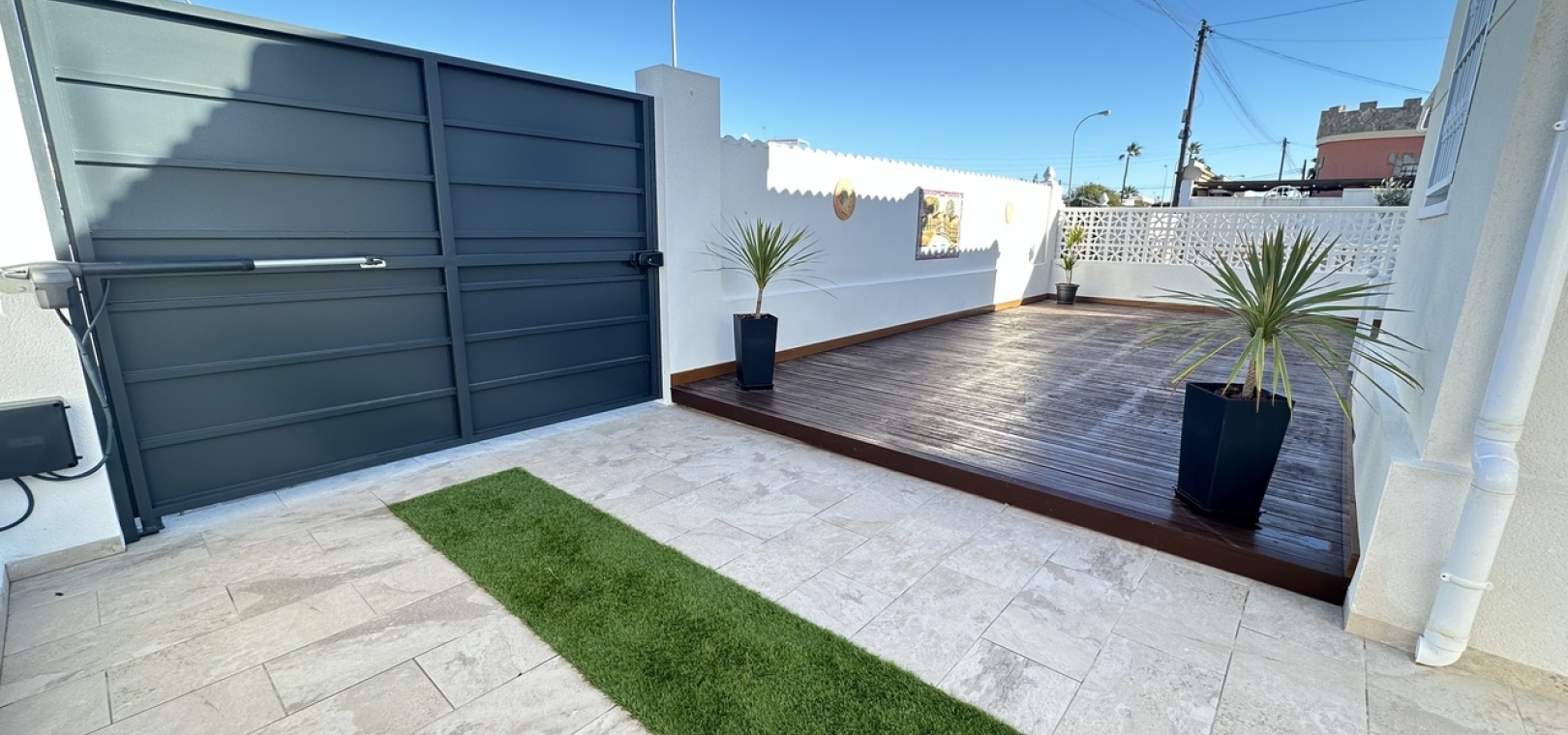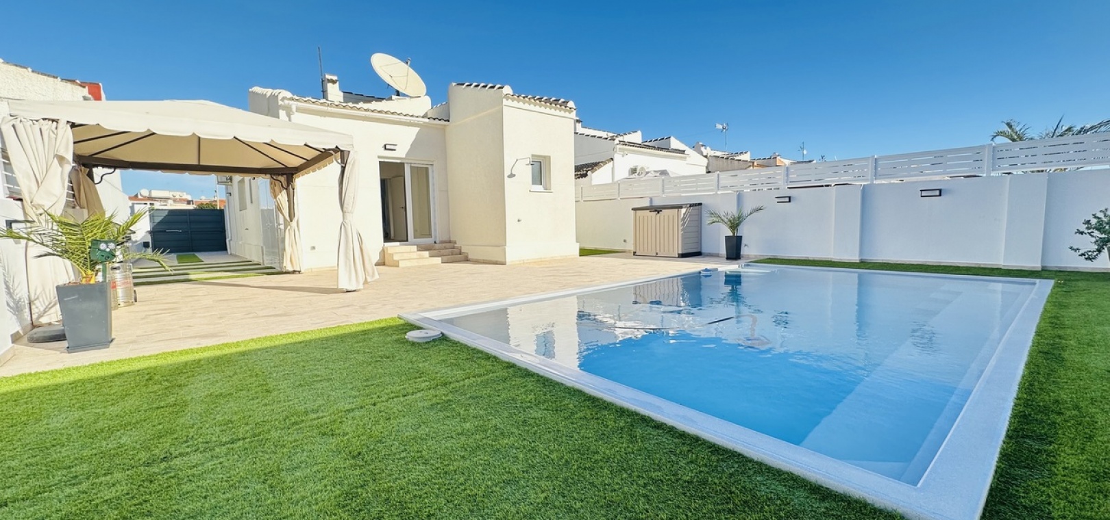 Diese komplett renovierte Villa in San Luis bietet 100 m² Wohnfläche auf einem 300 m² großen Grundstück. Sie verfügt über 3 Schlafzimmer, 2 Badezimmer (eines davon ensuite), ein geräumiges Wohnzimmer und eine moderne Küche. Der Vorgarten hat elektrische Tore und einen Parkplatz für zwei Autos. Diese Villa wurde auf hohem Niveau renoviert, alle Wohnbereiche und Schlafzimmer sind voll klimatisiert. Der offene Wohnbereich ist mit der Küche verbunden, und Terrassentüren führen zu einem Poolbereich. Draußen gibt es einen Grill, einen Pavillon und einen 8 x 4 m großen Pool, der von Kunstrasen umgeben ist. Sie liegt in der Nähe des Parks Laguna de la Mata, in der Nähe von Geschäften, Bars und Restaurants, und das Einkaufszentrum Habaneras ist nur eine kurze Autofahrt entfernt.