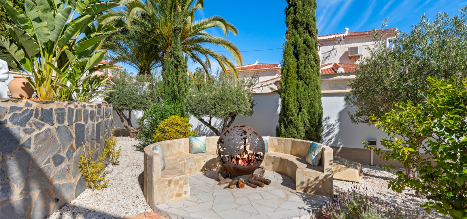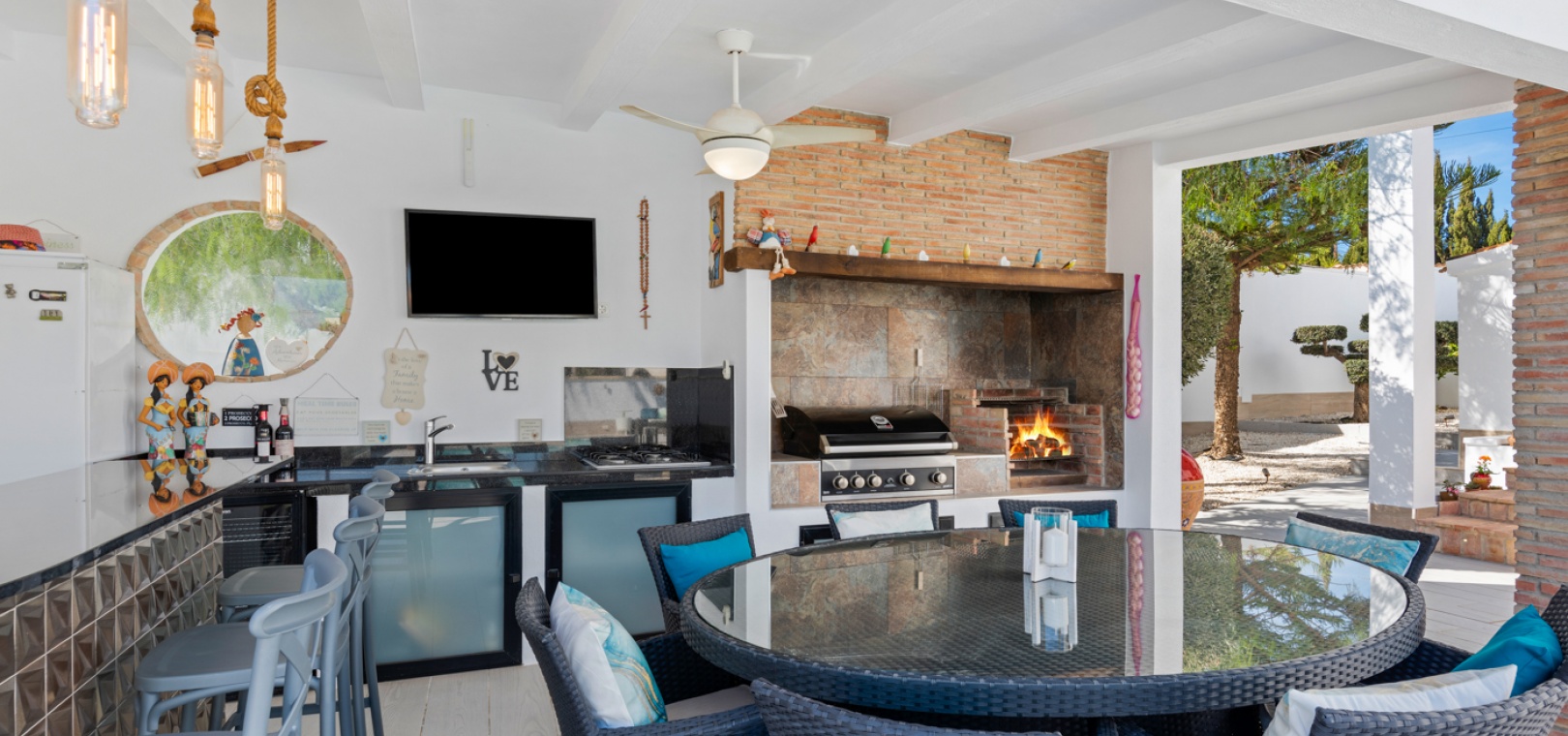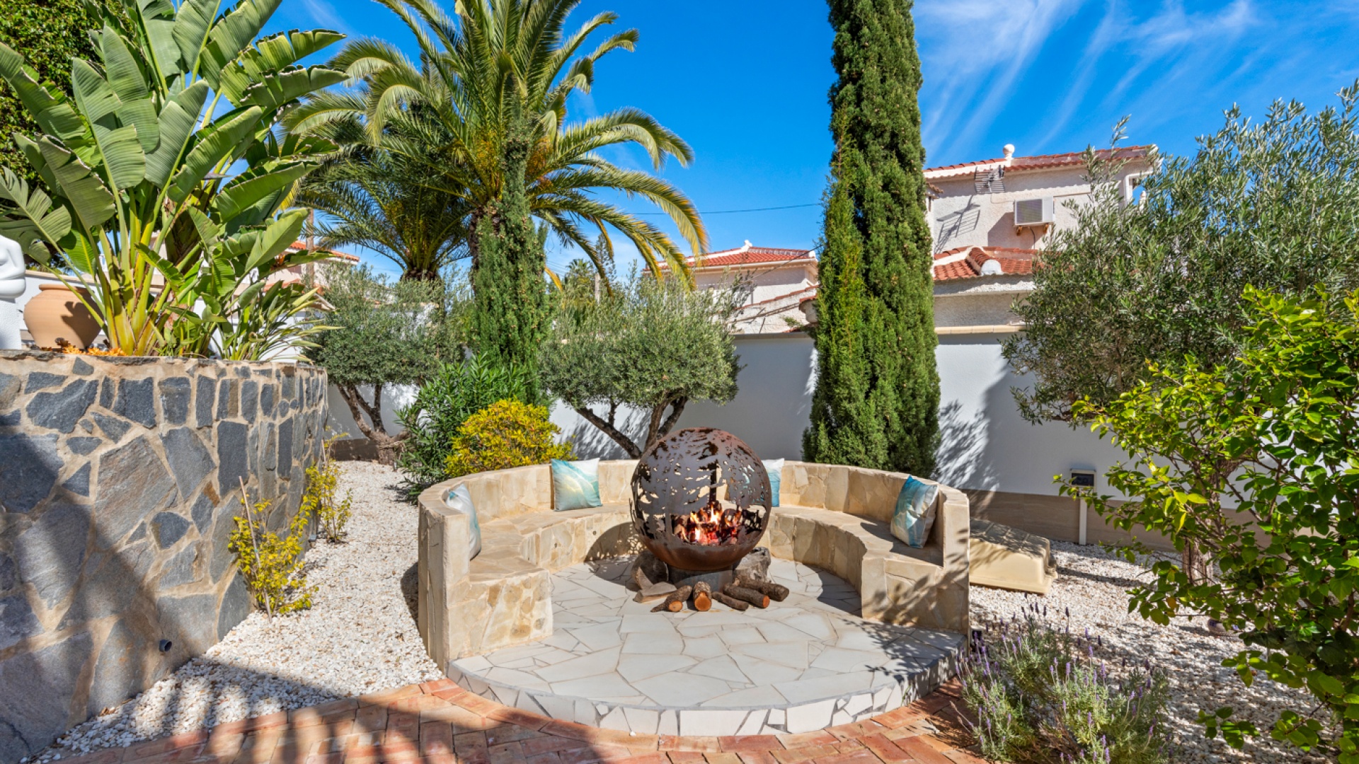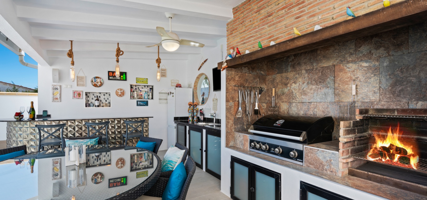Im schönen Garten finden Sie eine Mischung aus Fliesen und verschiedenen Pflanzen-/Baumarten, mit viel Platz für Sitzbereiche im Freien und einen privaten Swimmingpool. Sie finden dort auch eine Toilette, eine Außenküche mit 2 Grills (Gas/Holzkohle und Holz), Kühl-/Gefrierschrank, Weinkühlschrank und eine Bar. Sie finden dort auch einen Parkplatz abseits der Straße.