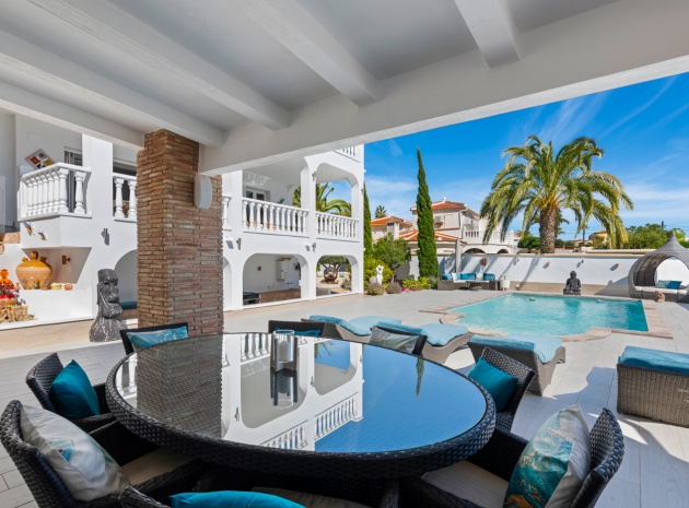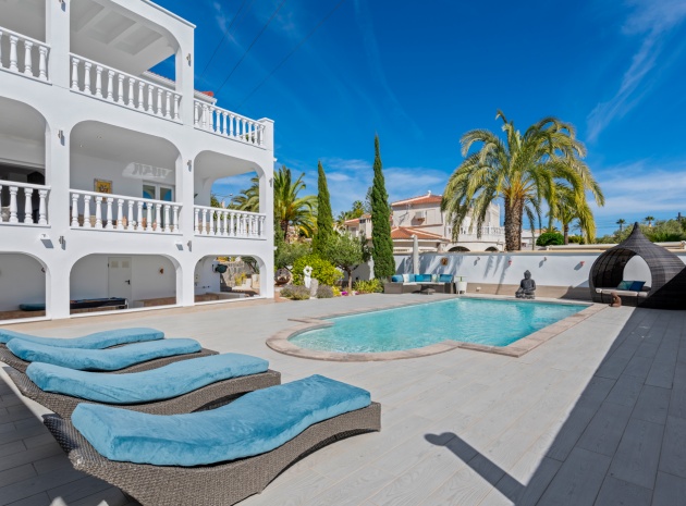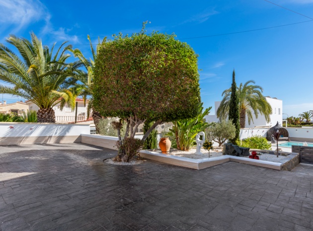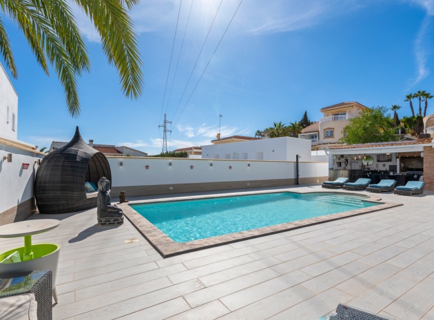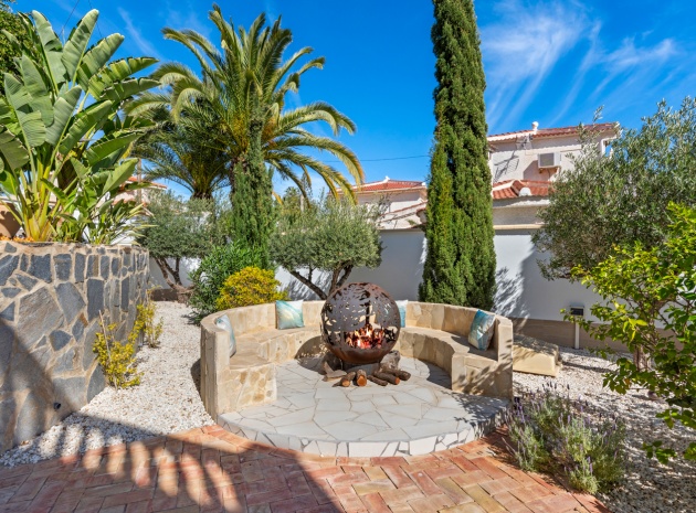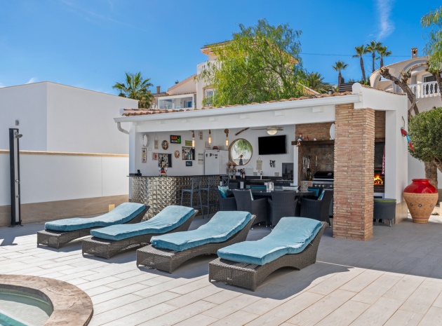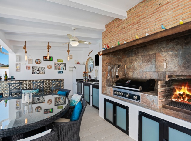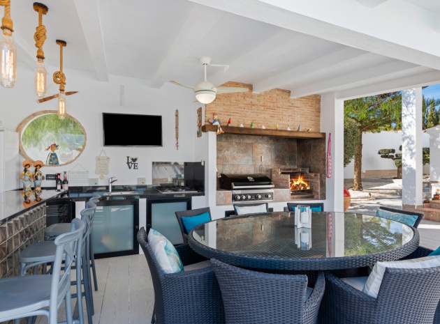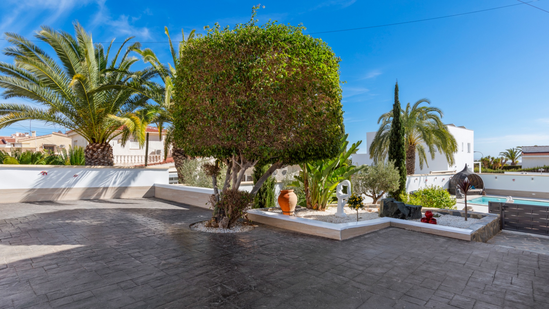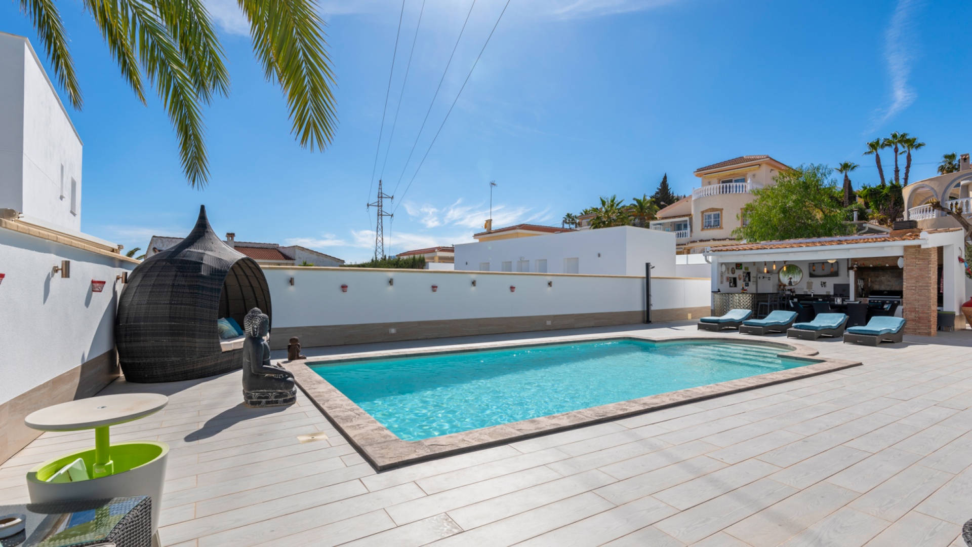 Im schönen Garten finden Sie eine Mischung aus Fliesen und verschiedenen Pflanzen-/Baumarten, mit viel Platz für Sitzbereiche im Freien und einen privaten Swimmingpool. Sie finden dort auch eine Toilette, eine Außenküche mit 2 Grills (Gas/Holzkohle und Holz), Kühl-/Gefrierschrank, Weinkühlschrank und eine Bar. Sie finden dort auch einen Parkplatz abseits der Straße.