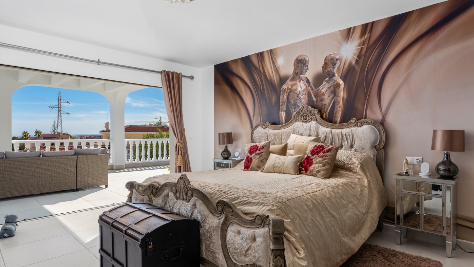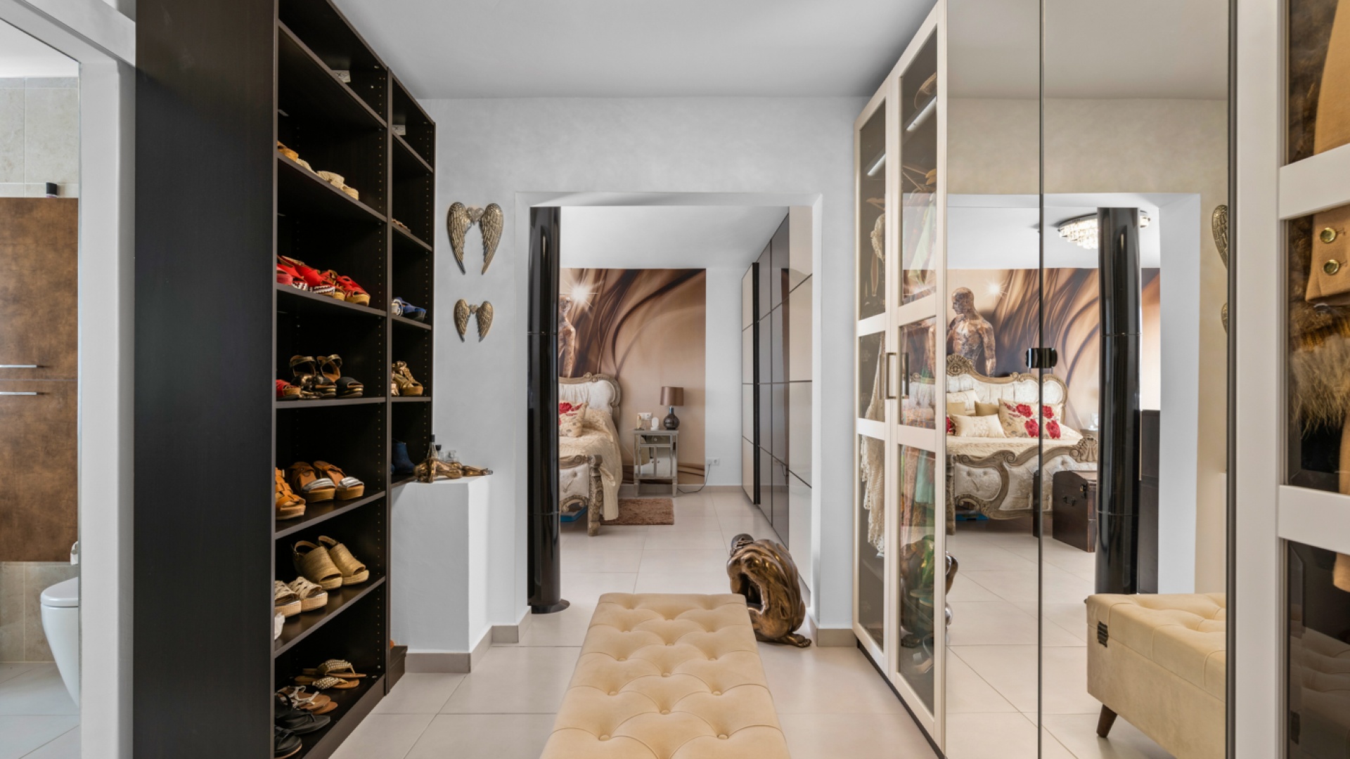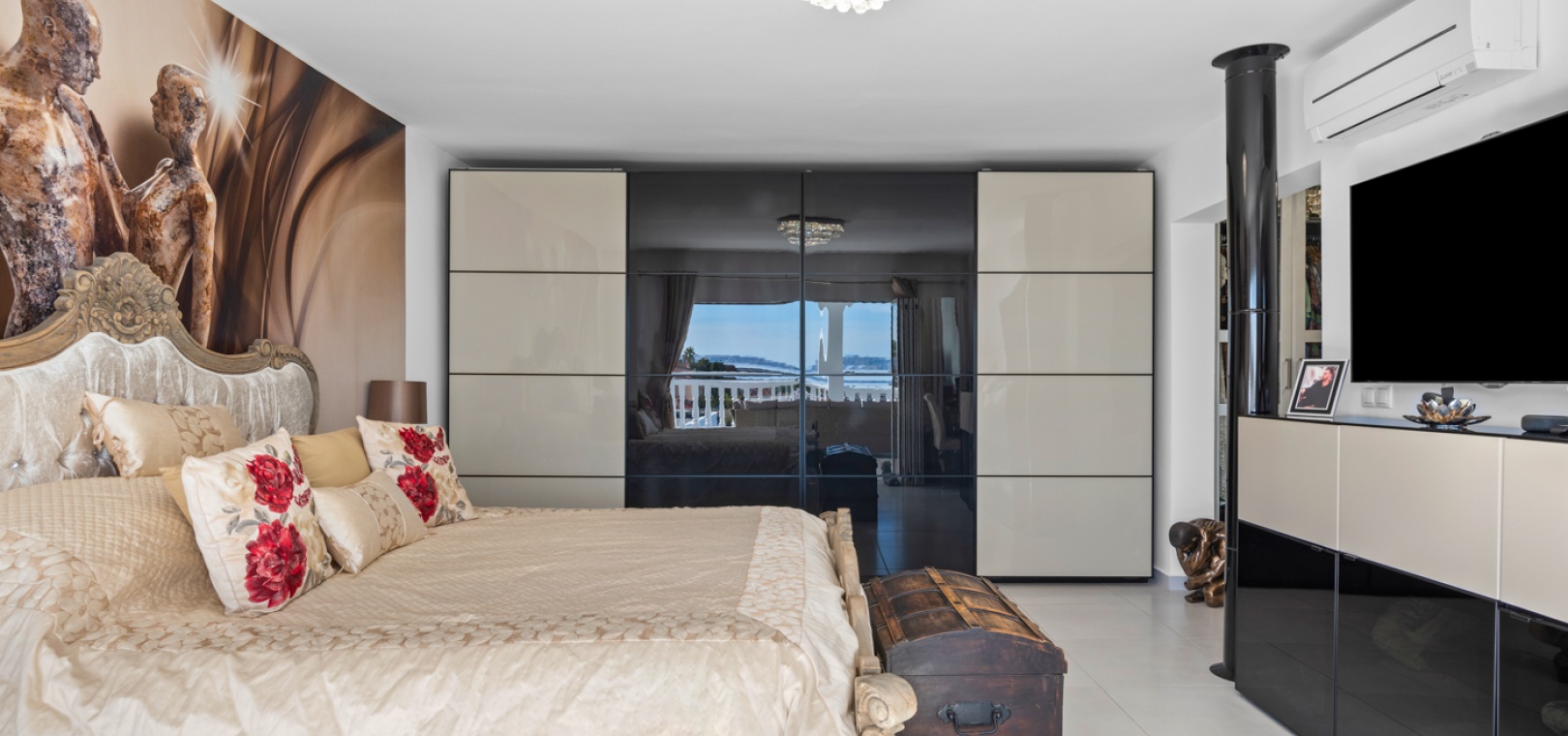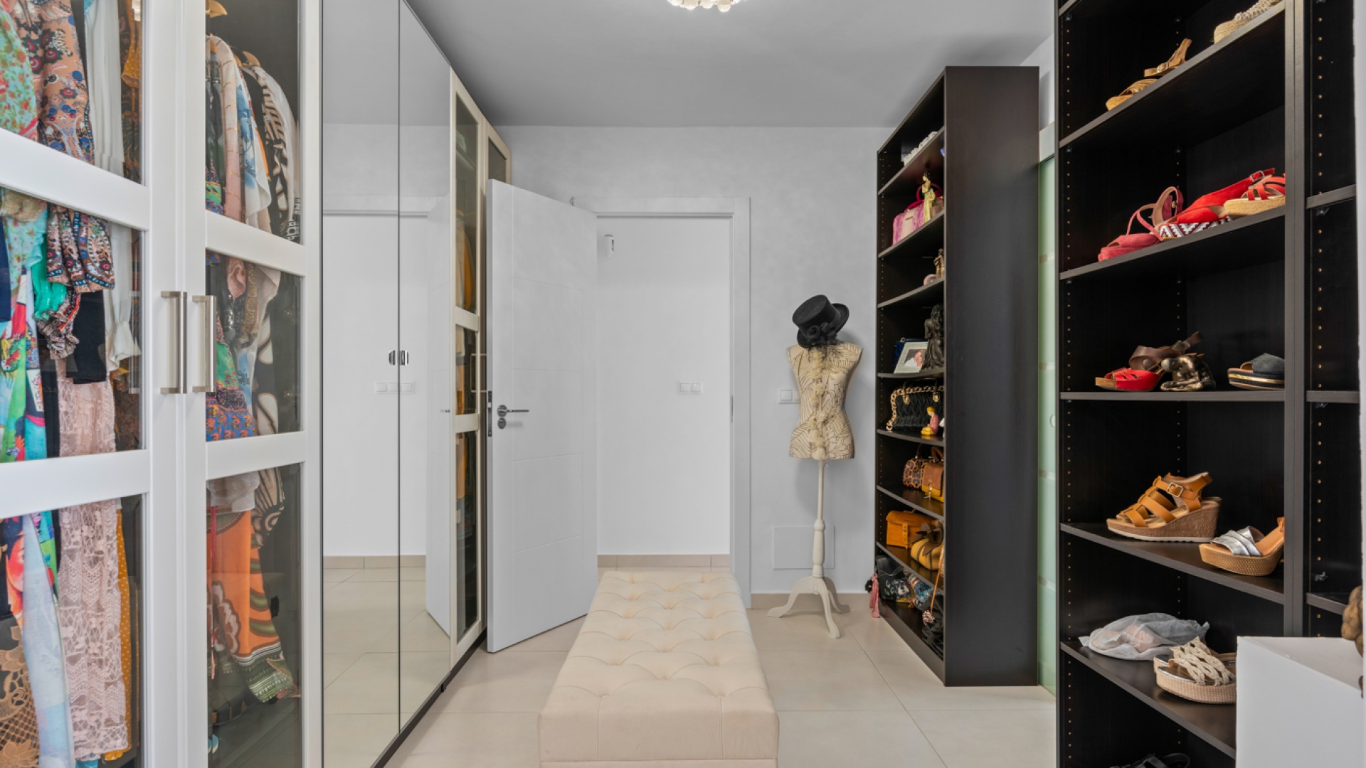 Im ersten Stock finden Sie 2 Schlafzimmer, beide mit eigenem Bad. Das Hauptschlafzimmer verfügt über einen begehbaren Kleiderschrank und direkten Zugang zu einer zweiten Terrasse mit spektakulärer Aussicht.