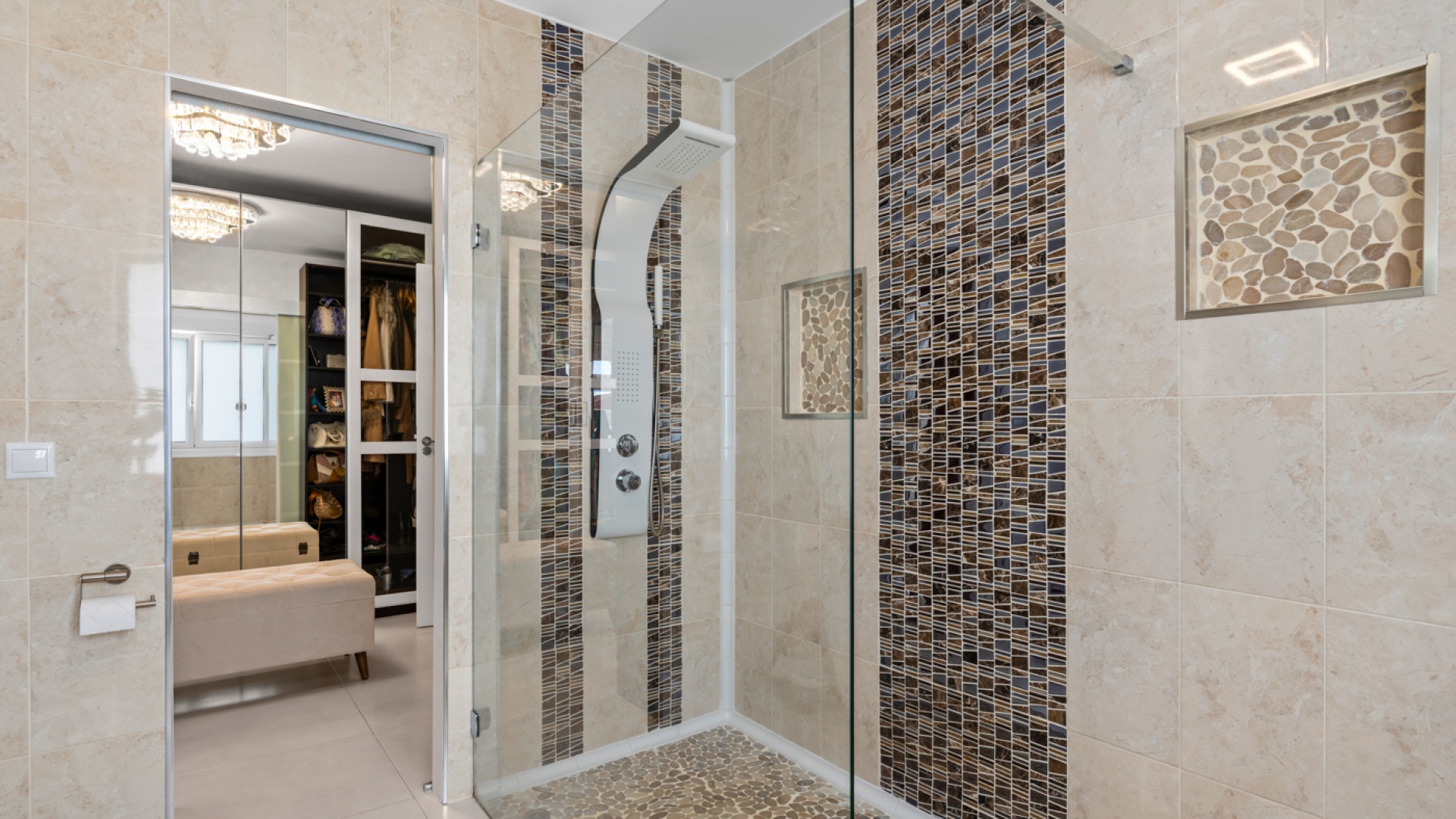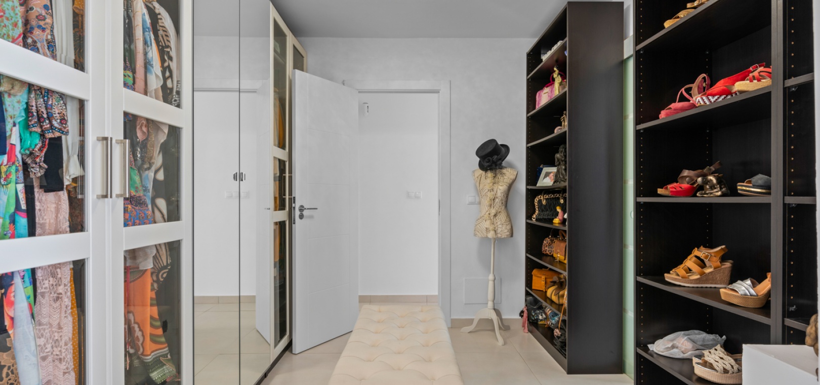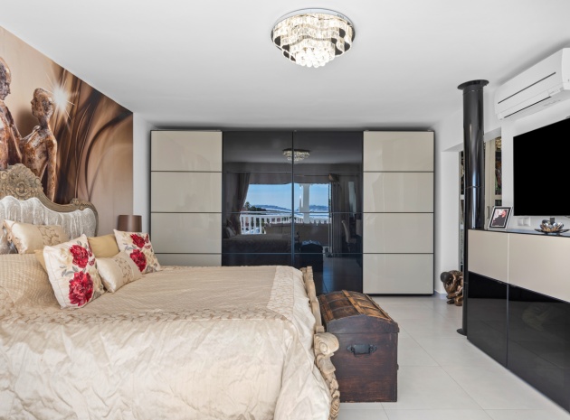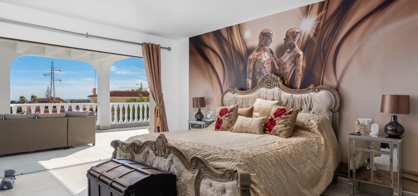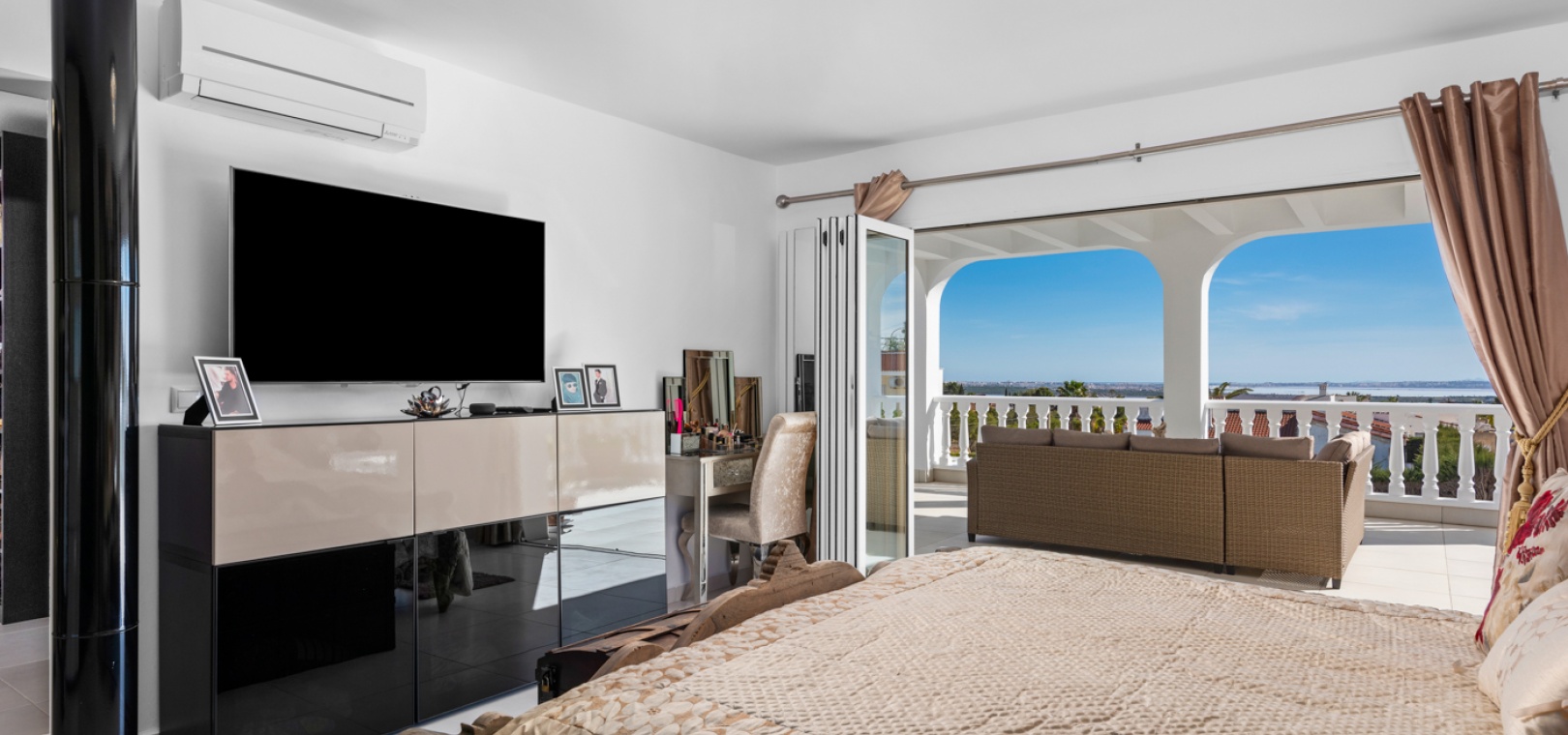 Im ersten Stock finden Sie 2 Schlafzimmer, beide mit eigenem Bad. Das Hauptschlafzimmer verfügt über einen begehbaren Kleiderschrank und direkten Zugang zu einer zweiten Terrasse mit spektakulärer Aussicht.