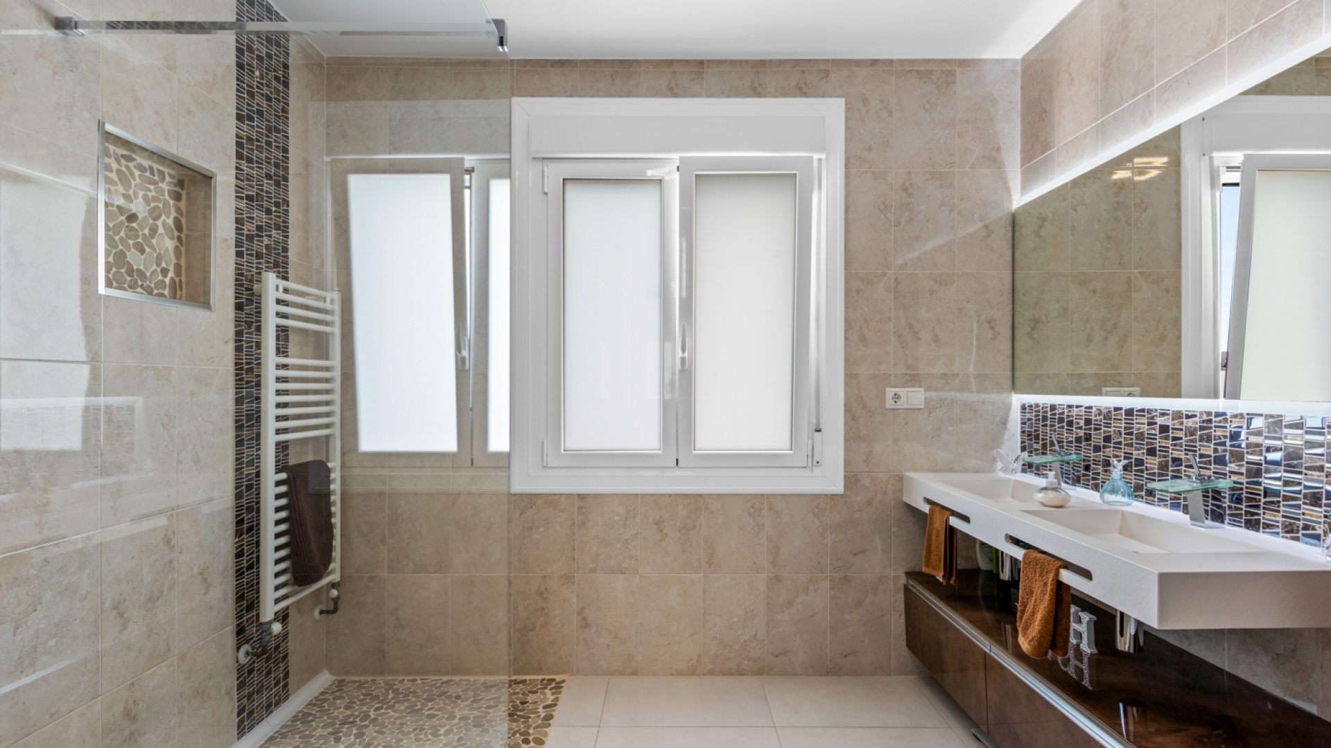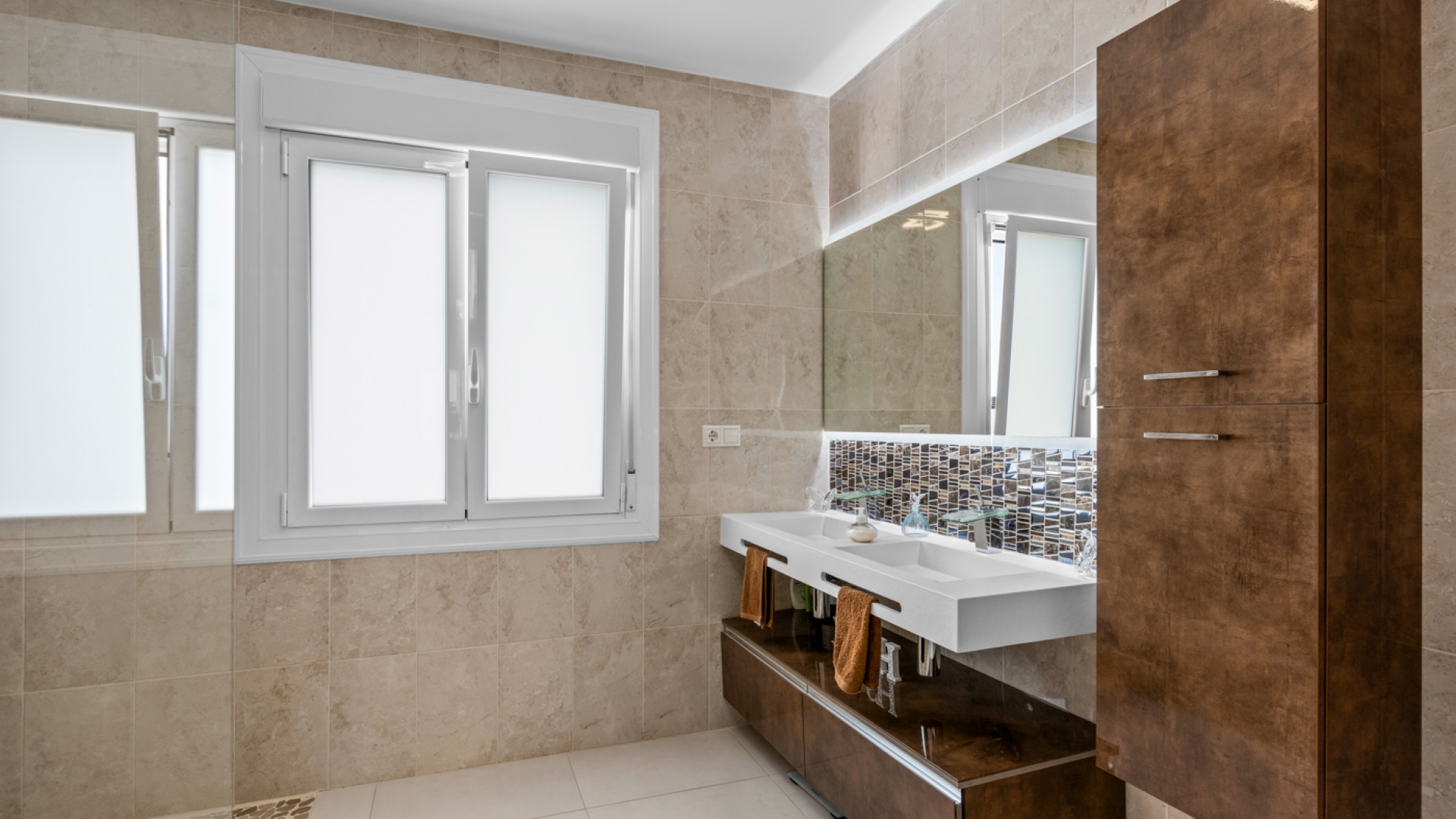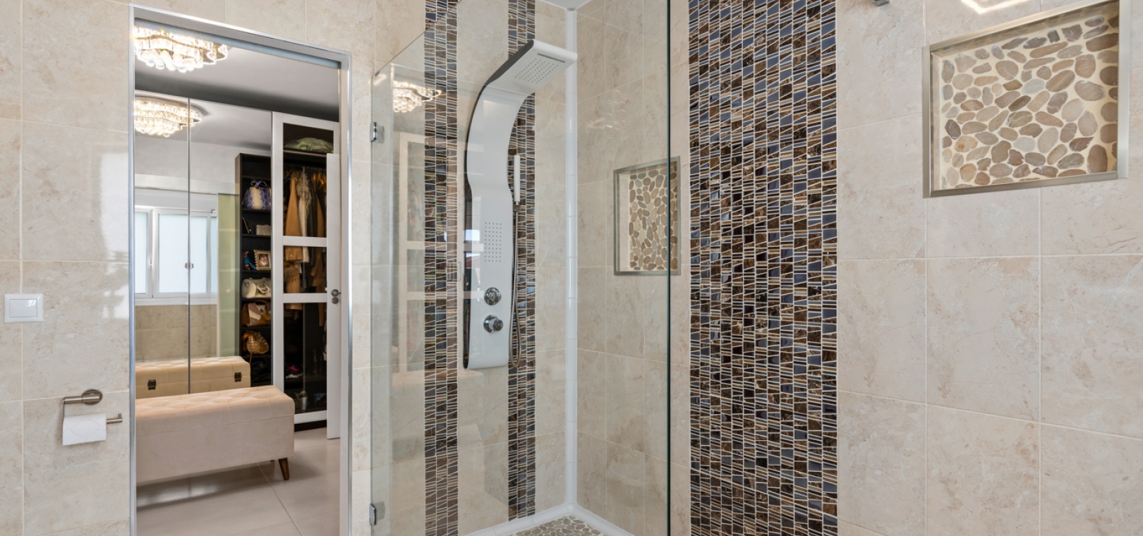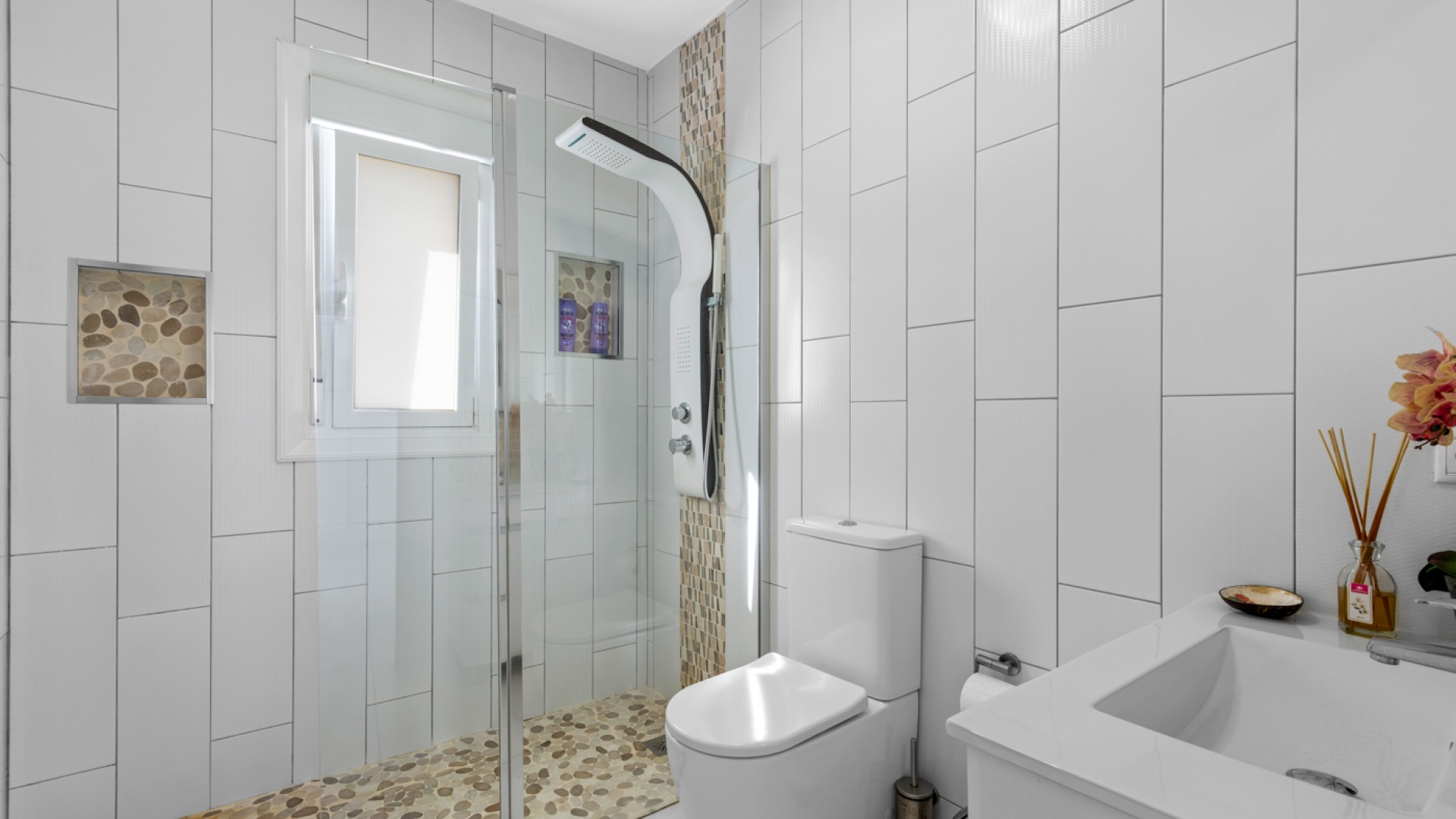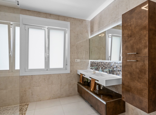 Im ersten Stock finden Sie 2 Schlafzimmer, beide mit eigenem Bad. Das Hauptschlafzimmer verfügt über einen begehbaren Kleiderschrank und direkten Zugang zu einer zweiten Terrasse mit spektakulärer Aussicht.