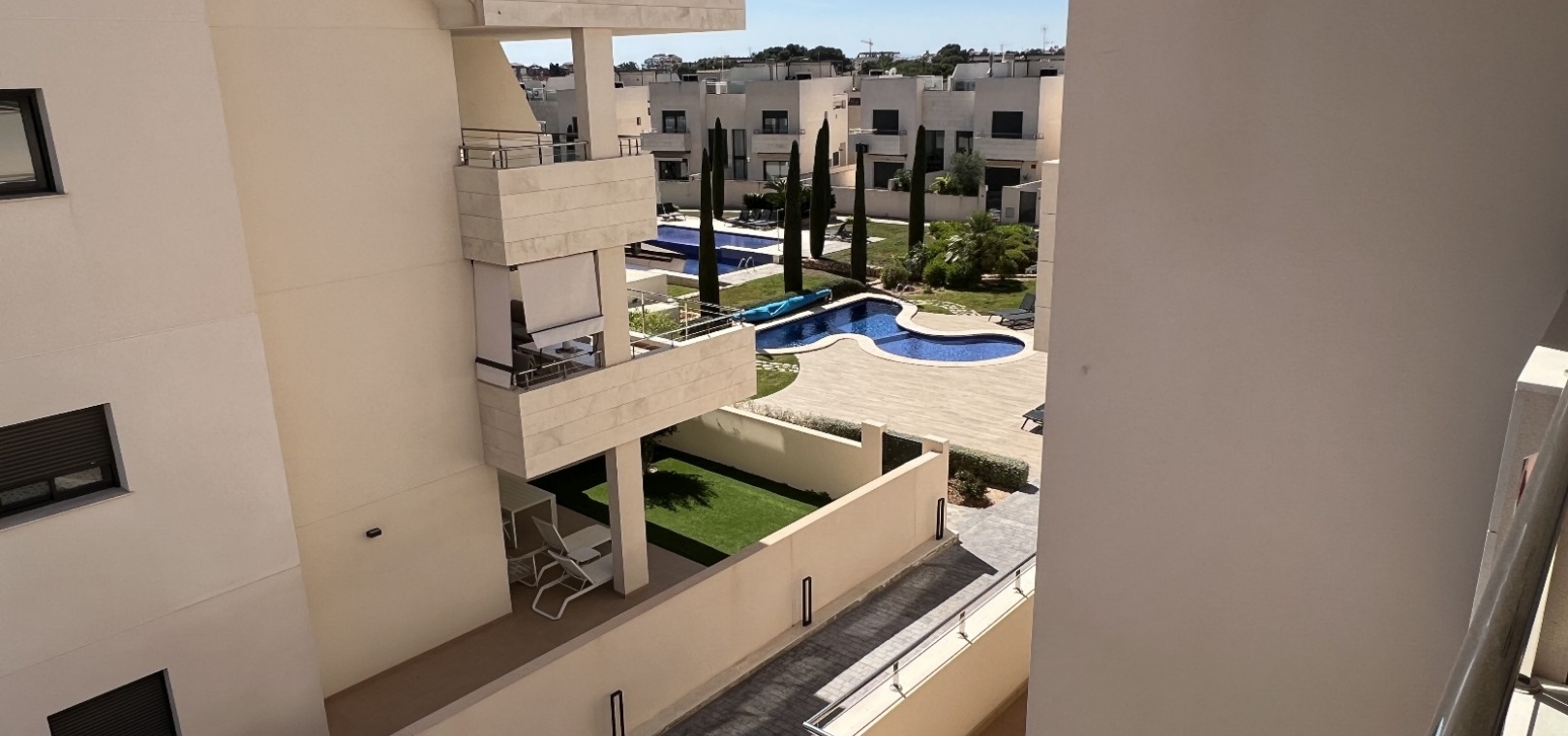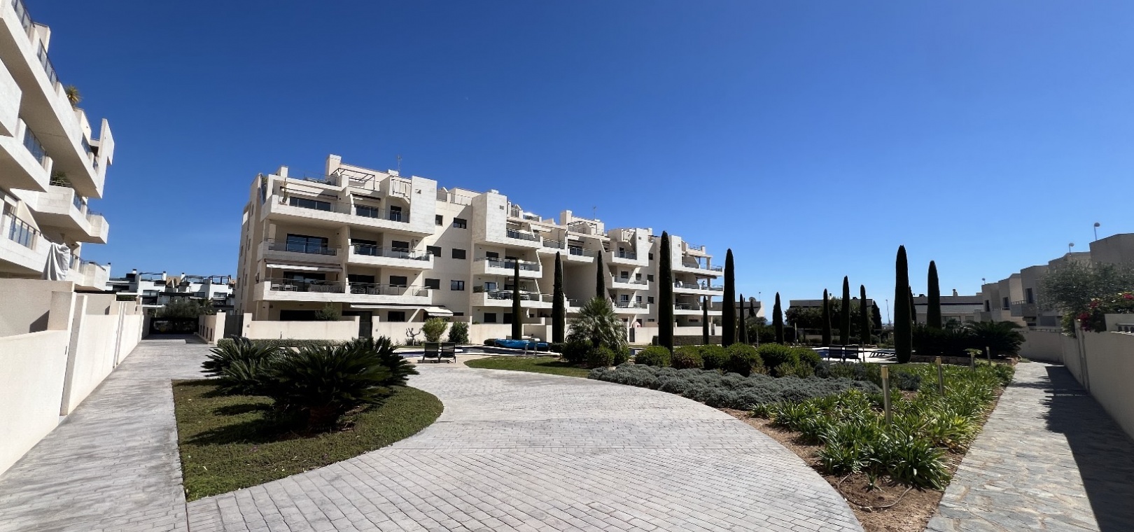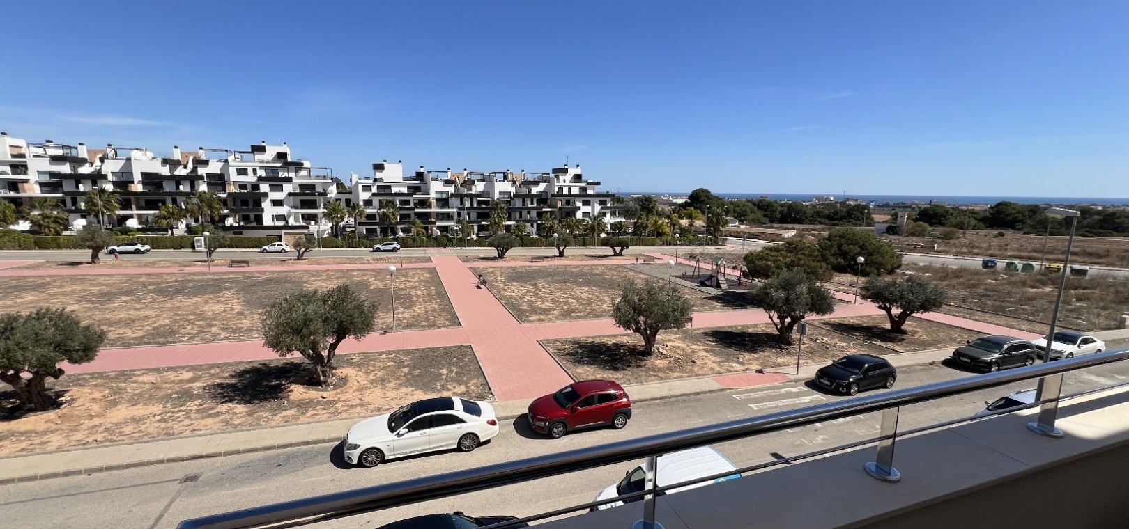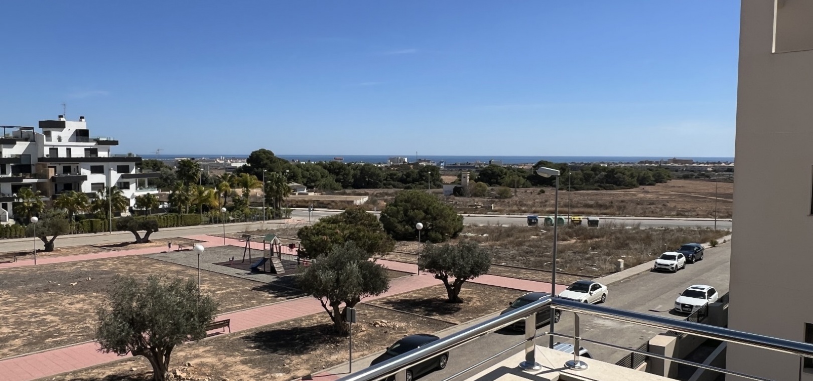 Wir präsentieren Ihnen dieses atemberaubende, moderne Apartment mit 2 Schlafzimmern und 2 Bädern sowie bezauberndem Meerblick. Eingebettet in die begehrte Gegend Los Dolses / La Zenia bietet diese Residenz eine perfekte Mischung aus modernem Design und Küstencharme. Betreten Sie den luftigen und hellen Wohnbereich, der von natürlichem Licht durchflutet wird und eine einladende Atmosphäre schafft. Das Highlight dieses Apartments ist die schöne Eckterrasse mit Blick auf den großen Park und den darunter liegenden Gemeinschaftspool. Ideal, um den Sonnenaufgang am Morgen bei einem Kaffee mit einer ruhigen Aussicht im Hintergrund zu genießen. Der offene Grundriss verbindet nahtlos die Wohn-, Ess- und Küchenbereiche und ist perfekt, um Gäste zu unterhalten oder mit der Familie zu entspannen. Die gut ausgestattete Küche bietet reichlich Platz zum Vorbereiten und wird durch einen separaten Wasch-/Speiseraum ergänzt, was für Komfort und Funktionalität sorgt. Dieses Anwesen bietet außerdem praktische Annehmlichkeiten wie eine Tiefgarage und einen Abstellraum, einen gemeinschaftlichen Fahrradkeller und einen Kinderspielplatz. Tauchen Sie ein in die wunderschön angelegten Gärten, die einen ruhigen Rückzugsort innerhalb der Gemeinschaft bieten. Genießen Sie entspannte Schwimmzüge in einem der beiden Pools, darunter ein beheizter Pool für ganzjährigen Genuss. Dank der günstigen Lage haben die Bewohner einfachen Zugang zu einer Reihe von Annehmlichkeiten, darunter das renommierte Einkaufszentrum Zenia Boulevard und die Sandstrände von Orihuela Costa.