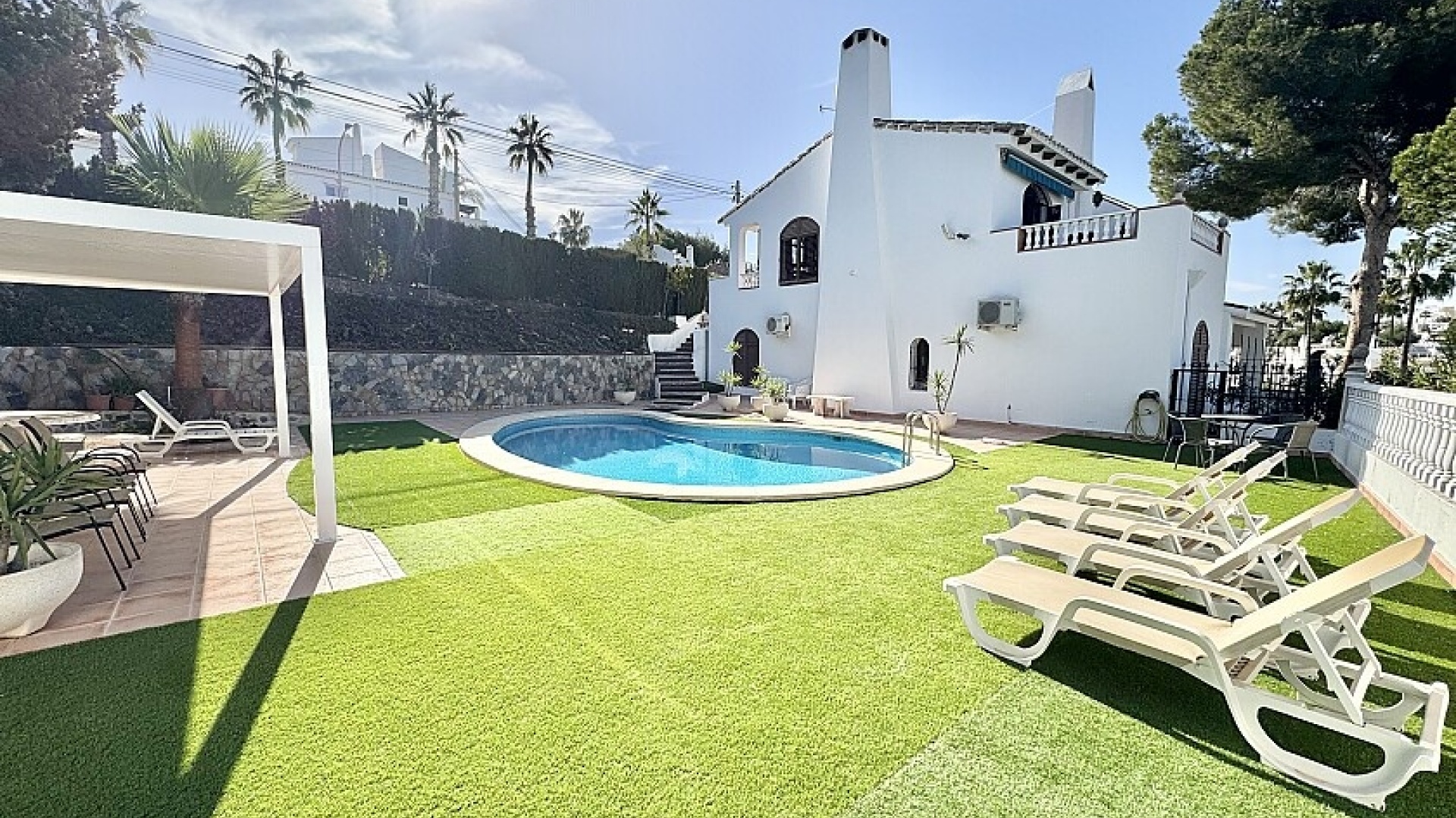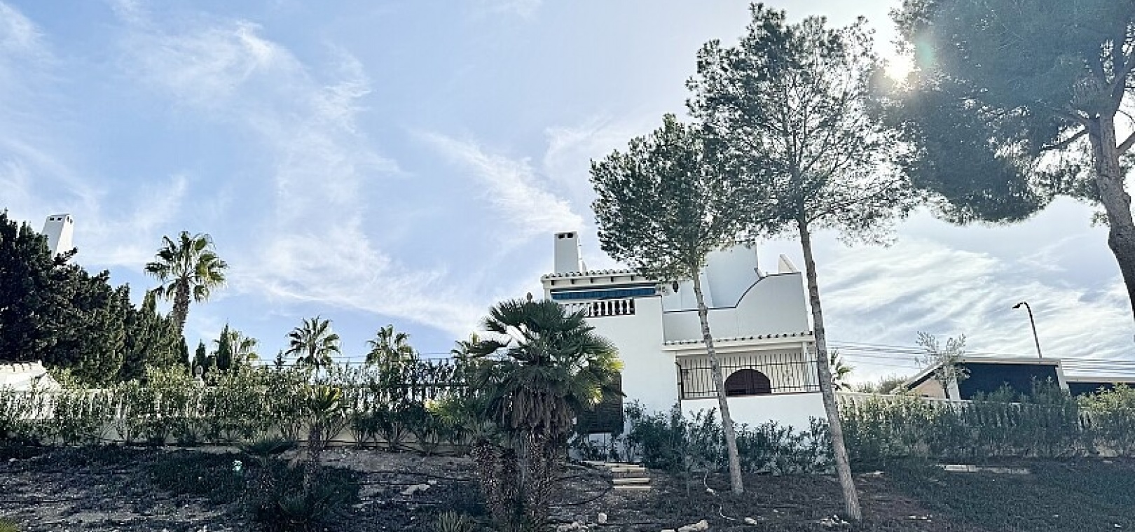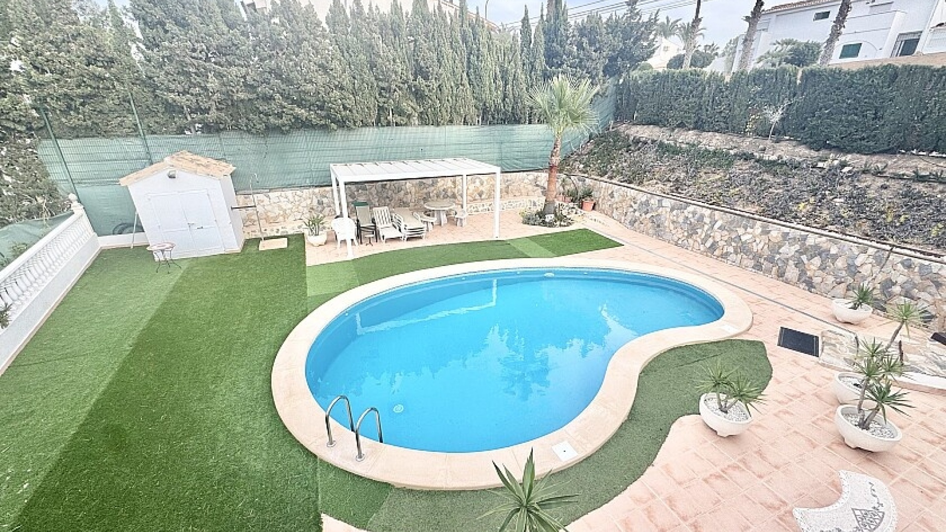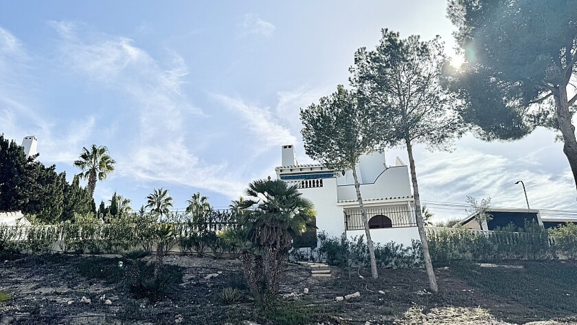 Freistehende Villa mit 4 Schlafzimmern und Blick auf den Golfplatz Villamartín. Freistehende Villa mit 4 Schlafzimmern und 2 Bädern mit privatem Pool. Diese nach Süden ausgerichtete Villa mit Blick auf den Golfplatz Villamartín verfügt über ein großes 900 m2 großes Grundstück, einen privaten Pool, einen Whirlpool und ein Solarium. Es wird komplett möbliert und ausgestattet verkauft, kürzlich renoviert und verfügt über einen Kamin auf jeder Etage und eine Klimaanlage. Dieses Chalet verfügt über eine Touristenlizenz und ist daher eine großartige Gelegenheit für Investitionen oder zum ganzjährigen Wohnen. Es liegt 20 Gehminuten vom Platz und dem Golfplatz Villamartín und wenige Autominuten von den Stränden von Orihuela Costa entfernt.