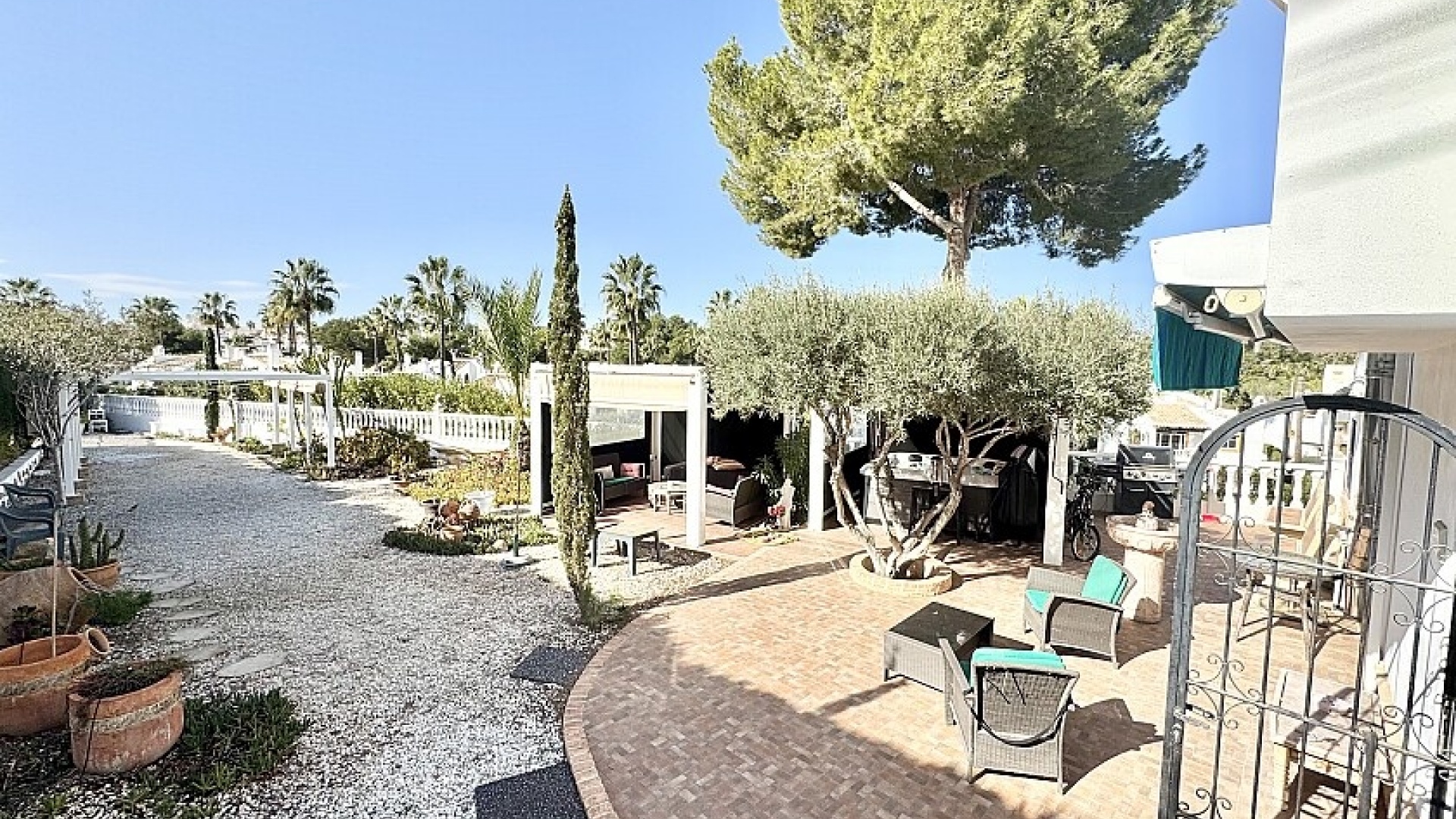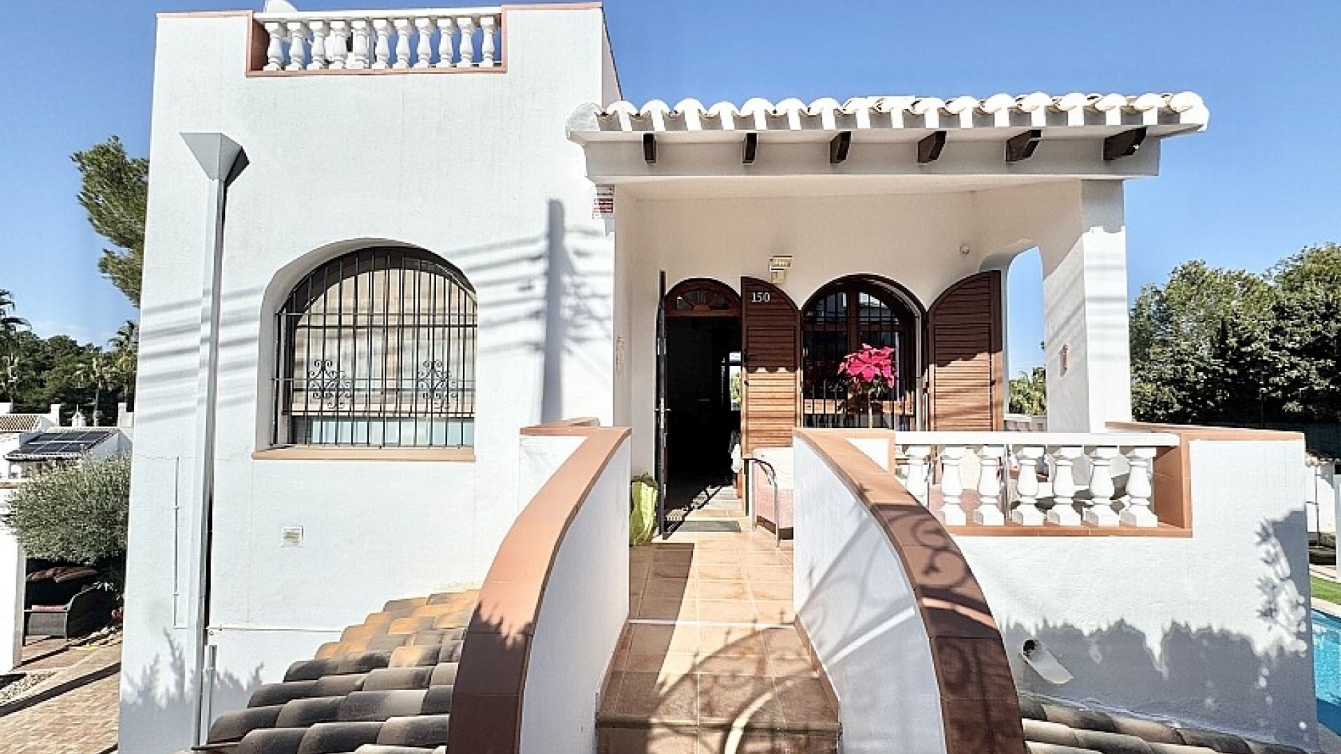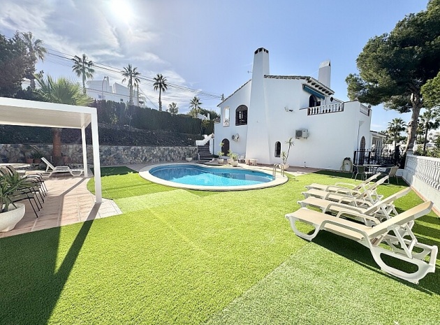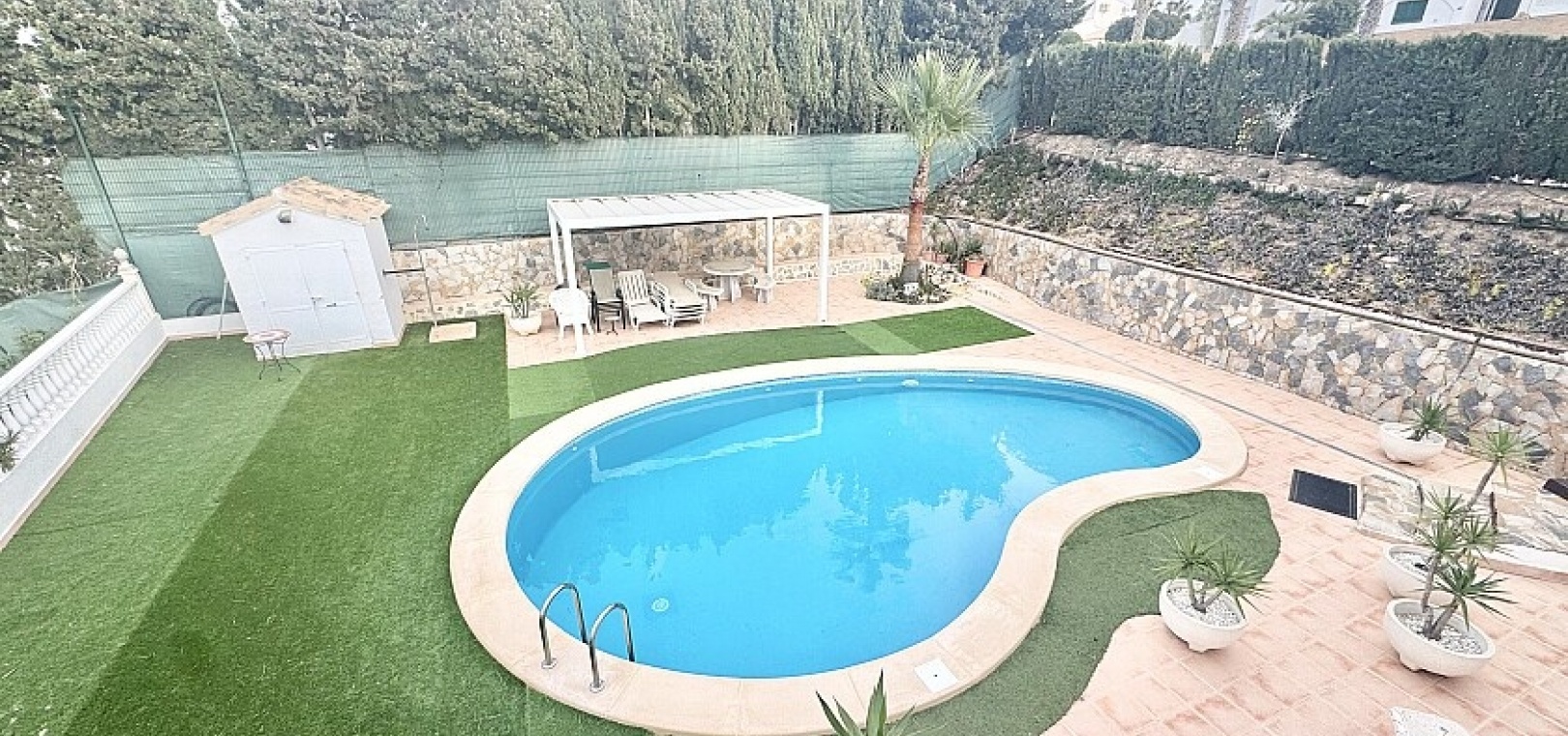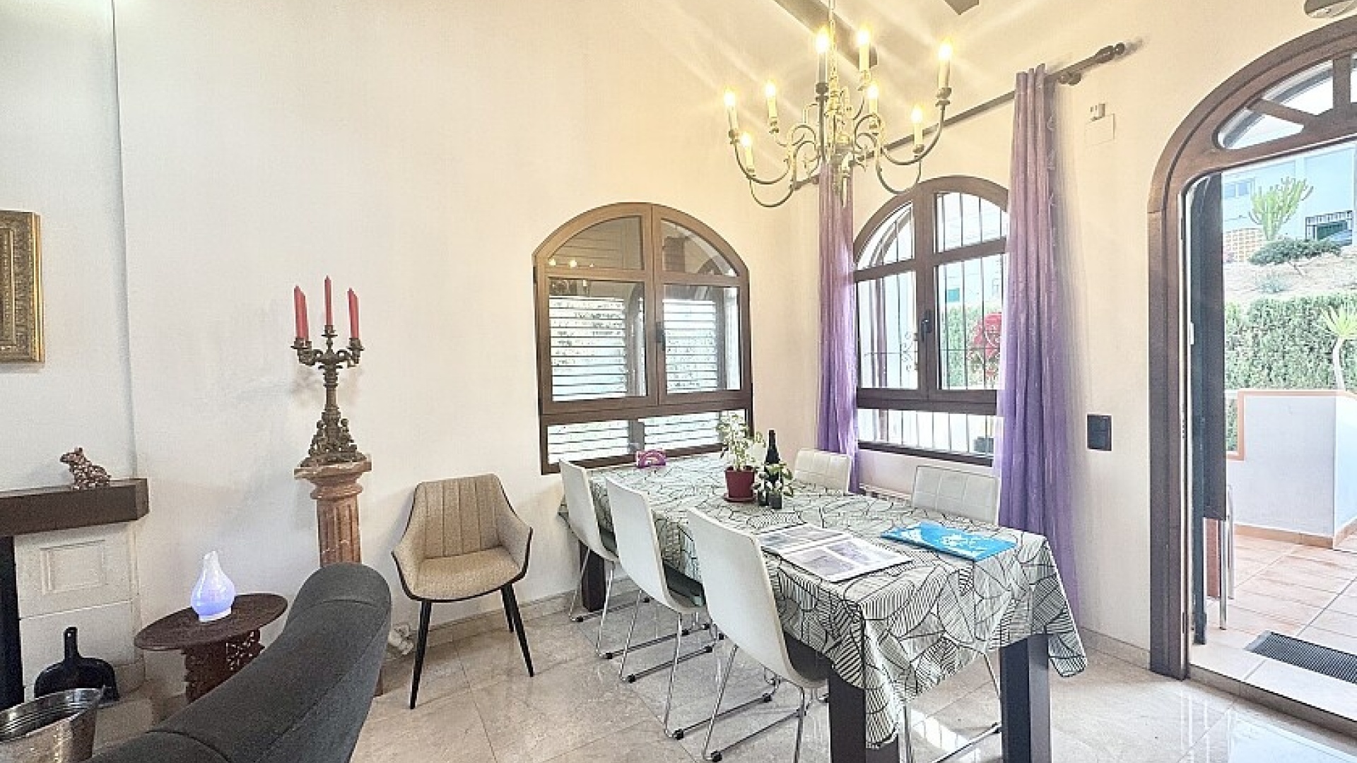 Freistehende Villa mit 4 Schlafzimmern und Blick auf den Golfplatz Villamartín. Freistehende Villa mit 4 Schlafzimmern und 2 Bädern mit privatem Pool. Diese nach Süden ausgerichtete Villa mit Blick auf den Golfplatz Villamartín verfügt über ein großes 900 m2 großes Grundstück, einen privaten Pool, einen Whirlpool und ein Solarium. Es wird komplett möbliert und ausgestattet verkauft, kürzlich renoviert und verfügt über einen Kamin auf jeder Etage und eine Klimaanlage. Dieses Chalet verfügt über eine Touristenlizenz und ist daher eine großartige Gelegenheit für Investitionen oder zum ganzjährigen Wohnen. Es liegt 20 Gehminuten vom Platz und dem Golfplatz Villamartín und wenige Autominuten von den Stränden von Orihuela Costa entfernt.