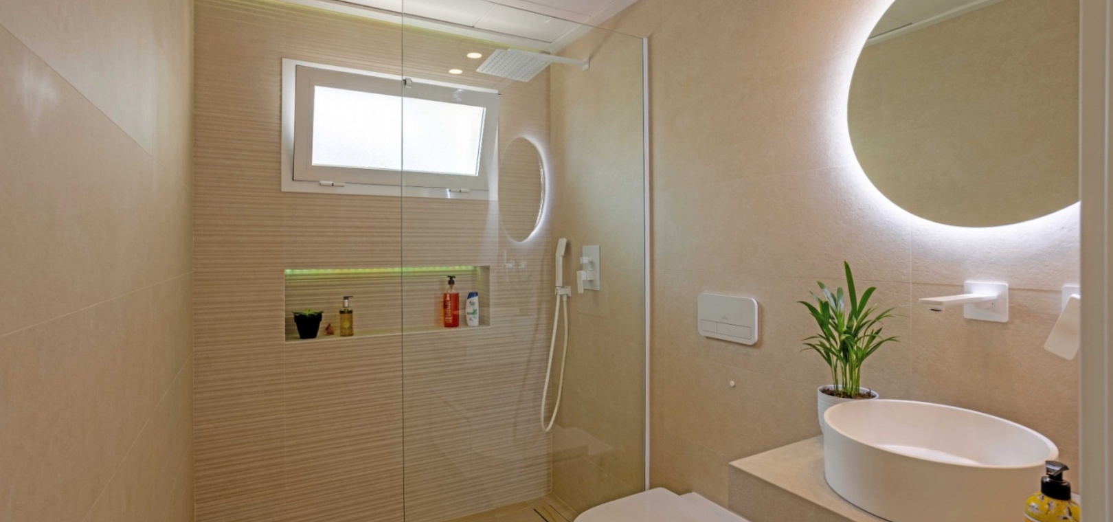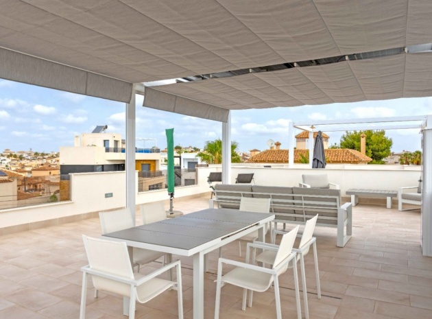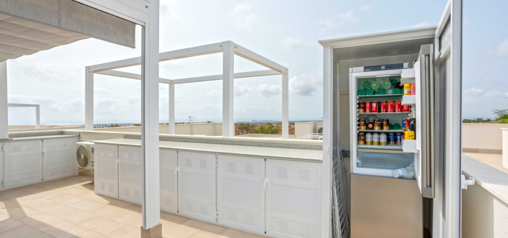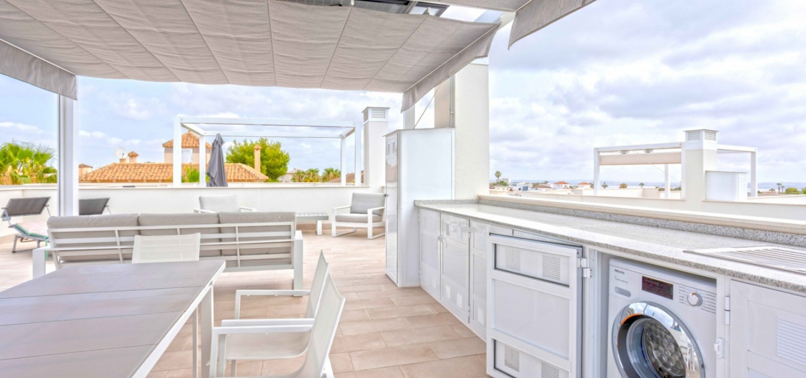 Auf der Dachterrasse trifft Luxus auf Nachhaltigkeit. Sie ist mit einer Außenküche, einer geräumigen Pergola mit horizontalen und vertikalen Sonnenschirmen und 4100-Watt-Solarmodulen ausgestattet, um Ihren Energiebedarf zu decken. Zusätzliche Funktionen wie eine Waschmaschine und ein Kühl-Gefrierschrank sind für ultimativen Komfort diskret auf der Terrasse untergebracht.