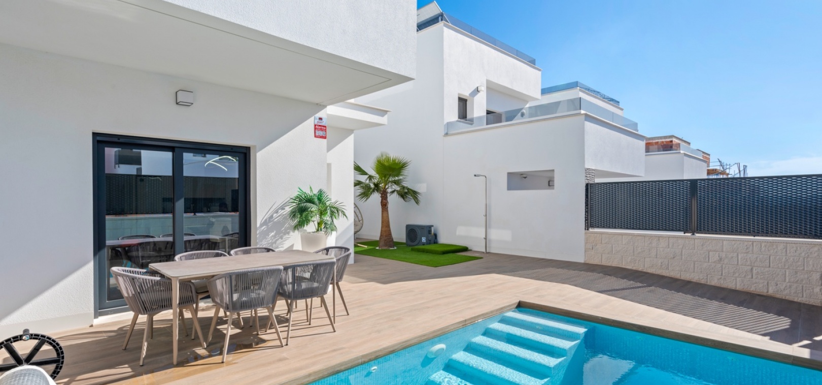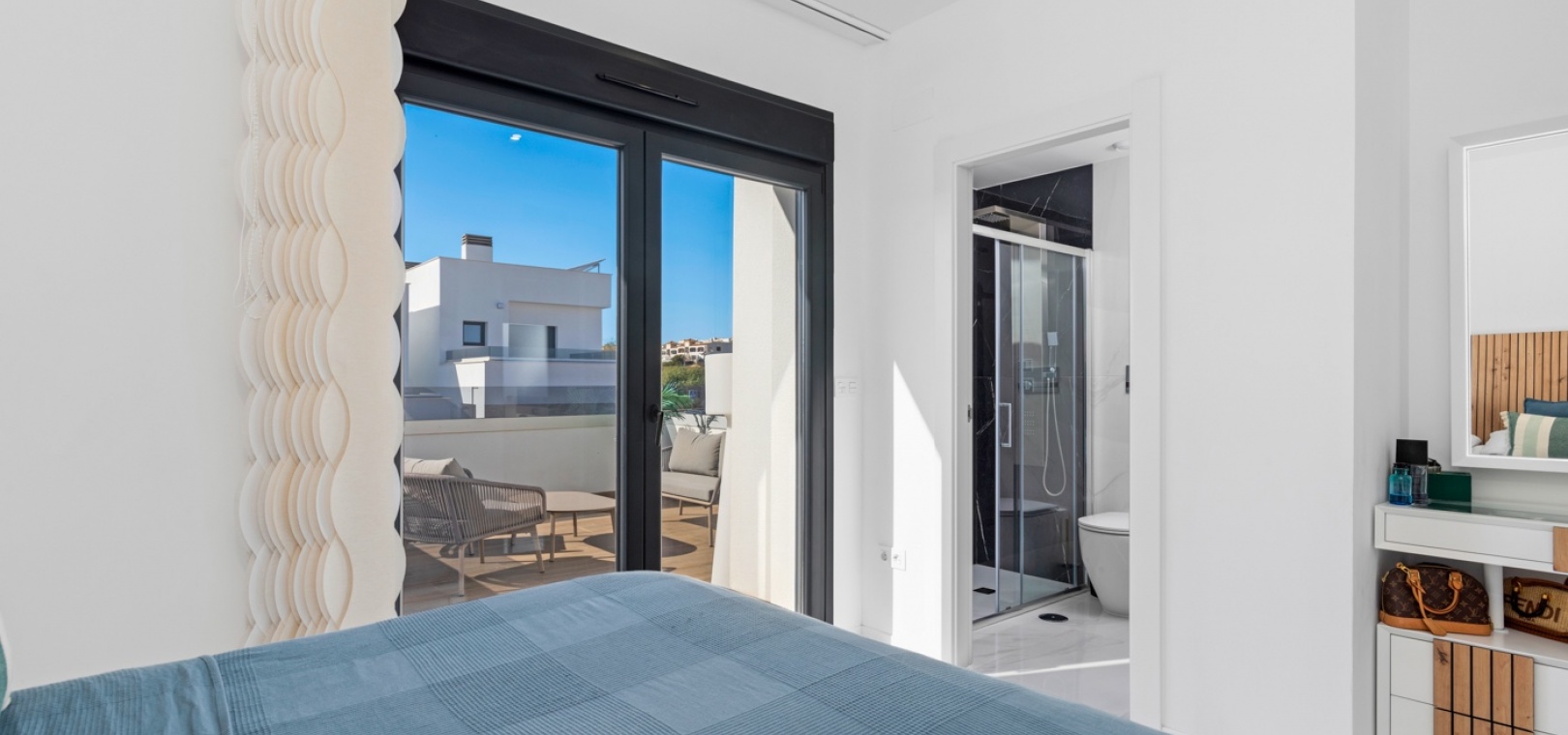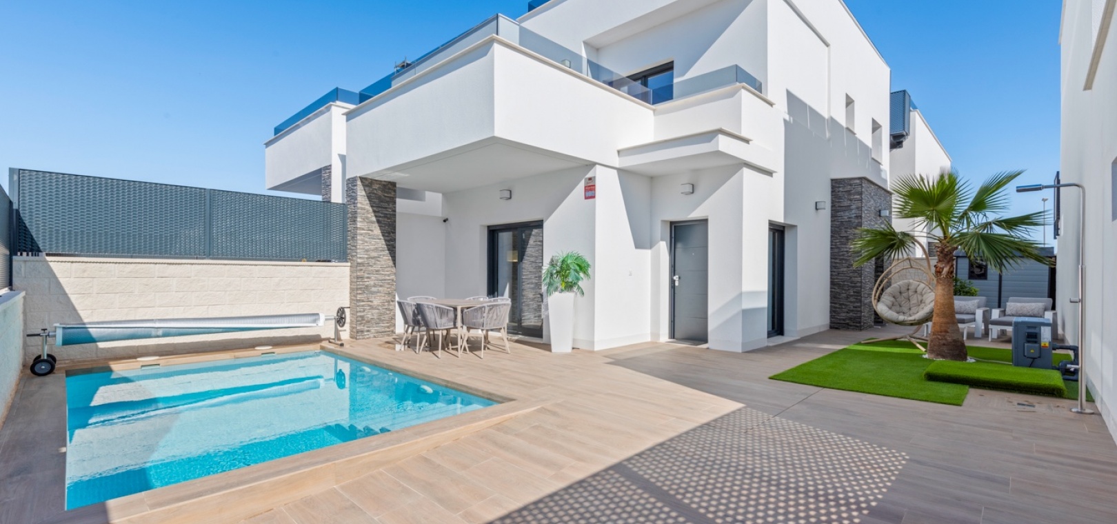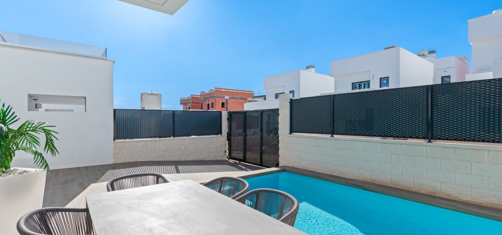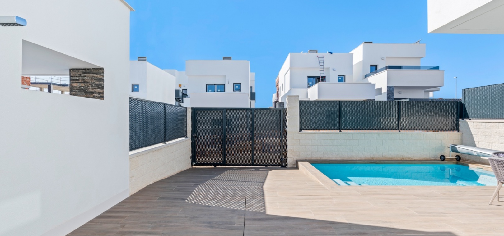 Willkommen in dieser luxuriösen Villa mit großartiger Lage in Vistabella Golf. Das Anwesen wurde 2024 fertiggestellt und verfügt über einen hohen Standard und großartige Außenbereiche mit privaten Terrassen, Garten und einem privaten beheizten Pool. Die Villa erstreckt sich über zwei Etagen. Im Erdgeschoss finden Sie das Wohnzimmer mit offener Küche, ein Schlafzimmer und ein Badezimmer. Im zweiten Stock haben Sie zwei weitere Schlafzimmer mit eigenem Bad. Vom Hauptschlafzimmer aus haben Sie Zugang zu einer geräumigen Terrasse. Vom zweiten Stock aus können Sie die Treppe hinauf zum großen Solarium nehmen. Hier haben Sie viel Platz, um die Sonne und die herrliche Aussicht auf die Umgebung zu genießen. Das Anwesen hat Sonnenkollektoren installiert. Auf dem Grundstück gibt es Parkplätze. Für weitere Informationen oder um einen Besichtigungstermin zu vereinbaren, kontaktieren Sie uns!