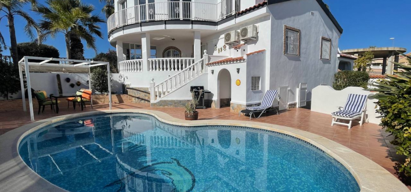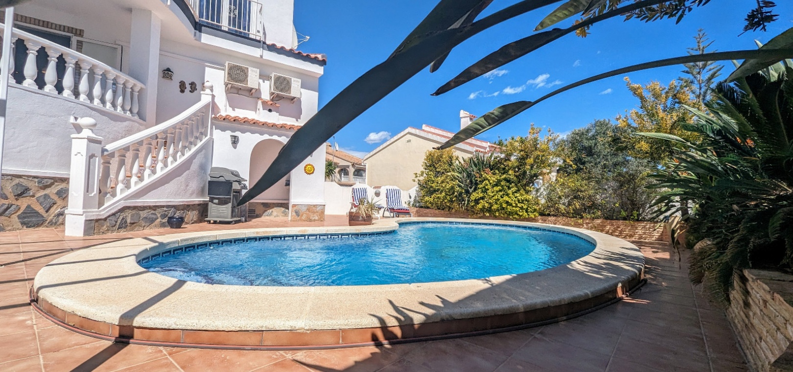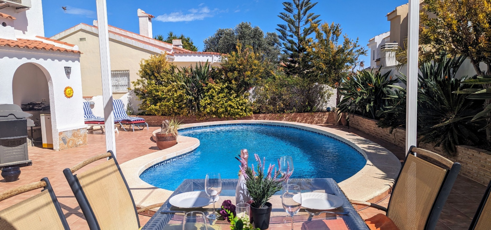 Außerhalb des Anwesens gibt es eine überdachte Vorderterrasse, einen schönen privaten Pool, einen Grillbereich und vieles mehr.