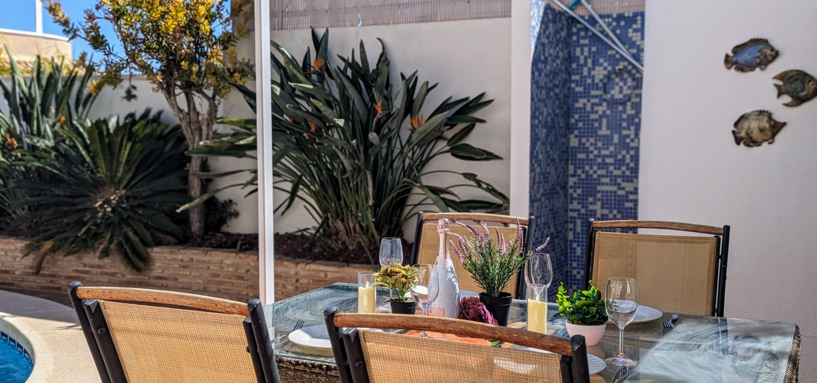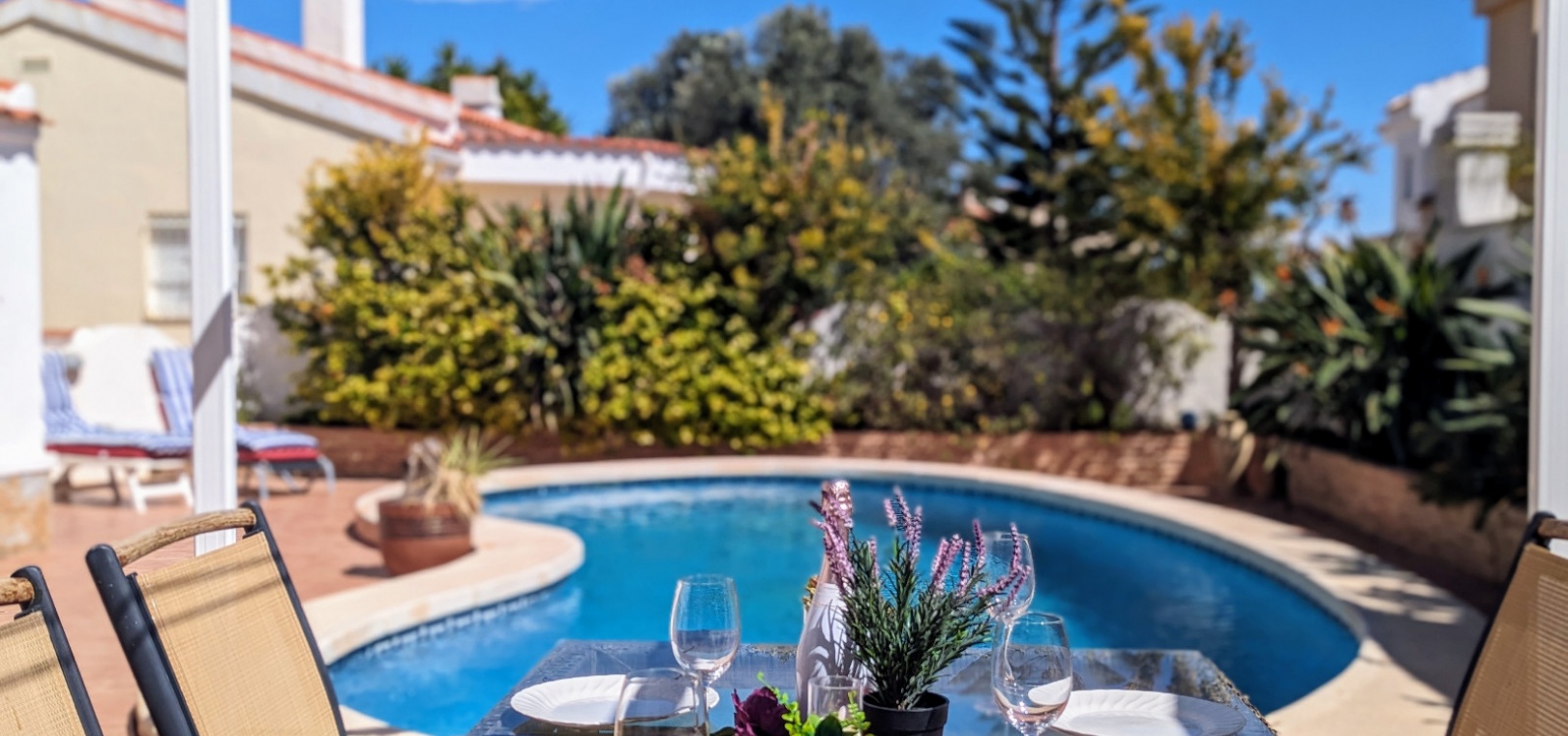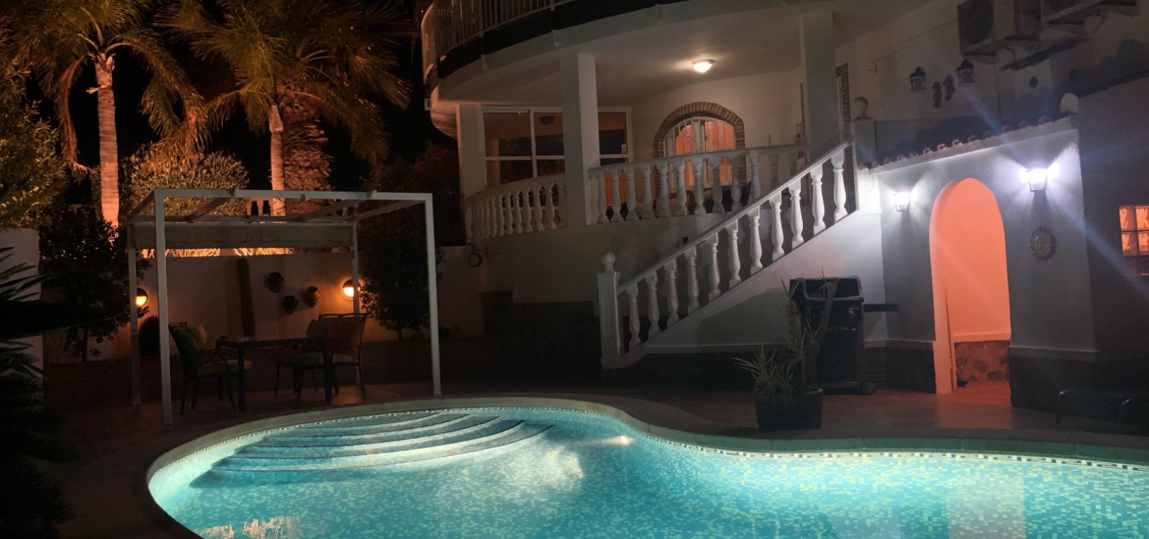 Außerhalb des Anwesens gibt es eine überdachte Vorderterrasse, einen schönen privaten Pool, einen Grillbereich und vieles mehr.