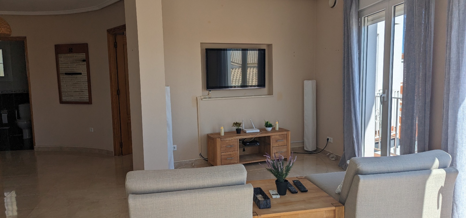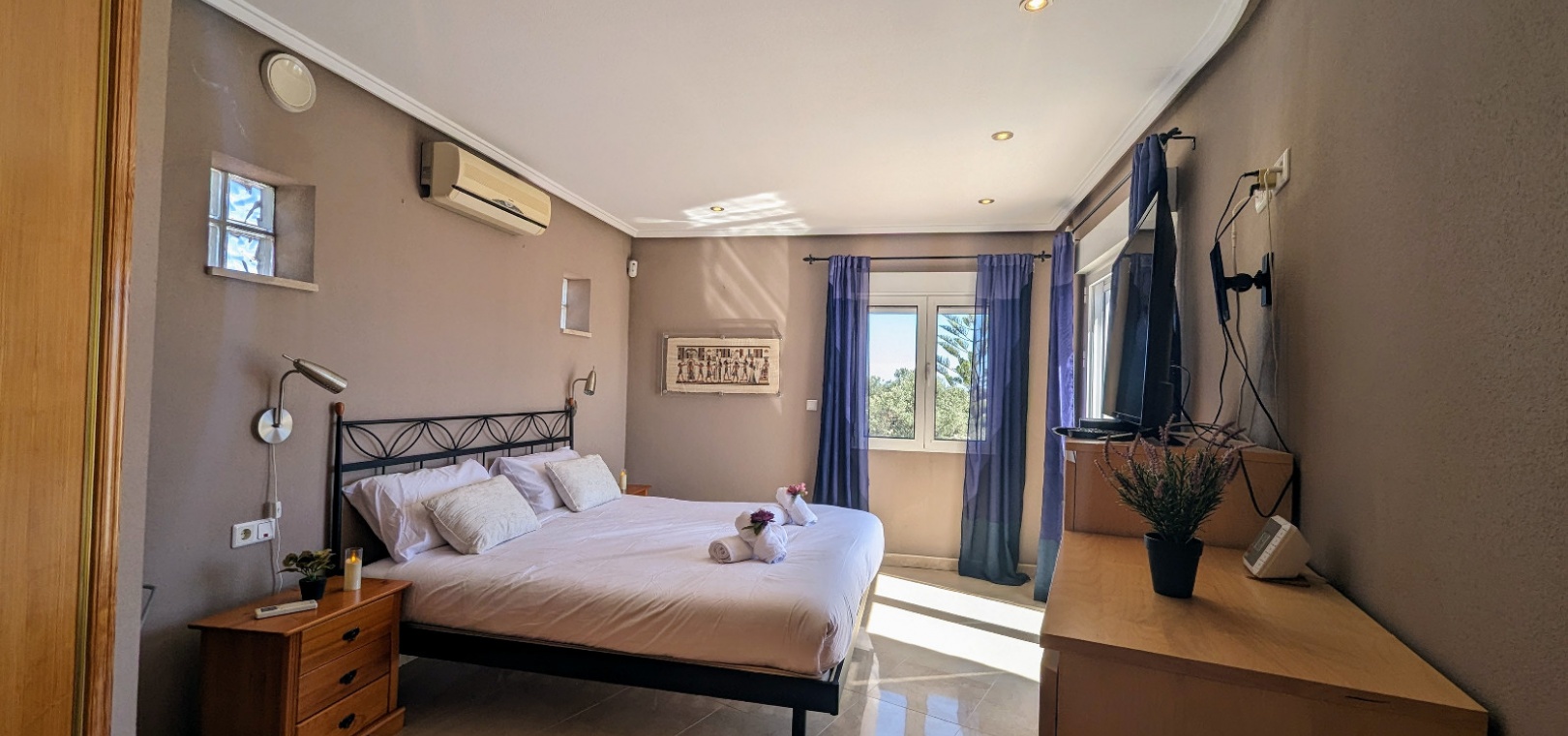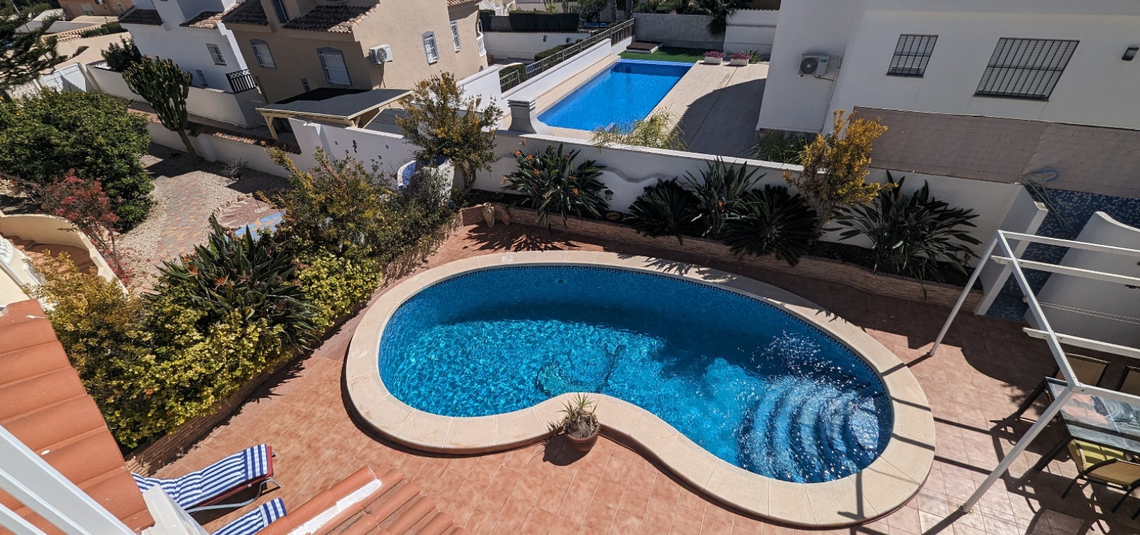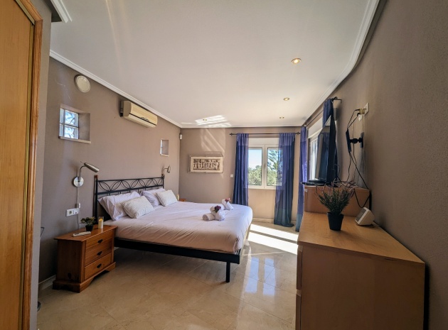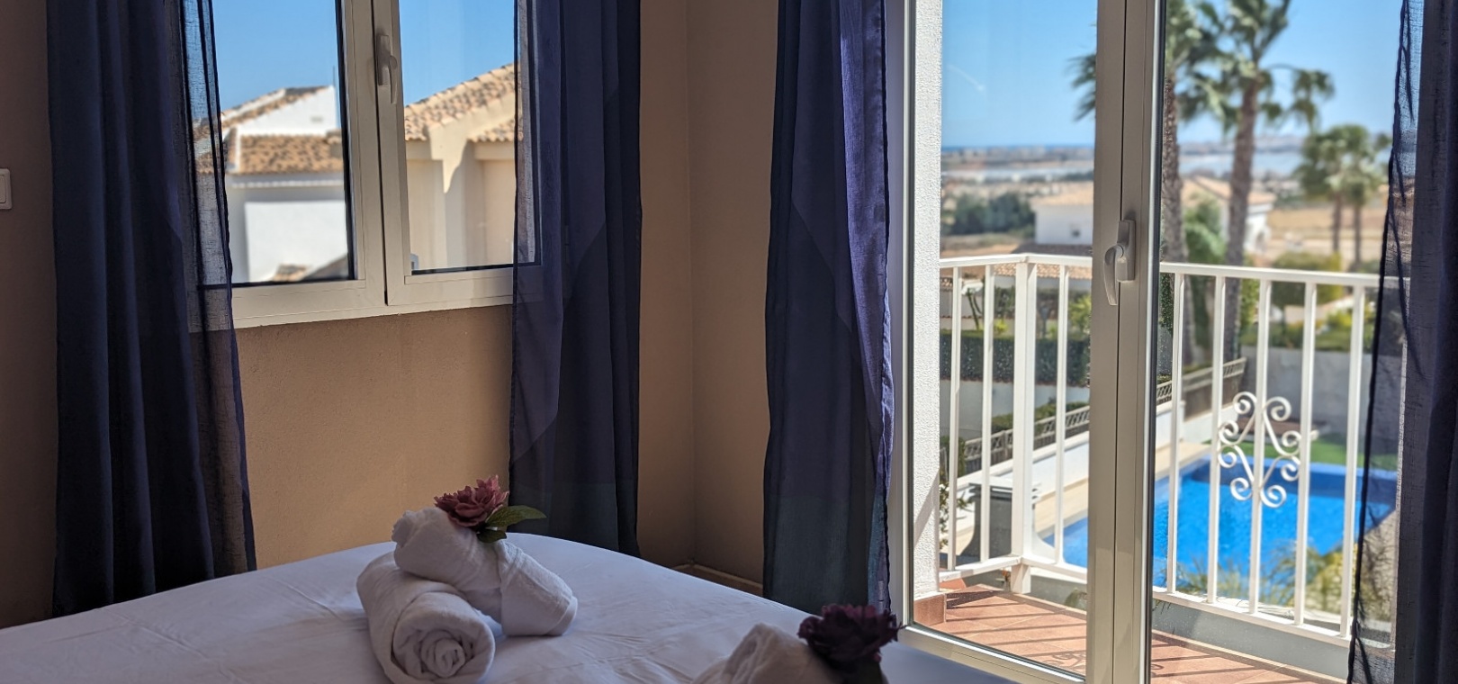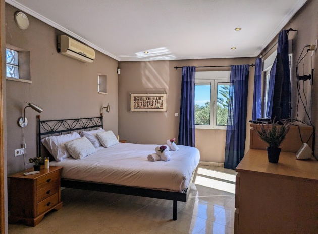 Im Obergeschoss befindet sich das Hauptschlafzimmer mit eigenem Bad, einem zweiten Wohnbereich und einem kleinen Balkon mit Blick auf den Pool.