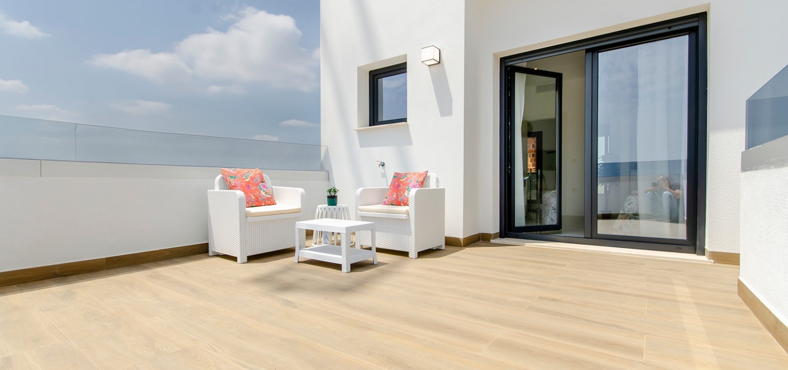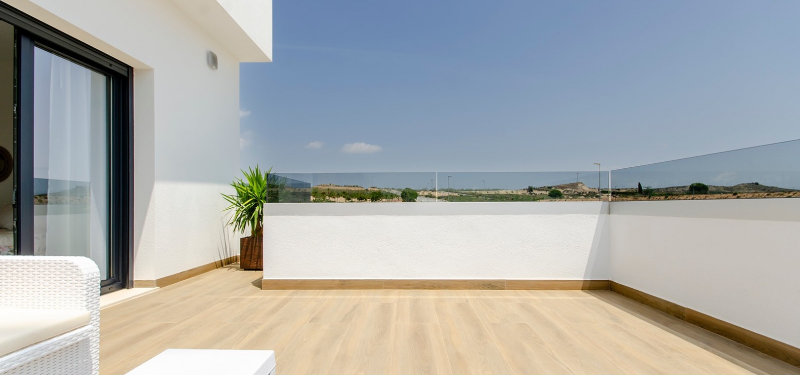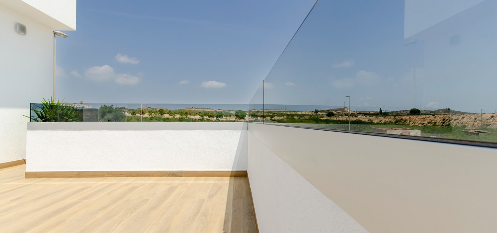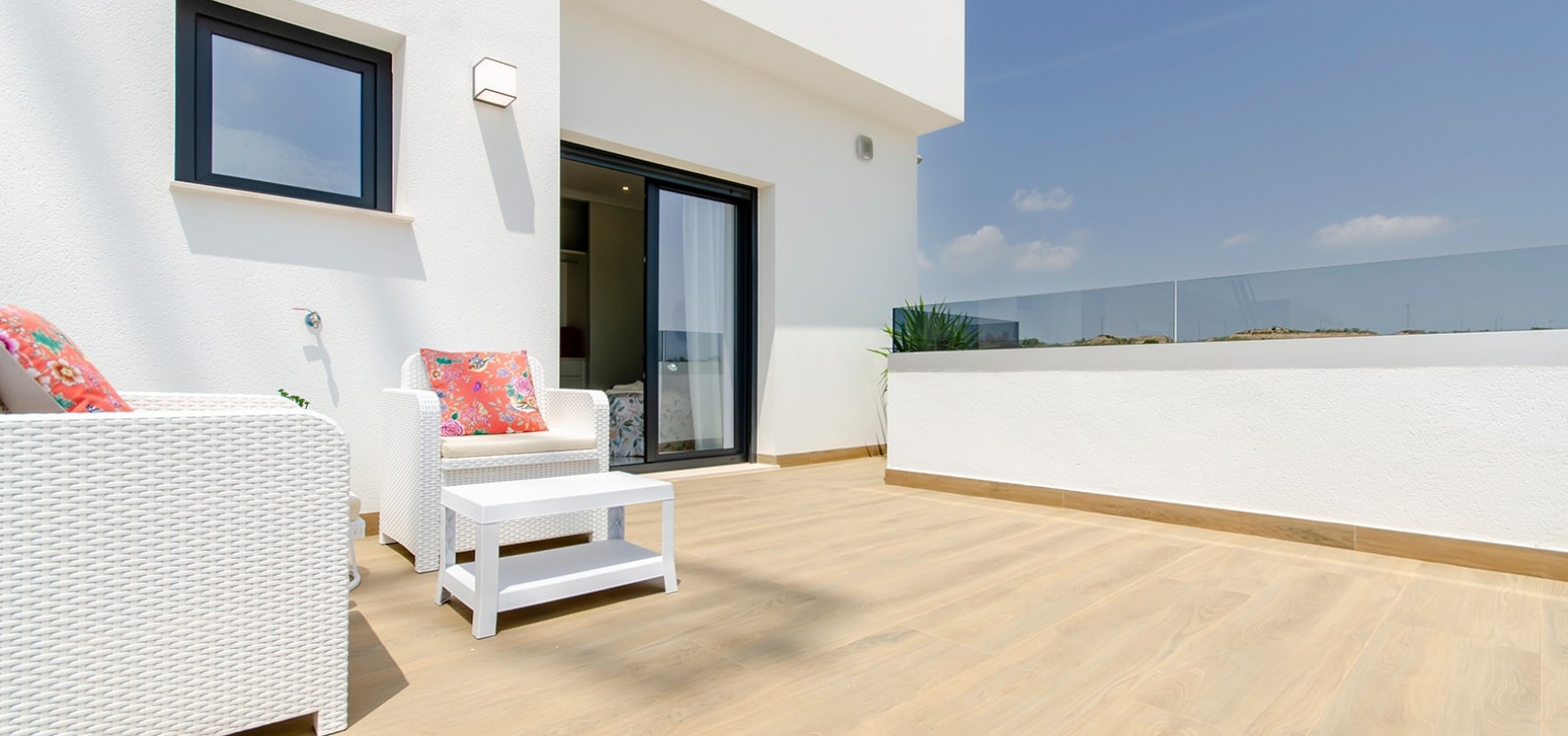 Im Obergeschoss bietet das Hauptschlafzimmer eine Oase der Entspannung mit Einbauschränken, eigenem Bad und privater Sonnenterrasse. Ein weiteres großzügiges Schlafzimmer mit Einbauschränken und eigenem Bad bietet reichlich Platz für Bewohner oder Gäste. Darüber hinaus bietet die Option, ein privates Solarium auf dem Dach zu integrieren, atemberaubende Ausblicke auf die Landschaft und ganztägigen Sonnenschein.