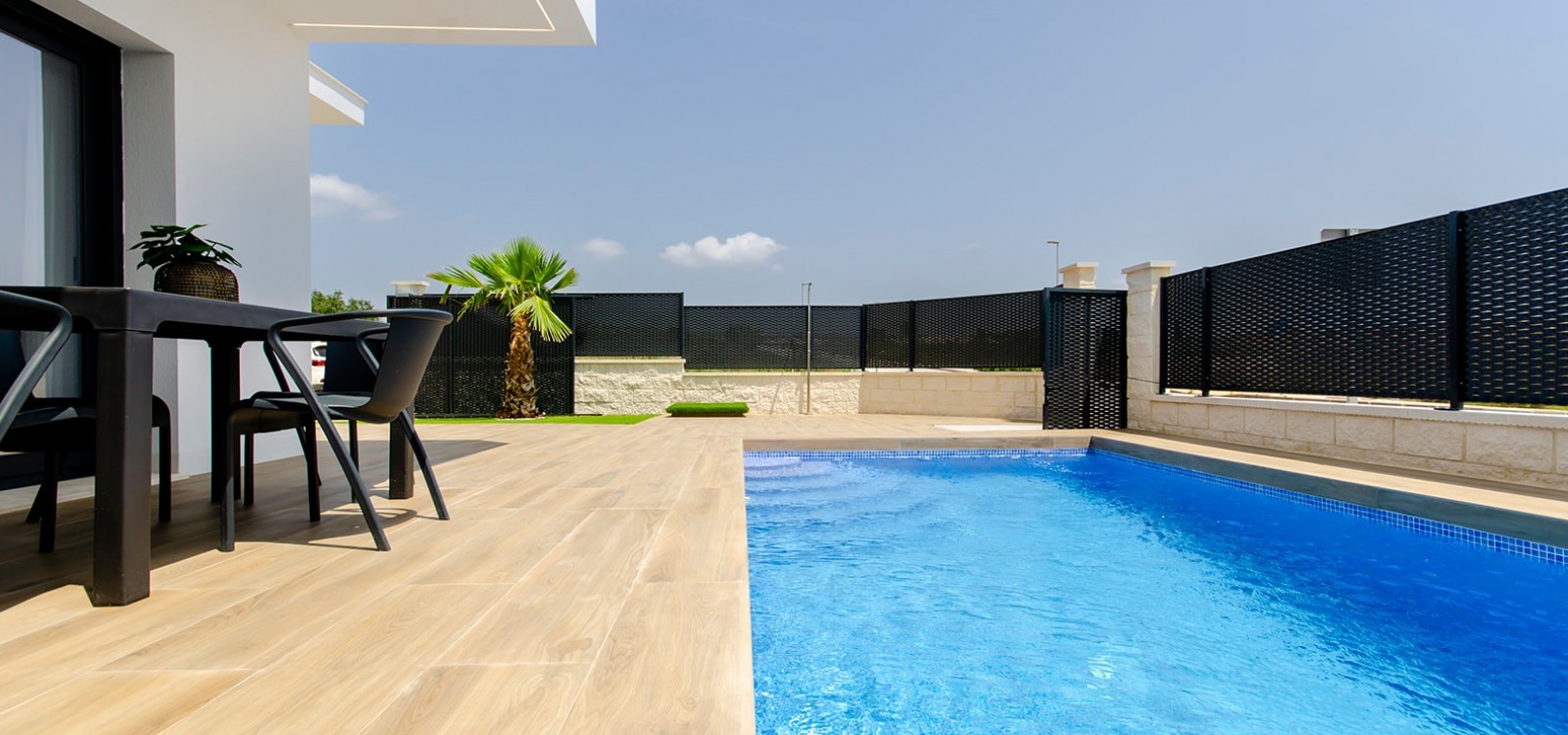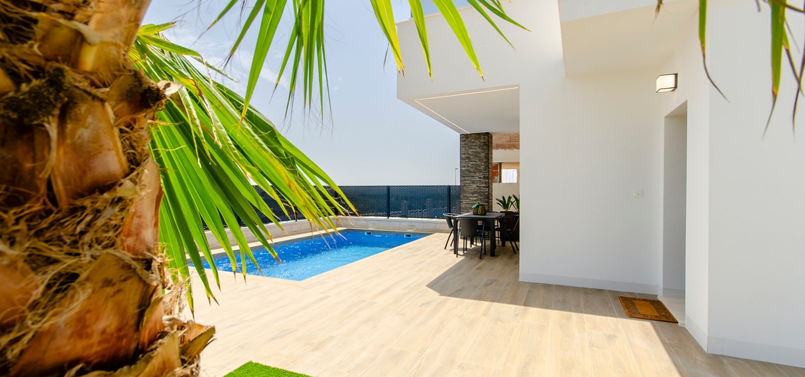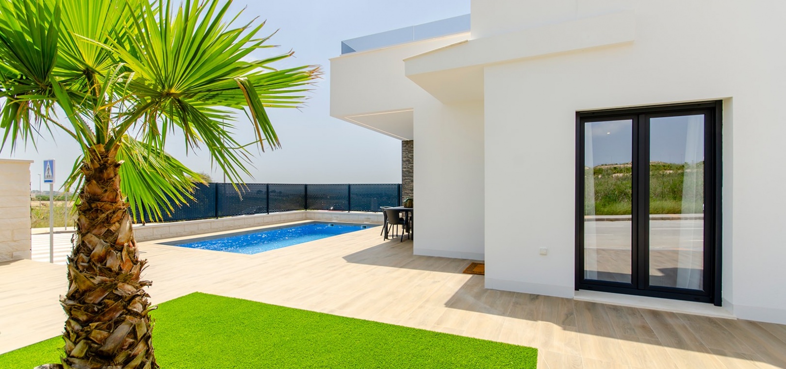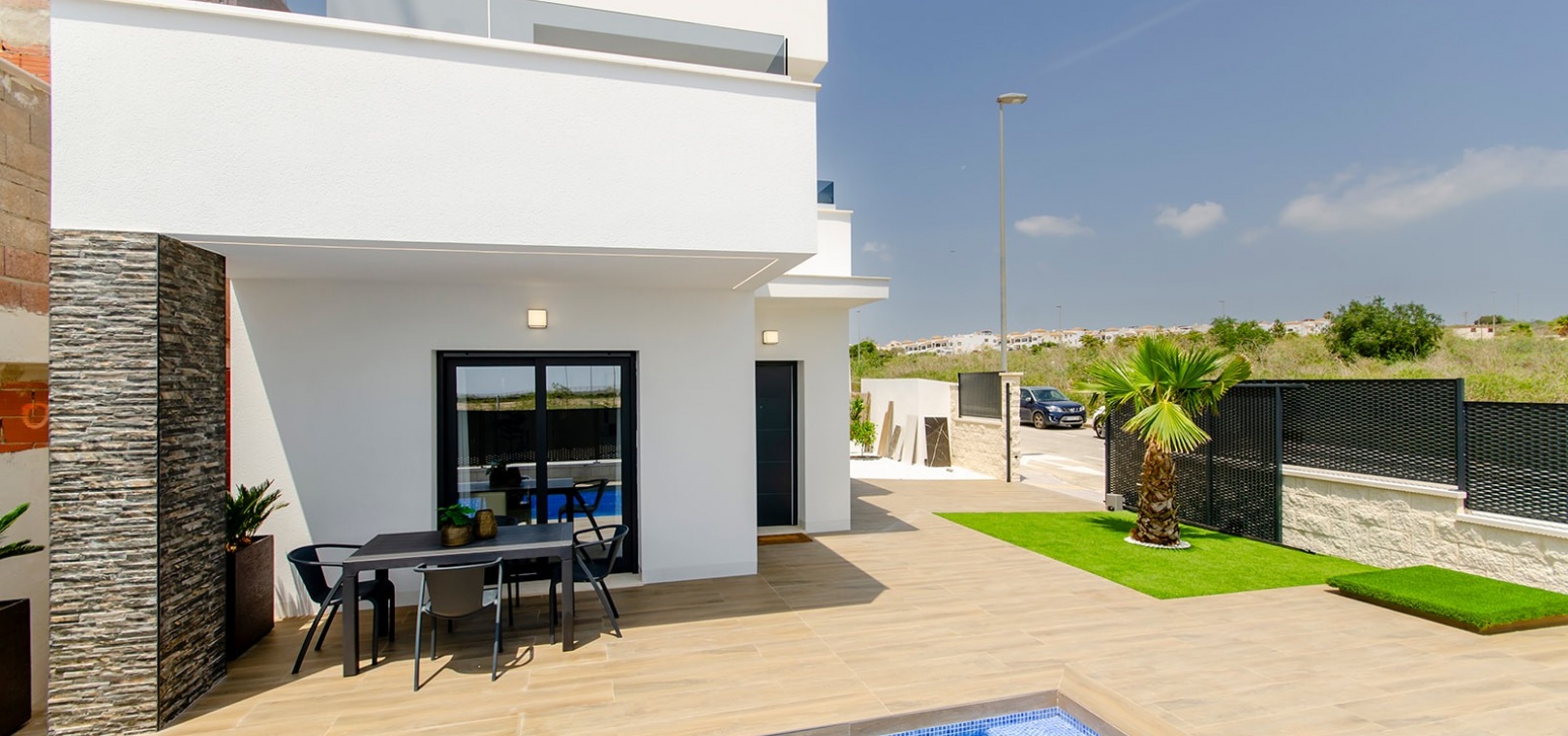Das Design der Villa betont Komfort und Eleganz, mit einem geräumigen Wohnzimmer mit Zugang zum Garten- und Poolbereich, einer offenen Küche und einem Essbereich sowie einem Gästezimmer mit Einbauschränken und einem Badezimmer im Erdgeschoss.