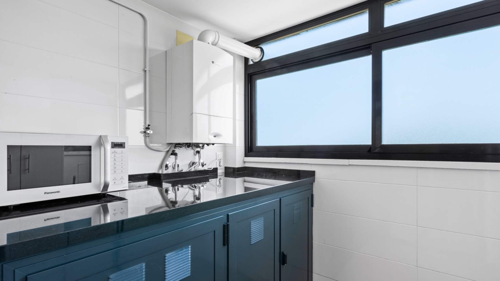 Die Wohnung ist mit einer zentralen Gasheizung, einer zentralen Klimaanlage, einem Alarmsystem und einer Sicherheitseingangstür ausgestattet. Sie befindet sich im 8. Stock mit Zugang über einen Aufzug.