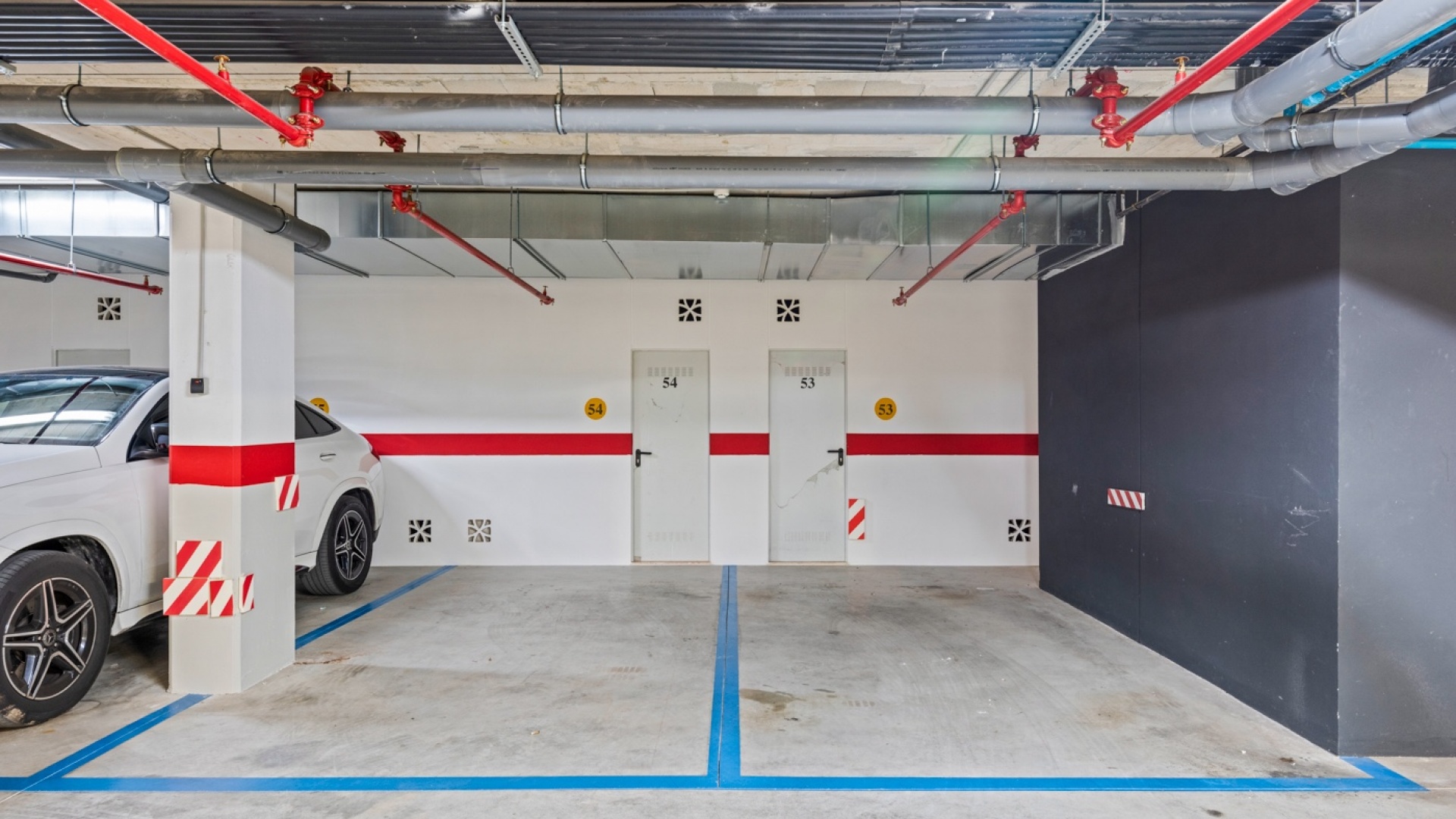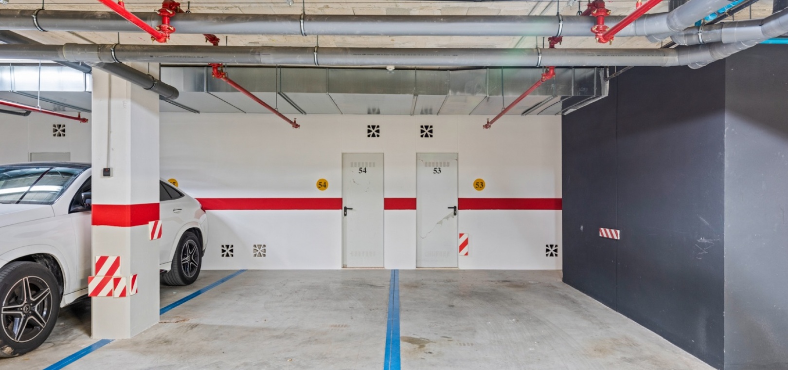 Die Wohnung umfasst zwei Parkplätze und zwei Abstellräume in der Tiefgarage.