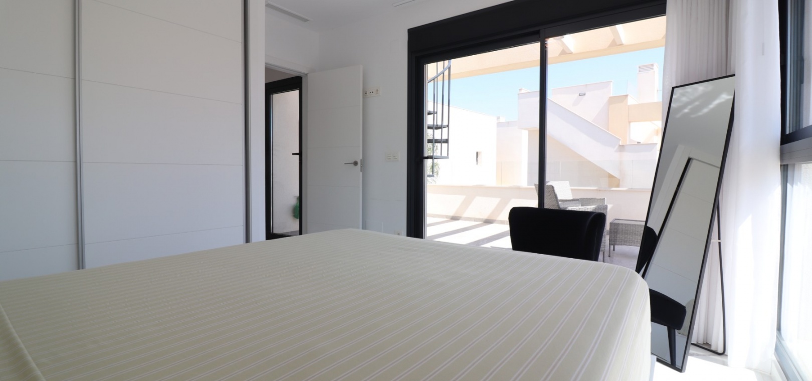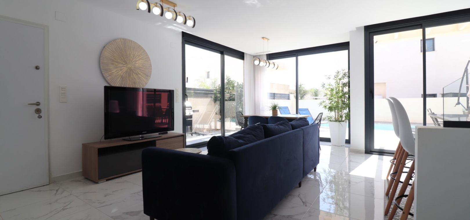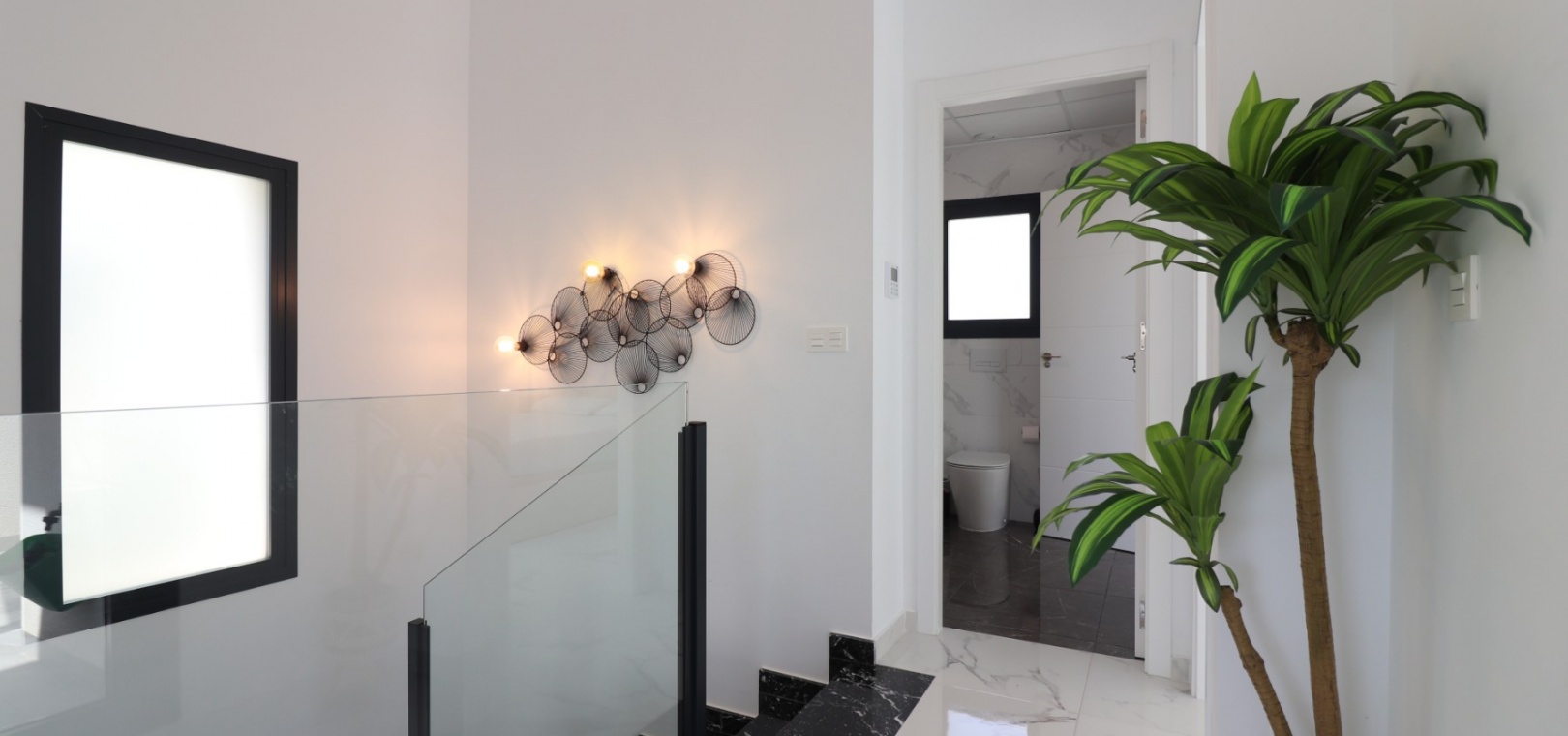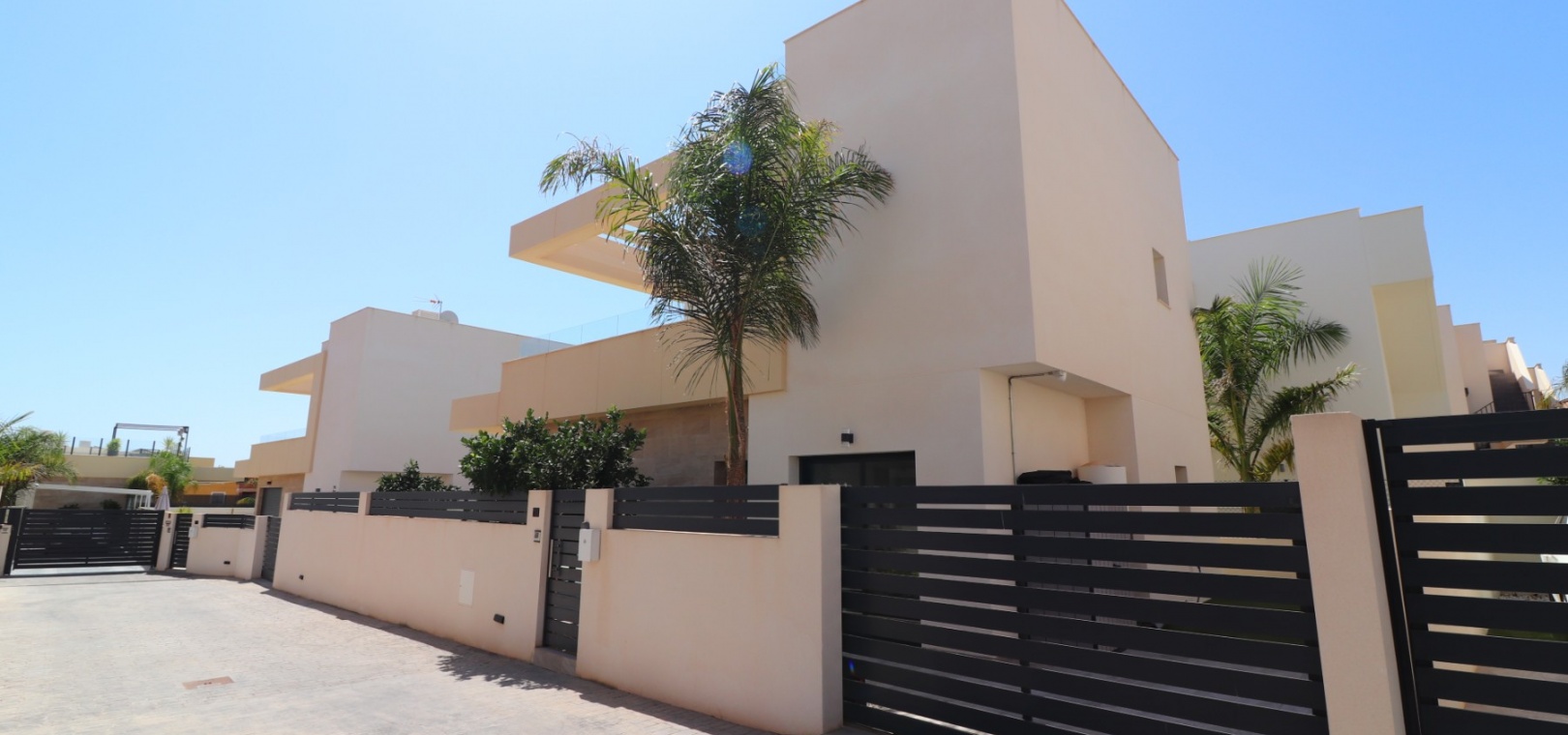 Diese neuwertige, nach Süden ausgerichtete, freistehende Villa mit drei Schlafzimmern in La Herrada, Los Montesinos, liegt nur 5 Gehminuten von den Annehmlichkeiten und Einrichtungen der Urbanisation selbst und nur 15 Autominuten vom Strand entfernt. Die Villa verfügt über zwei Duschräume, eine Garderobe und eine offene Küche. Das riesige Solarium auf dem Dach bietet einen atemberaubenden Blick auf den See. Zu den weiteren Ausstattungsmerkmalen gehören elektrische Rollläden, Klimaanlage im gesamten Gebäude und Einbauschränke in allen drei Schlafzimmern, wobei zwei Schlafzimmer über ein eigenes Bad verfügen. Im Außenbereich verfügt das Anwesen über einen privaten gefliesten und mit Kunstrasen bepflanzten Garten, einen privaten 6,5 x 3 m großen Pool und einen schattigen Terrassenbereich neben dem Pool, der sich perfekt zum Entspannen eignet. Parkplätze abseits der Straße sind vorhanden und zwei der Schlafzimmer führen auf eine schön große, schattige Terrasse mit leichtem Blick auf den See im ersten Stock. Diese moderne Villa, Baujahr 2021, befindet sich an der Costa Blanca Süd, bietet hochwertige Oberflächen, eine Baufläche von 135 m² auf einem 213 m² großen Grundstück und hat keine Gemeinschaftsgebühren. DIESES ANWESEN VERFÜGT AUCH ÜBER EINE TOURISTISCHE LIZENZ!