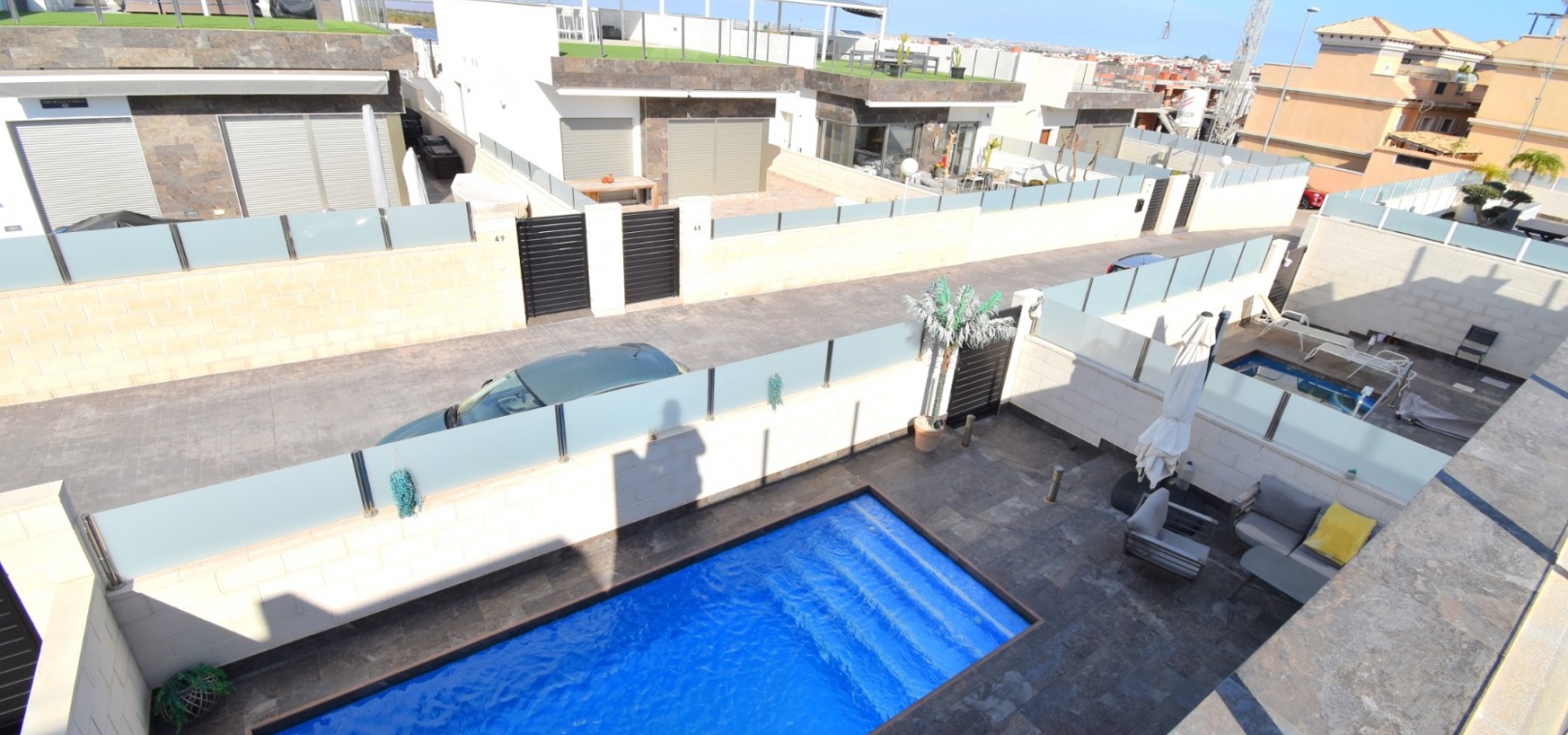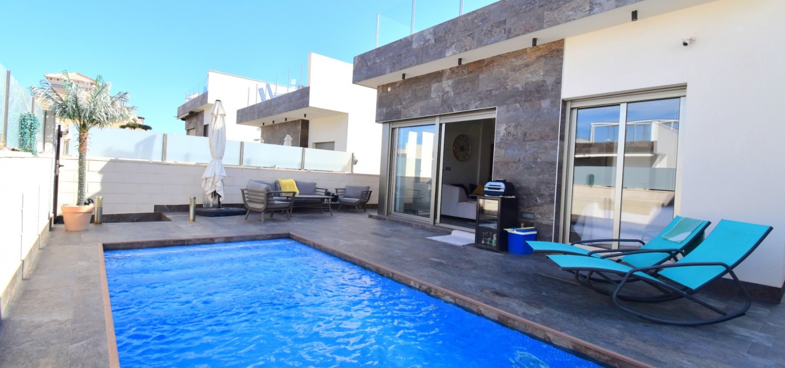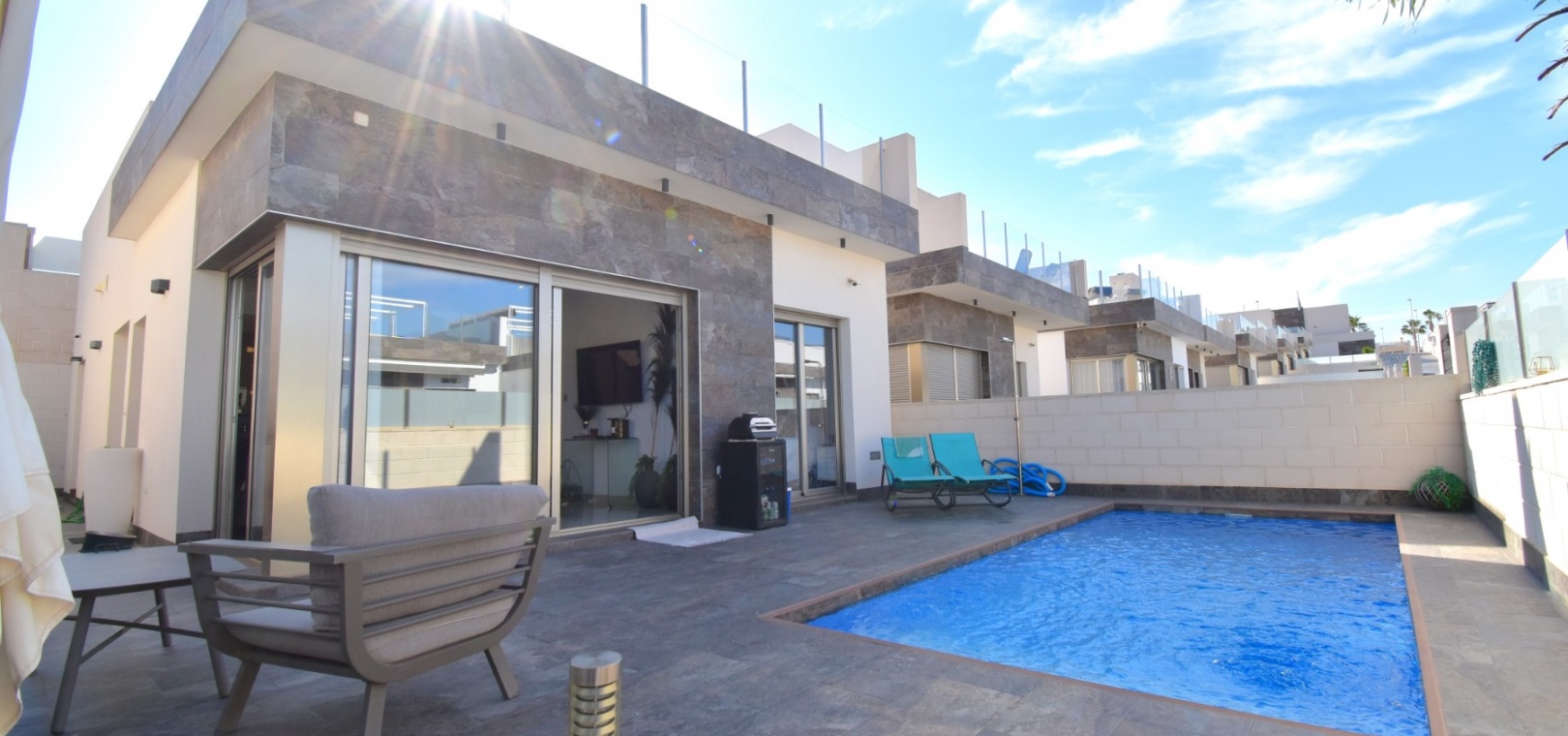 Diese atemberaubende, nach Südosten ausgerichtete, freistehende Villa mit drei Schlafzimmern in Villamartin befindet sich in der begehrten Gegend Orihuela Costa an der Costa Blanca Süd. Diese Villa liegt nur 10 Gehminuten von den nächsten Geschäften und eine kurze Fahrt vom beliebten Einkaufszentrum La Zenia Boulevard entfernt und bietet sowohl Bequemlichkeit als auch Komfort. Die atemberaubenden Strände der Gegend sind nur 10 Autominuten entfernt und bieten die ideale Umgebung für einen entspannten mediterranen Lebensstil. Die Villa verfügt über drei geräumige Schlafzimmer, jedes mit Klimaanlage und Einbauschränken, die das ganze Jahr über Komfort gewährleisten. Das Hauptschlafzimmer verfügt außerdem über einen Deckenventilator für zusätzlichen Komfort. Die offene, voll ausgestattete Küche ist modern und praktisch und geht nahtlos in das Wohnzimmer über, das mit einer Klimaanlage ausgestattet ist. Darüber hinaus trägt ein separater Hauswirtschaftsraum zur Funktionalität des Raums bei. Der Außenbereich ist ebenso beeindruckend und verfügt über einen pflegeleichten gefliesten Garten, der einen privaten Swimmingpool umgibt. Der Sitzbereich im Freien überblickt den Pool und bietet den perfekten Platz, um das warme mediterrane Wetter zu genießen. Mit einem 200 m² großen Grundstück bietet diese Villa reichlich Platz zum Entspannen und Unterhalten. In erstklassiger Lage gelegen, bietet diese Villa eine außergewöhnliche Gelegenheit zum ganzjährigen Wohnen oder einen perfekten Urlaubsort in Orihuela Costa.