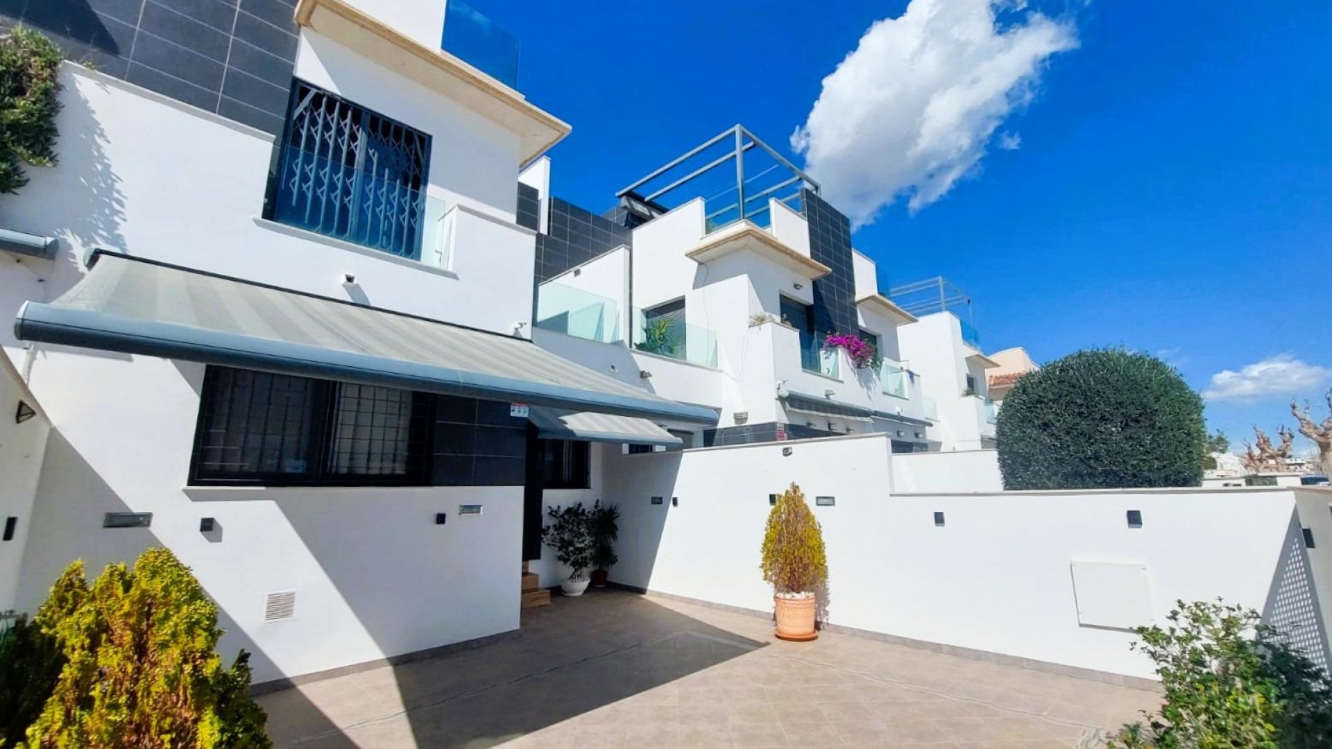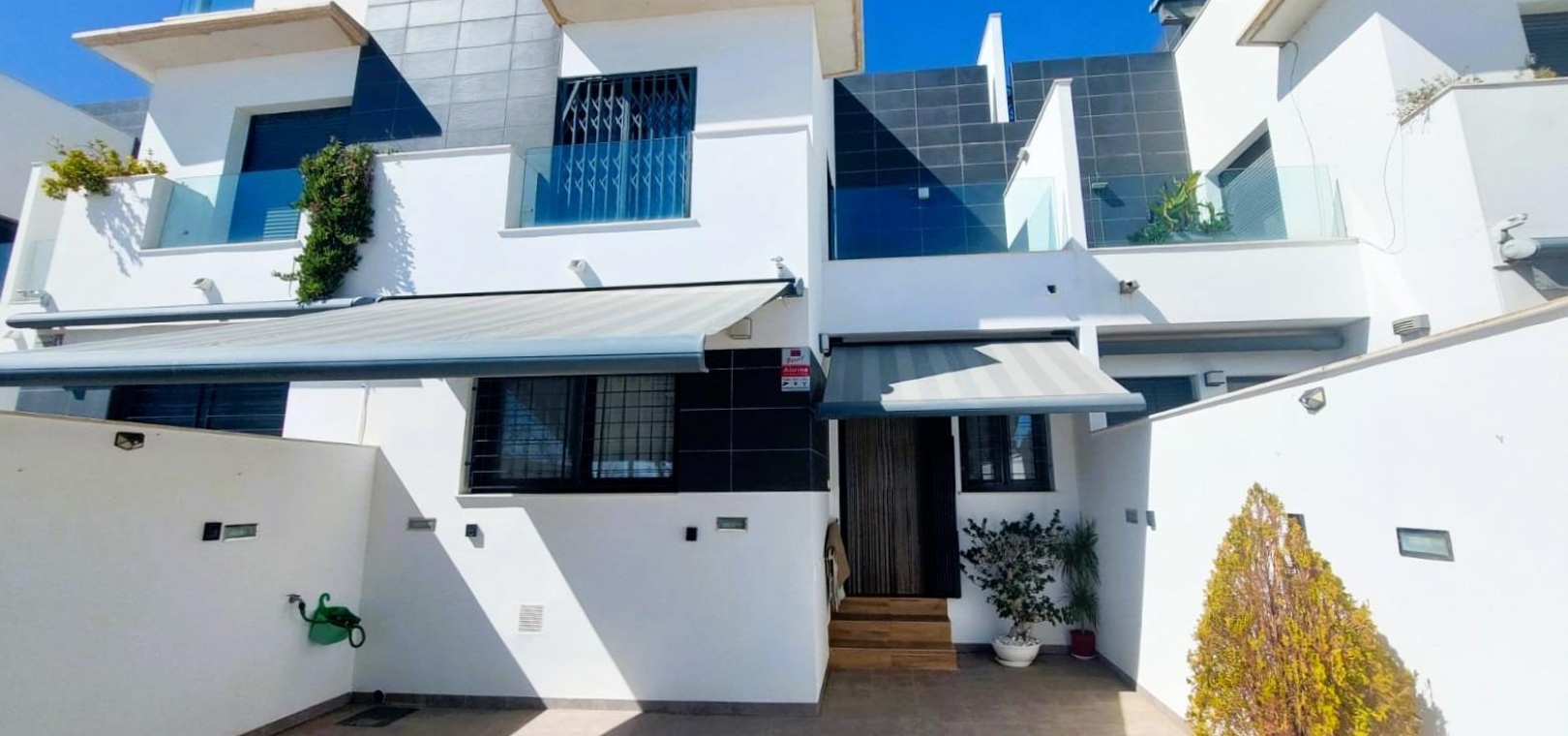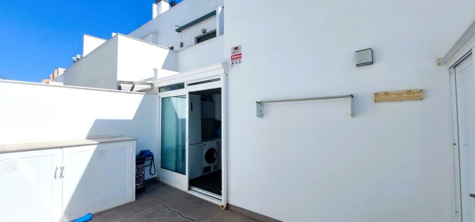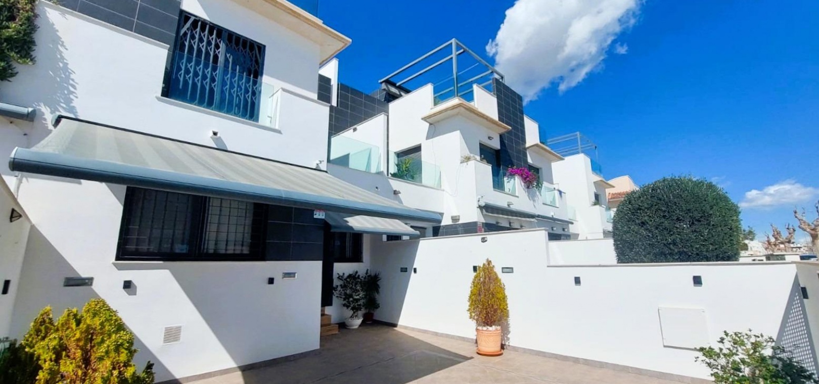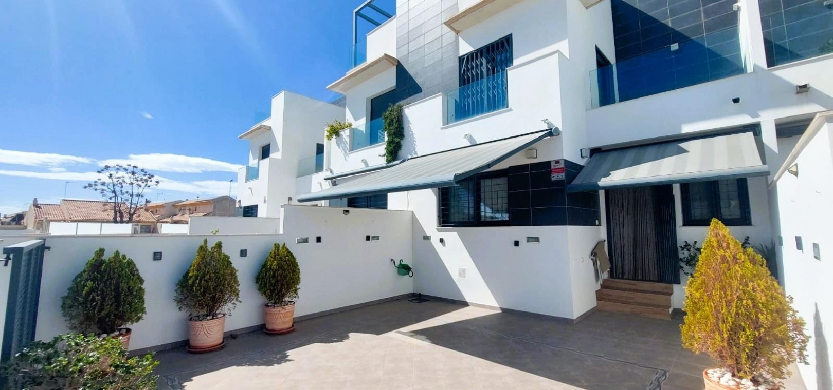 Verpassen Sie nicht die Gelegenheit, dieses schöne, geräumige und sonnige, halbneue Stadthaus zu besichtigen, das 2013 nach hohen Standards gebaut wurde und 7 Gehminuten von der Playa del Puerto in Torre de la Horadada entfernt liegt.~~Im Erdgeschoss haben wir einen hellen Garten mit automatischer Einfahrt für Fahrzeuge, ein geräumiges Wohn-Esszimmer mit Zugang zur Küche, einen Hauswirtschaftsraum, eine hintere Terrasse mit viel Stauraum, 1 Schlafzimmer mit Einbauschrank, 1 komplettes Badezimmer mit Dusche und einen Abstellraum/Speisekammer.~~Im ersten Stock gibt es 2 geräumige Doppelschlafzimmer mit Einbauschränken, 1 komplettes Badezimmer mit Dusche und Fenster. Jedes der Schlafzimmer hat Zugang zu einer Terrasse, von denen eine einen unverbauten Blick auf den Park bietet.~~Im dritten Stock gibt es eine 52 m² große Sonnenterrasse mit Meerblick.~~Es wird komplett möbliert und mit Elektrogeräten verkauft, alle praktisch neu. Es verfügt über 4 Klimaanlagen mit Warm-/Kaltpumpe und Deckenventilatoren in allen Räumen des Anwesens. Solarpanel für Warmwasser. Glatte Wände, Sicherheitstür, Sicherheitsgitter und Moskitonetze an Türen und Fenstern.~~Dieses fantastische Haus befindet sich in einer gepflegten Urbanisation mit einem schönen Pool. Es liegt in einer der besten Gegenden von Torre de la Horadada, sehr ruhig, gegenüber einem großen Park, 500 Meter vom Strand entfernt, umgeben von allen notwendigen Dienstleistungen und mit sehr guter Anbindung an die Autobahnen.~~Dies ist eine fantastische Gelegenheit, eine halbneue Villa in wunderschönem Zustand zu erwerben, ohne auf den Bau warten zu müssen, und die alle notwendigen Annehmlichkeiten beinhaltet.~~
