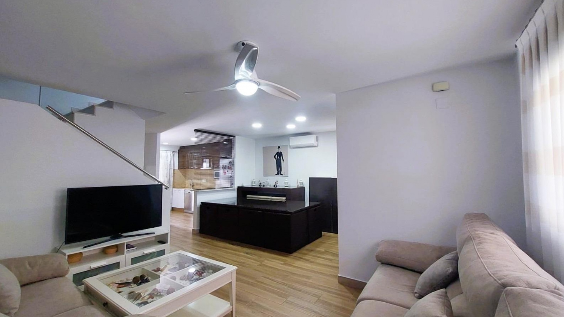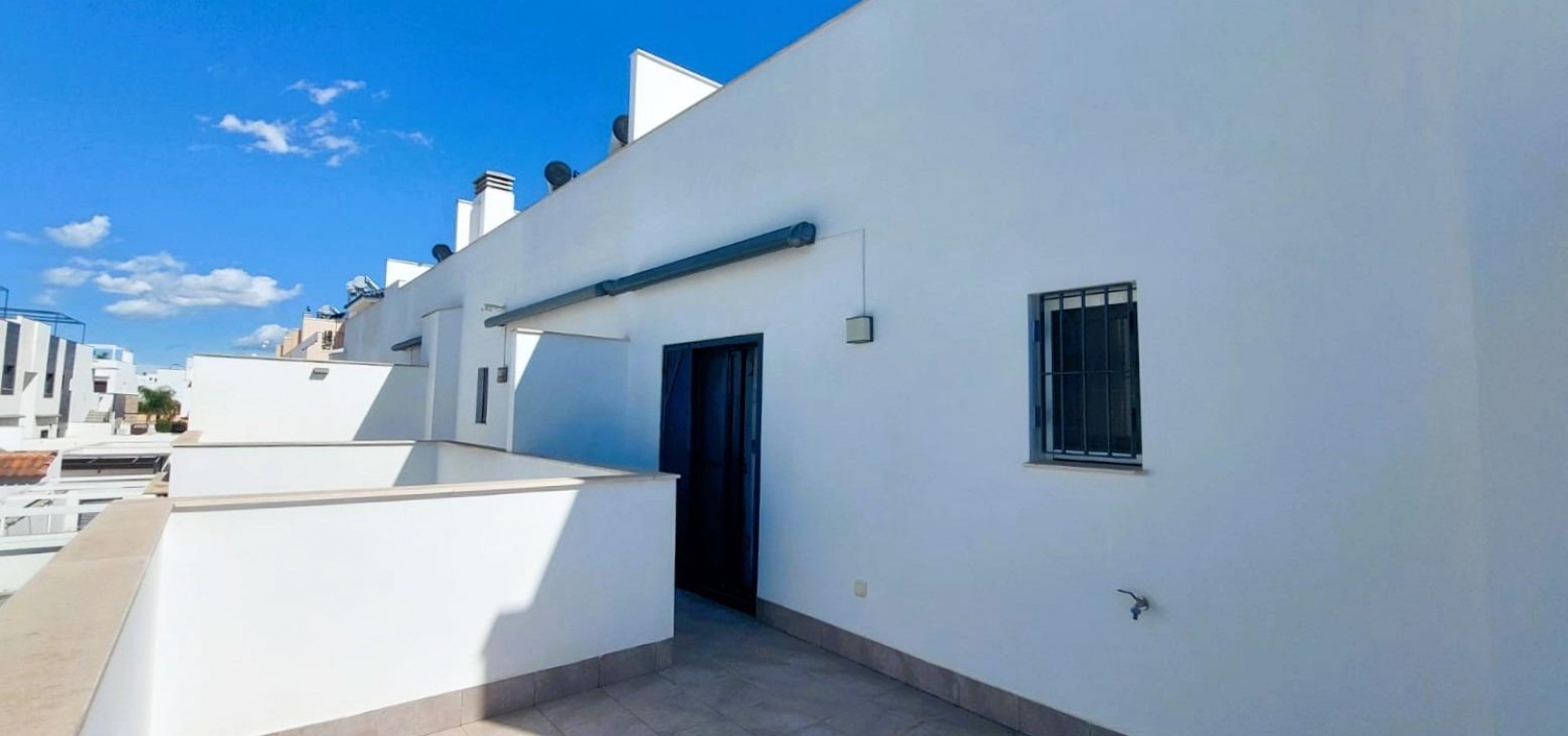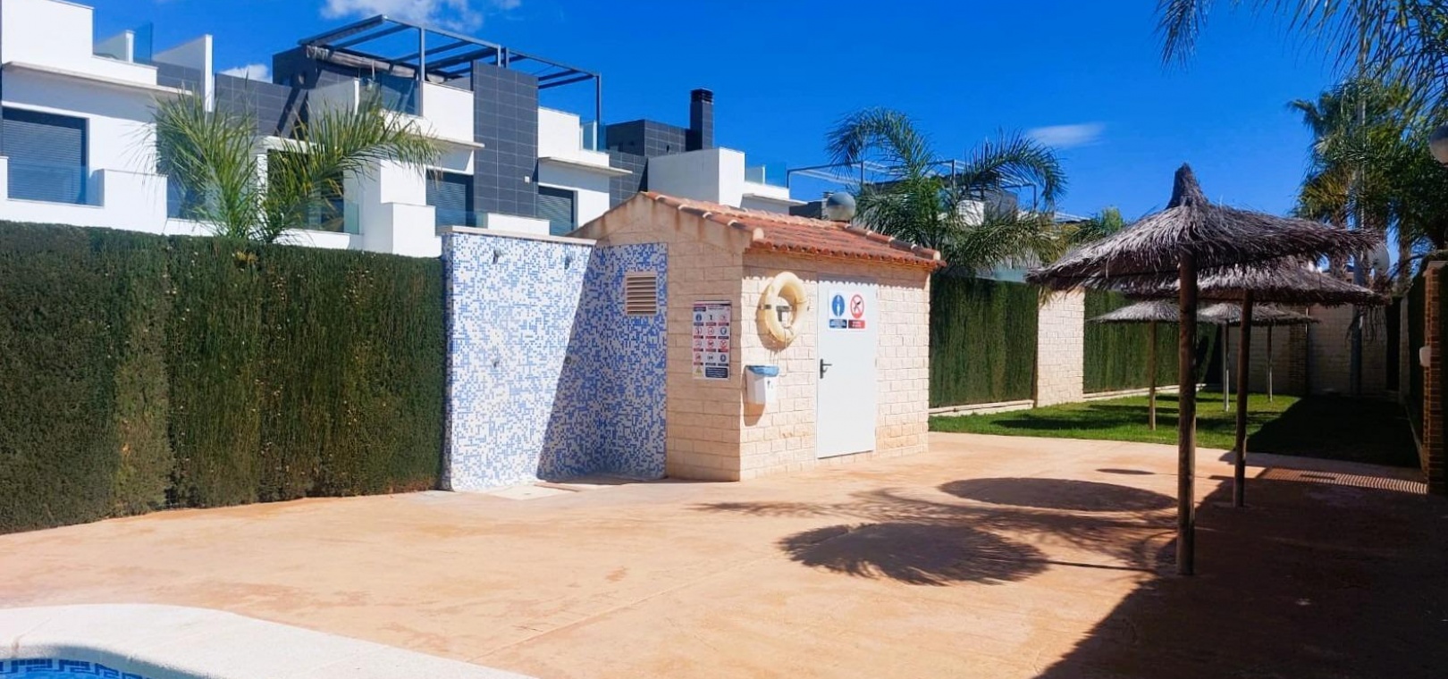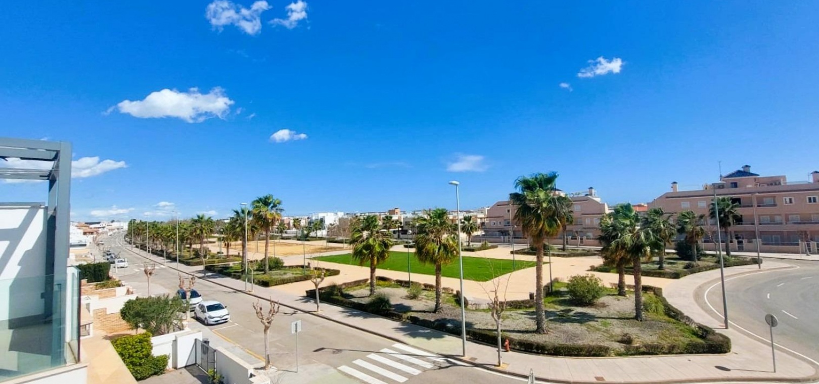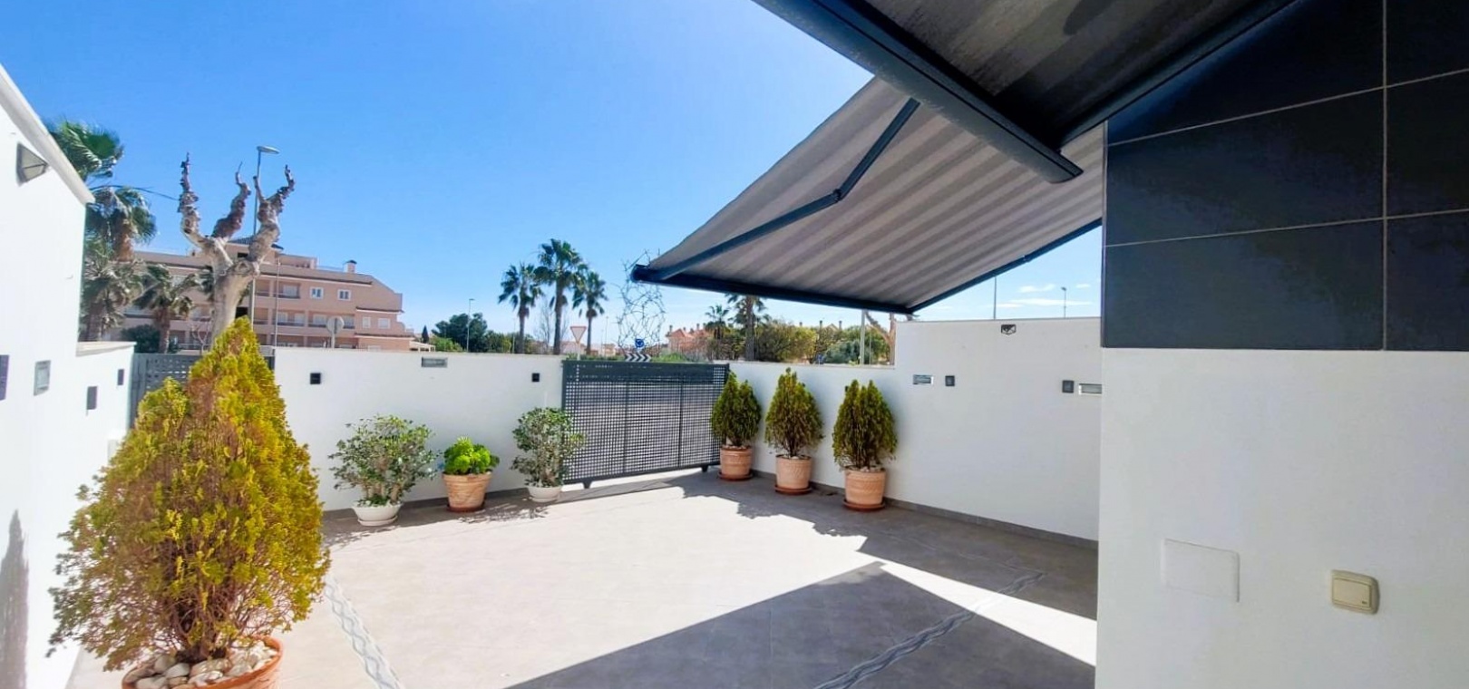 Verpassen Sie nicht die Gelegenheit, dieses schöne, geräumige und sonnige, halbneue Stadthaus zu besichtigen, das 2013 nach hohen Standards gebaut wurde und 7 Gehminuten von der Playa del Puerto in Torre de la Horadada entfernt liegt.~~Im Erdgeschoss haben wir einen hellen Garten mit automatischer Einfahrt für Fahrzeuge, ein geräumiges Wohn-Esszimmer mit Zugang zur Küche, einen Hauswirtschaftsraum, eine hintere Terrasse mit viel Stauraum, 1 Schlafzimmer mit Einbauschrank, 1 komplettes Badezimmer mit Dusche und einen Abstellraum/Speisekammer.~~Im ersten Stock gibt es 2 geräumige Doppelschlafzimmer mit Einbauschränken, 1 komplettes Badezimmer mit Dusche und Fenster. Jedes der Schlafzimmer hat Zugang zu einer Terrasse, von denen eine einen unverbauten Blick auf den Park bietet.~~Im dritten Stock gibt es eine 52 m² große Sonnenterrasse mit Meerblick.~~Es wird komplett möbliert und mit Elektrogeräten verkauft, alle praktisch neu. Es verfügt über 4 Klimaanlagen mit Warm-/Kaltpumpe und Deckenventilatoren in allen Räumen des Anwesens. Solarpanel für Warmwasser. Glatte Wände, Sicherheitstür, Sicherheitsgitter und Moskitonetze an Türen und Fenstern.~~Dieses fantastische Haus befindet sich in einer gepflegten Urbanisation mit einem schönen Pool. Es liegt in einer der besten Gegenden von Torre de la Horadada, sehr ruhig, gegenüber einem großen Park, 500 Meter vom Strand entfernt, umgeben von allen notwendigen Dienstleistungen und mit sehr guter Anbindung an die Autobahnen.~~Dies ist eine fantastische Gelegenheit, eine halbneue Villa in wunderschönem Zustand zu erwerben, ohne auf den Bau warten zu müssen, und die alle notwendigen Annehmlichkeiten beinhaltet.~~