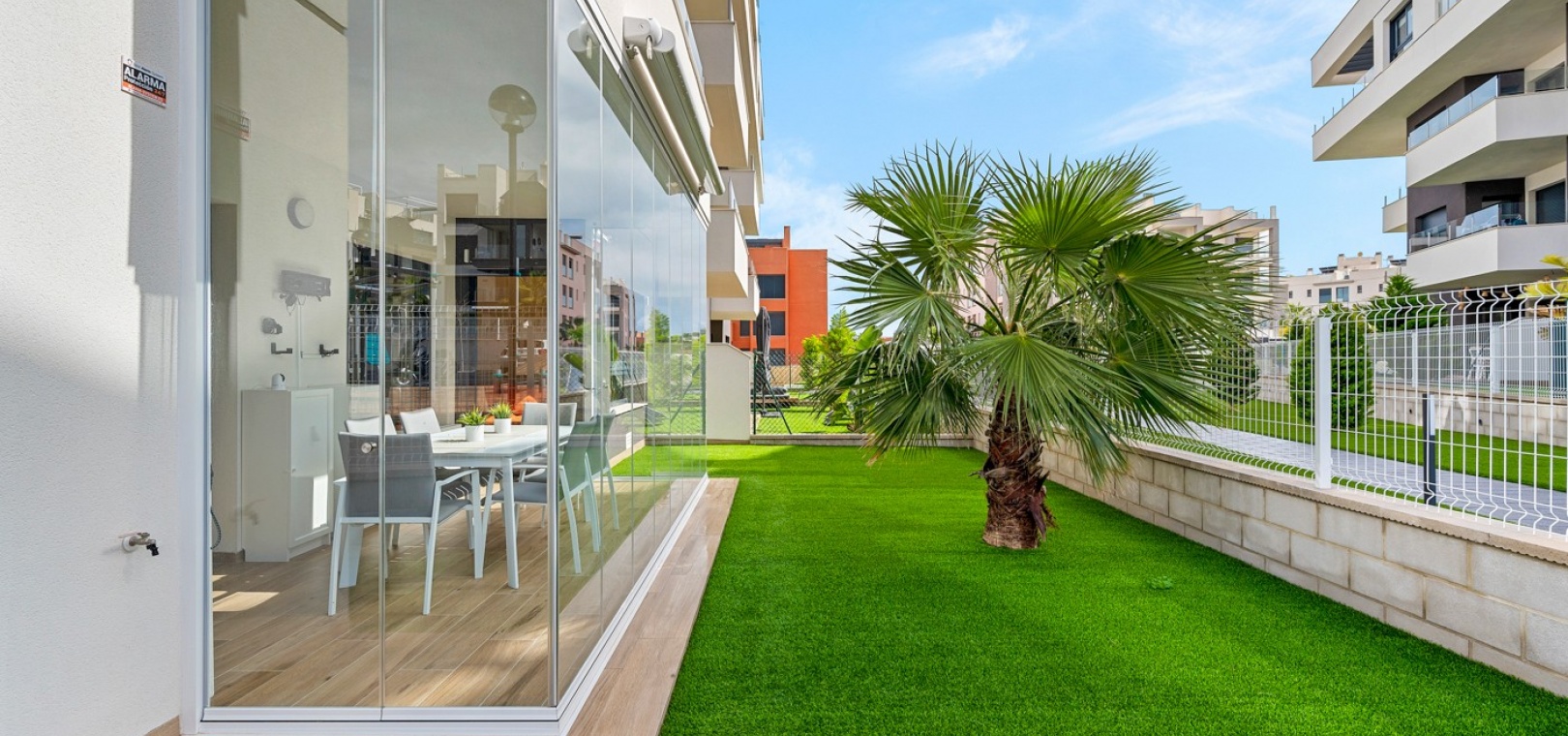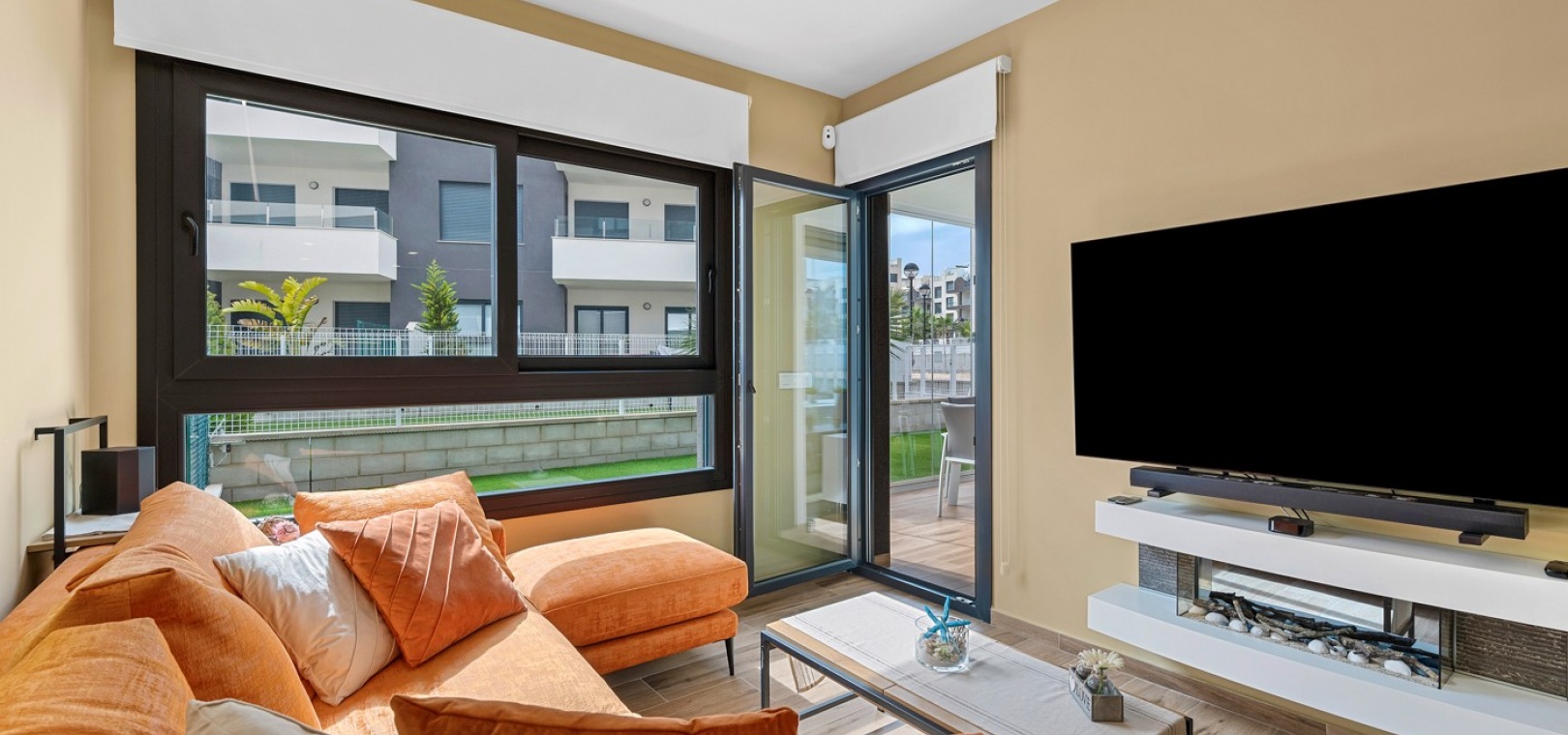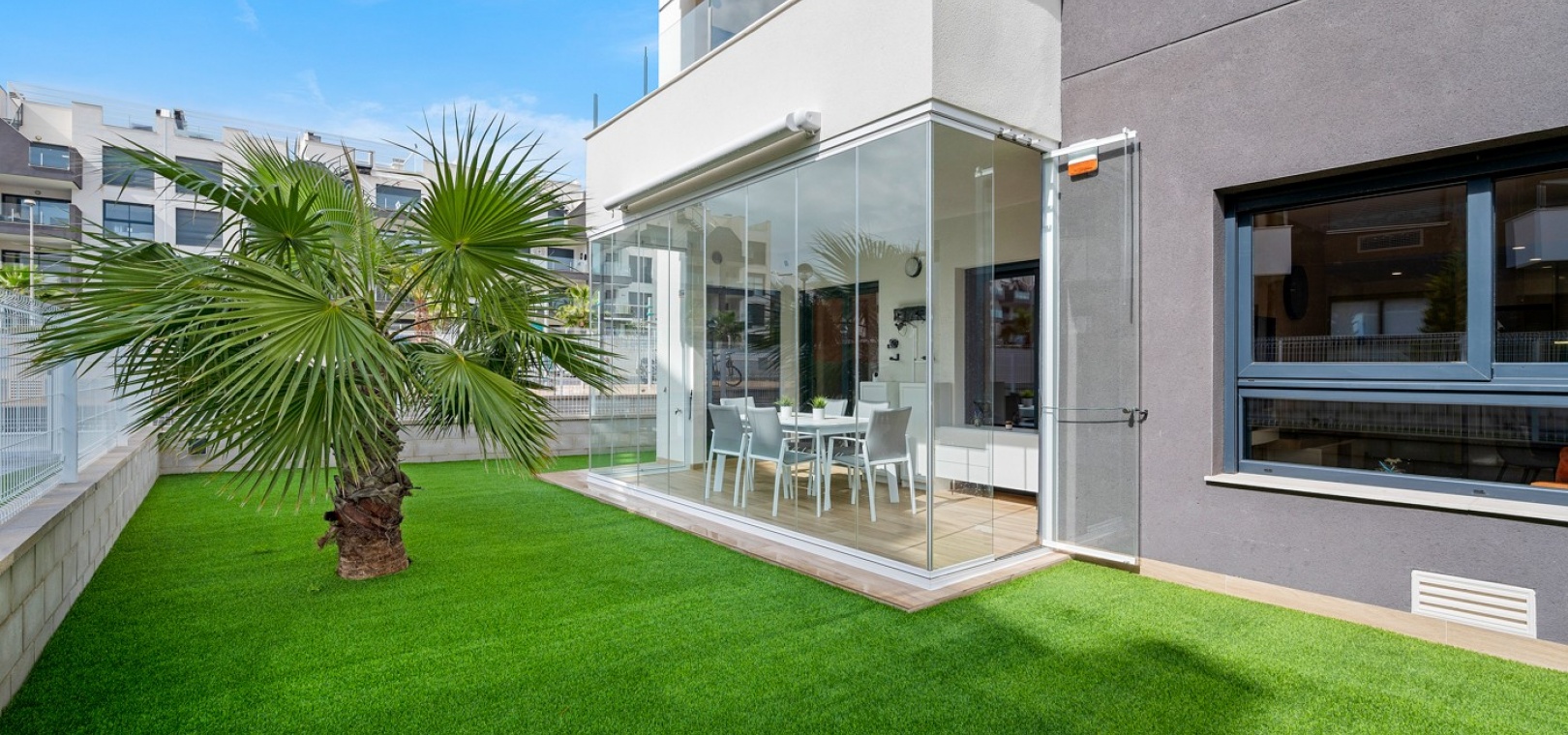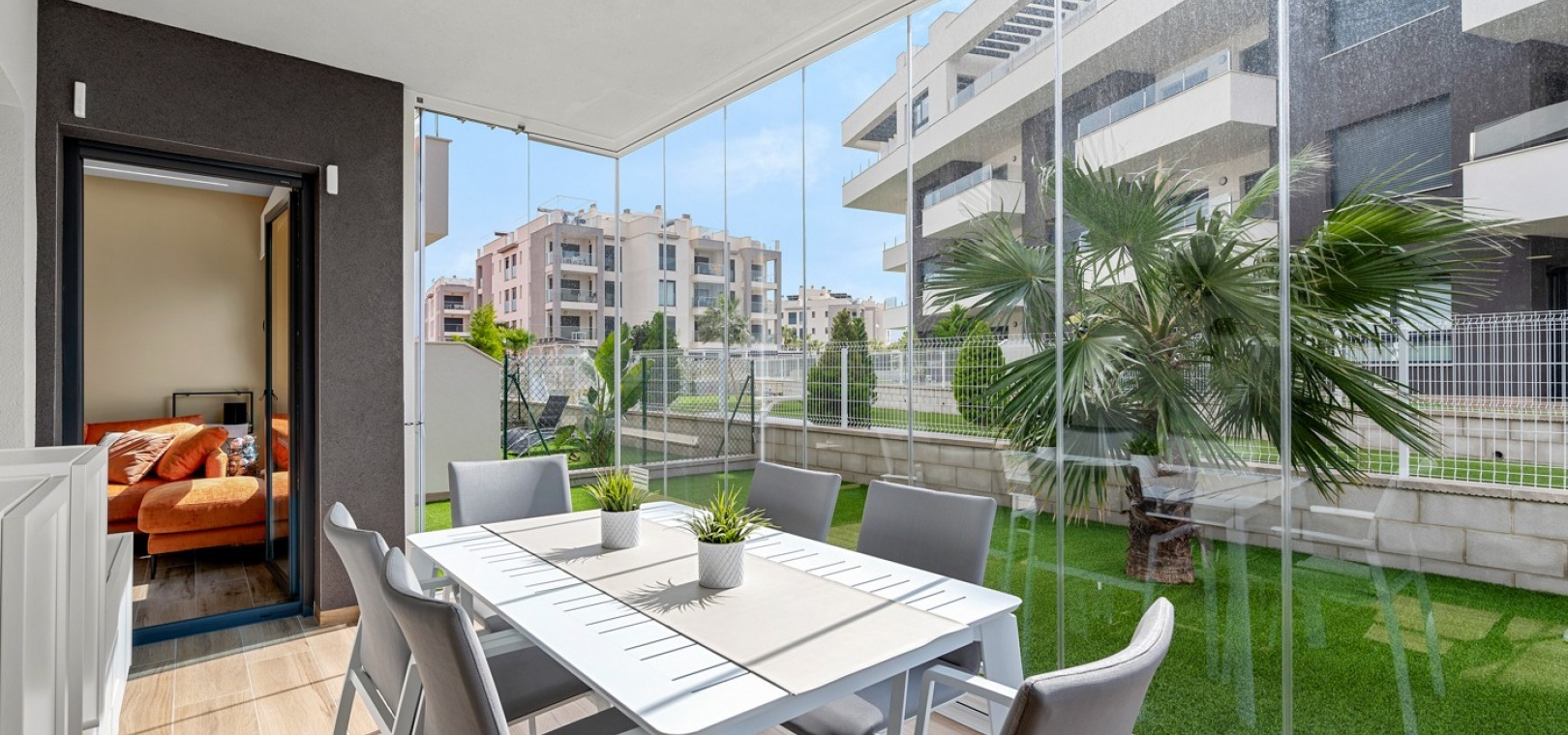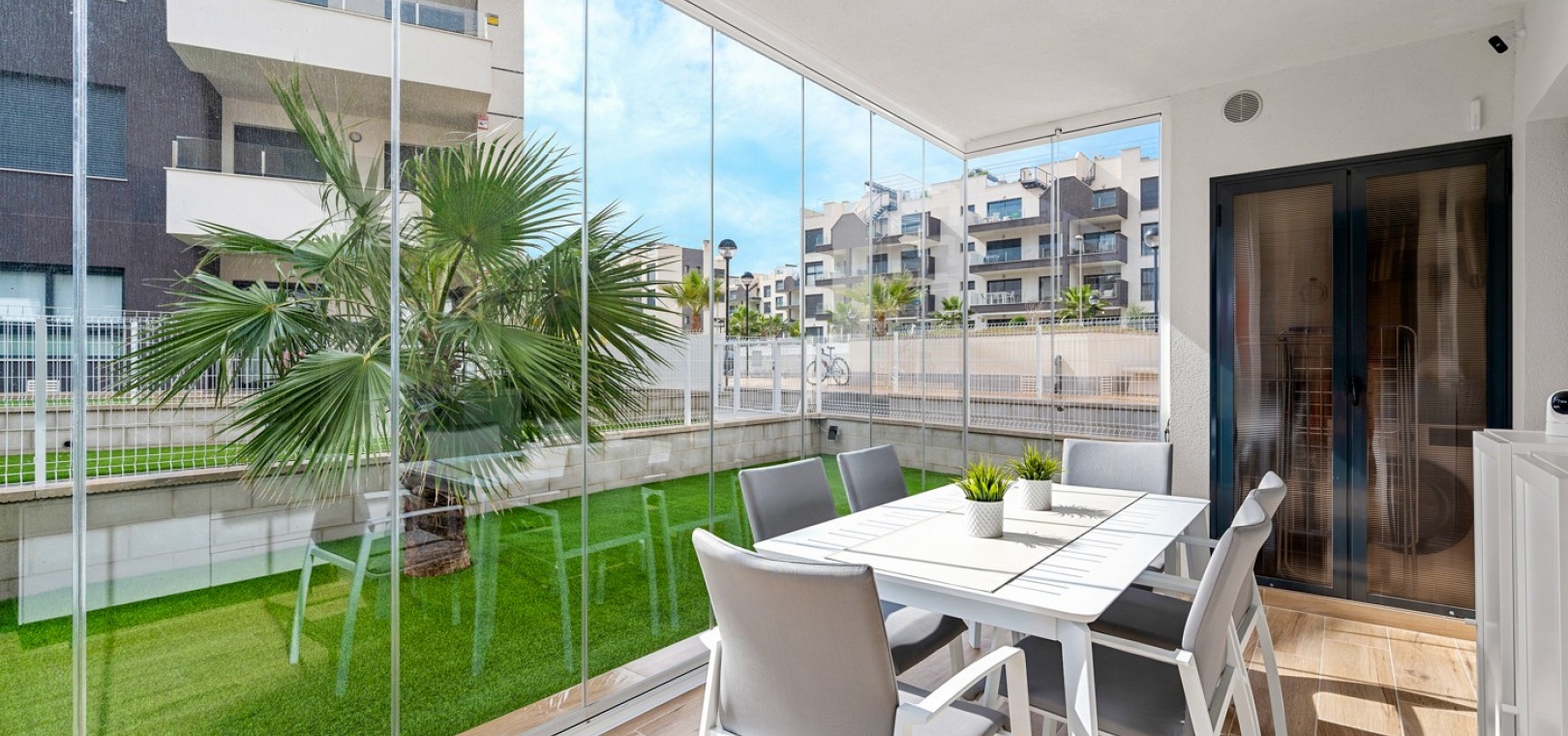 Das Anwesen verfügt über einen geräumigen Wohnbereich mit Essbereich, eine moderne U-förmige Küche, elektrische Rollläden, Klimaanlage (Heizung und Kühlung), ein großes Hauptschlafzimmer mit begehbarem Kleiderschrank und eigenem Bad, ein zweites Schlafzimmer mit Kleiderschrank und ein zusätzliches Badezimmer mit ebenerdiger Dusche. Durch die Schiebetüren haben Sie Zugang zur sonnigen Terrasse (mit kleinem Abstellraum), die vollständig umschlossen und mit Glasvorhängen für zusätzliche Privatsphäre und Komfort ausgestattet ist. Ein privater Parkplatz ist ebenfalls vorhanden.