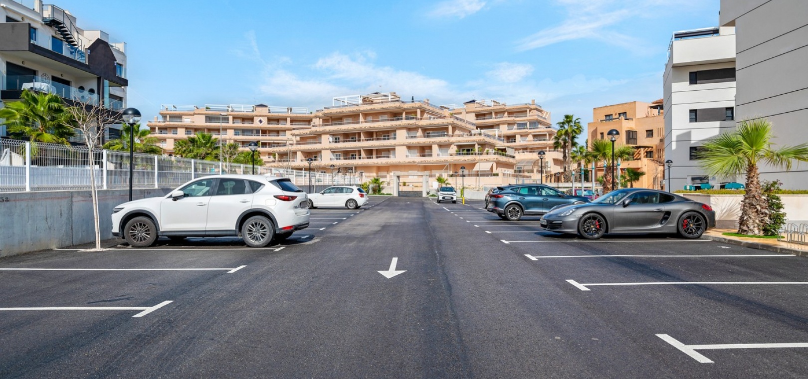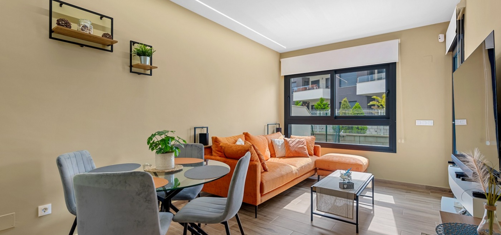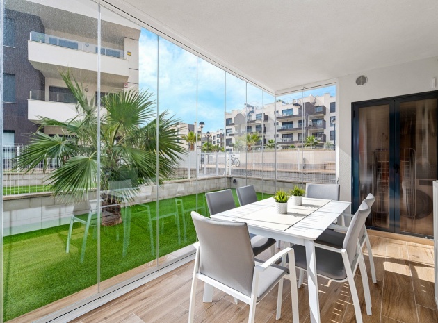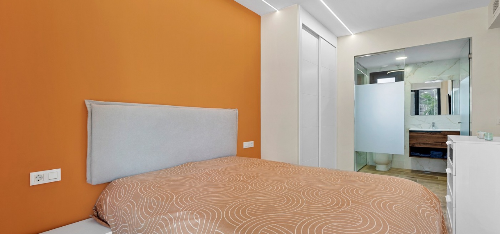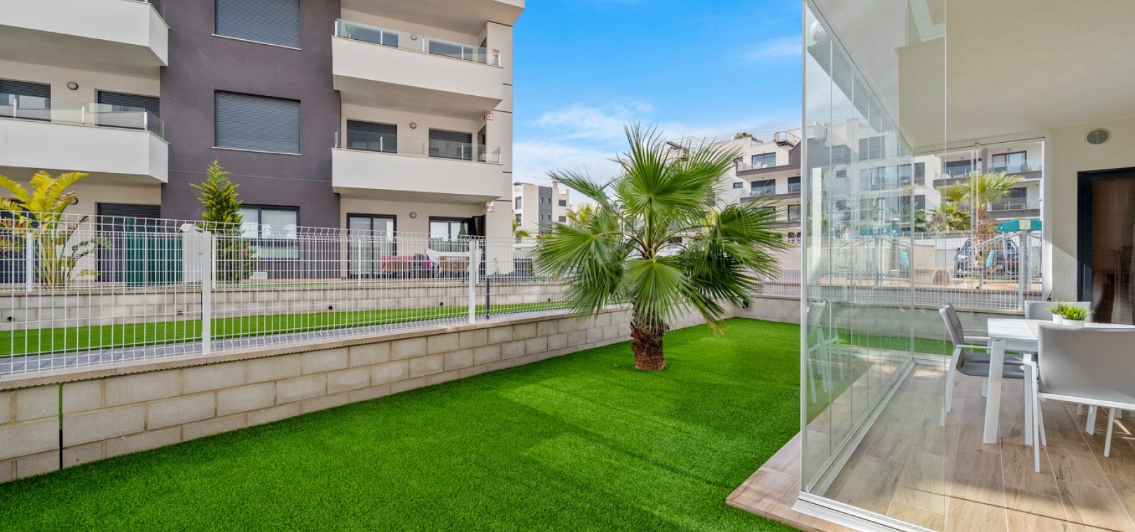 Das Anwesen verfügt über einen geräumigen Wohnbereich mit Essbereich, eine moderne U-förmige Küche, elektrische Rollläden, Klimaanlage (Heizung und Kühlung), ein großes Hauptschlafzimmer mit begehbarem Kleiderschrank und eigenem Bad, ein zweites Schlafzimmer mit Kleiderschrank und ein zusätzliches Badezimmer mit ebenerdiger Dusche. Durch die Schiebetüren haben Sie Zugang zur sonnigen Terrasse (mit kleinem Abstellraum), die vollständig umschlossen und mit Glasvorhängen für zusätzliche Privatsphäre und Komfort ausgestattet ist. Ein privater Parkplatz ist ebenfalls vorhanden.
