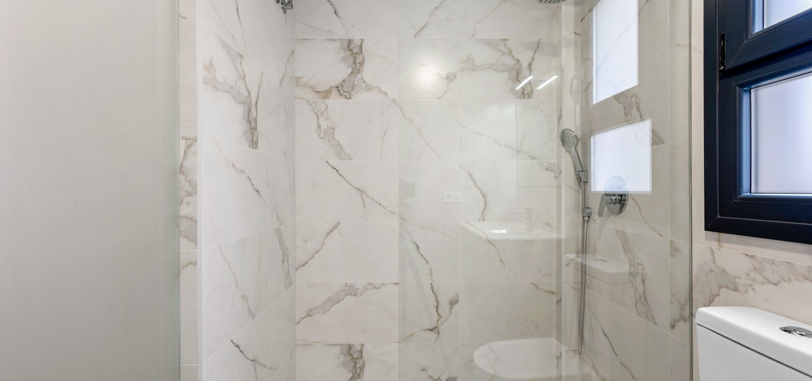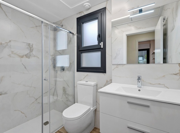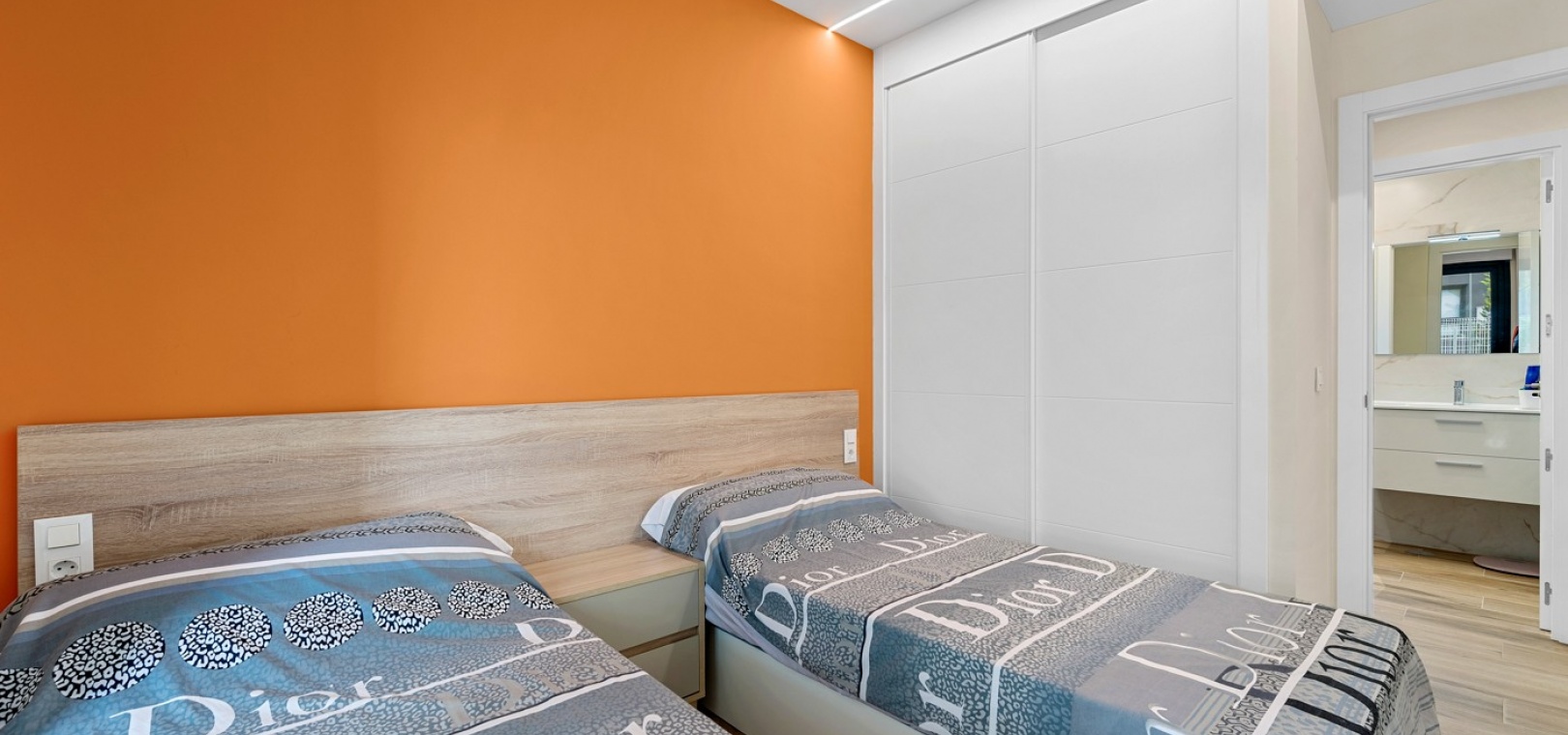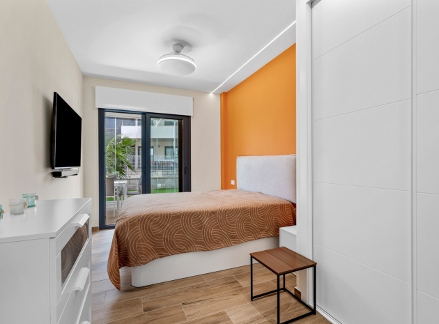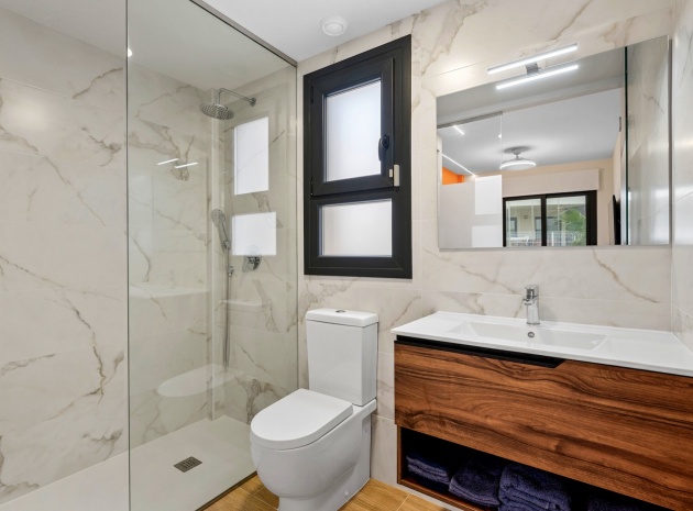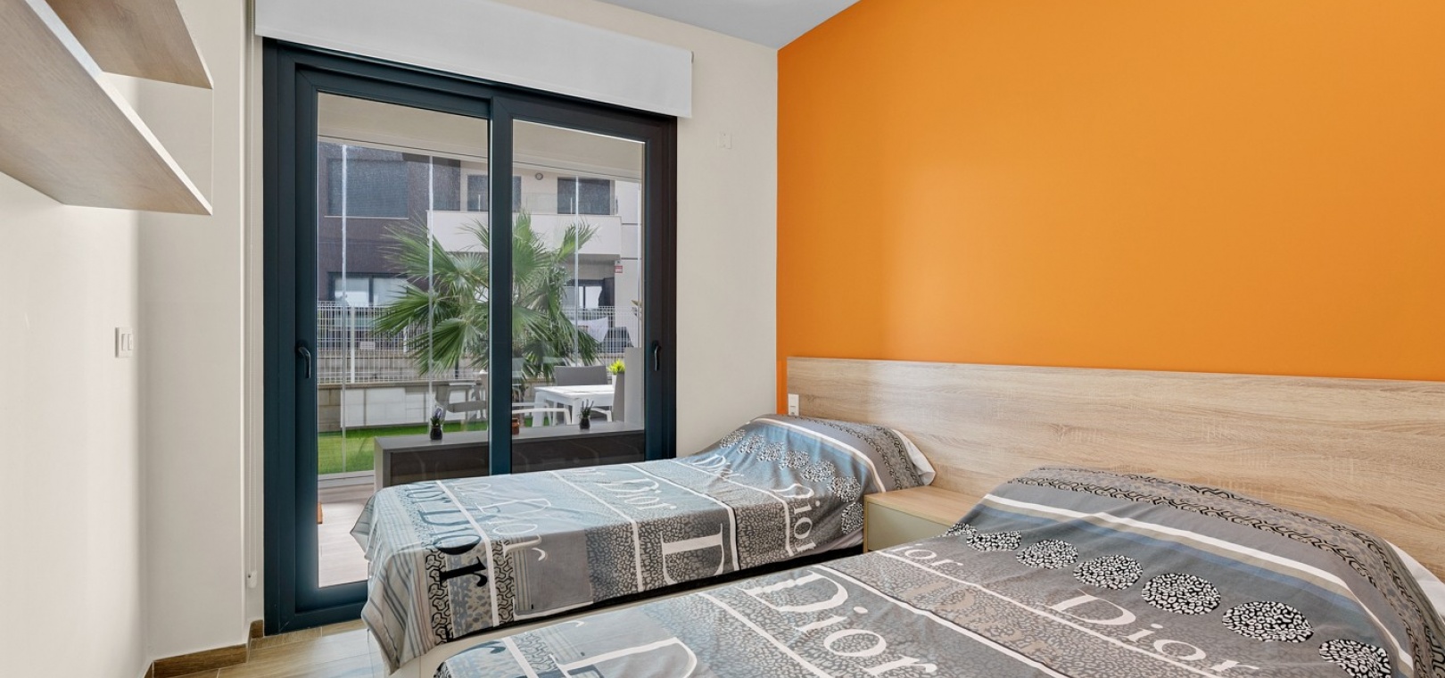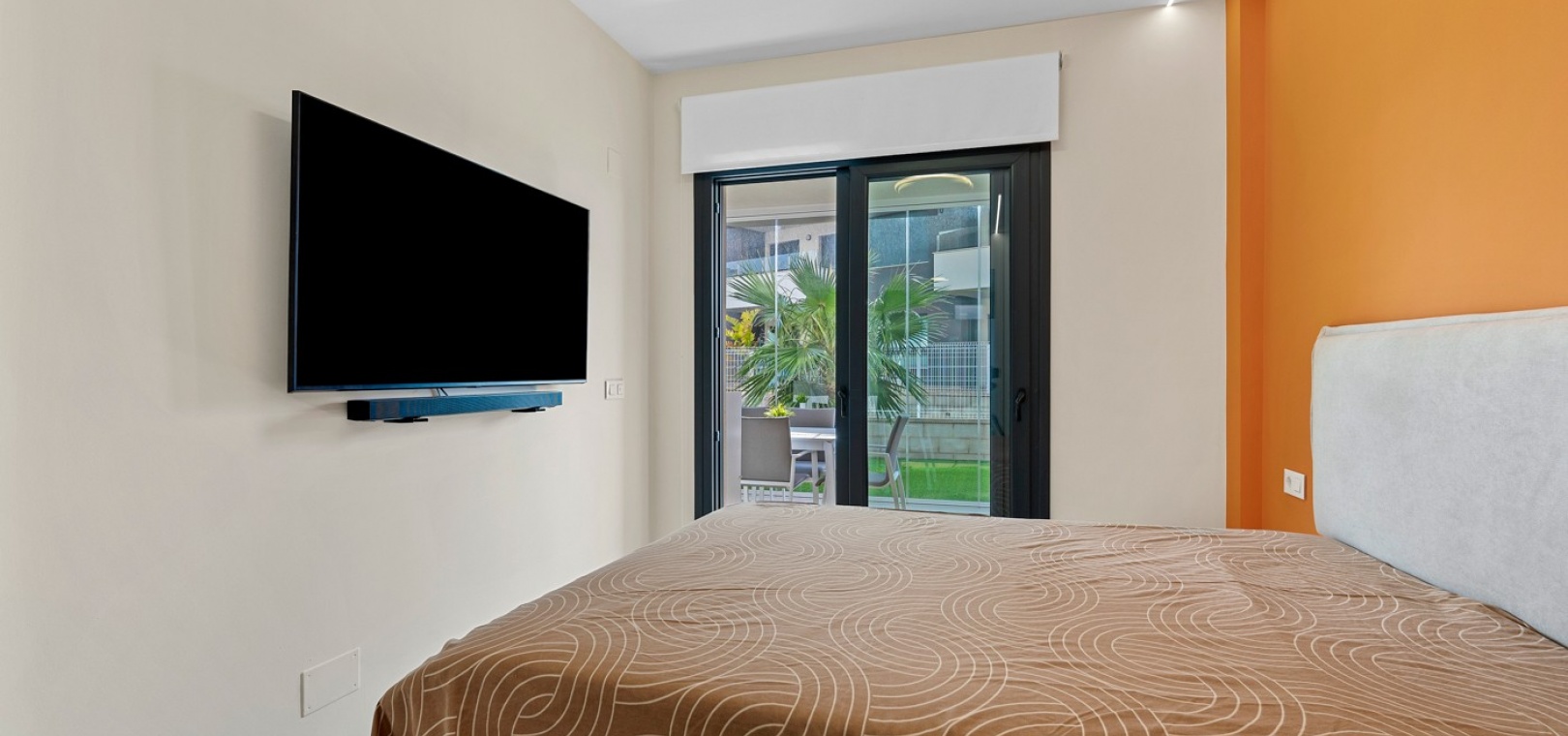 Das Anwesen verfügt über einen geräumigen Wohnbereich mit Essbereich, eine moderne U-förmige Küche, elektrische Rollläden, Klimaanlage (Heizung und Kühlung), ein großes Hauptschlafzimmer mit begehbarem Kleiderschrank und eigenem Bad, ein zweites Schlafzimmer mit Kleiderschrank und ein zusätzliches Badezimmer mit ebenerdiger Dusche. Durch die Schiebetüren haben Sie Zugang zur sonnigen Terrasse (mit kleinem Abstellraum), die vollständig umschlossen und mit Glasvorhängen für zusätzliche Privatsphäre und Komfort ausgestattet ist. Ein privater Parkplatz ist ebenfalls vorhanden.