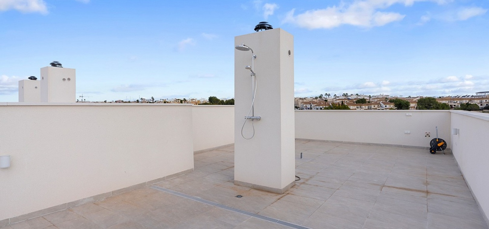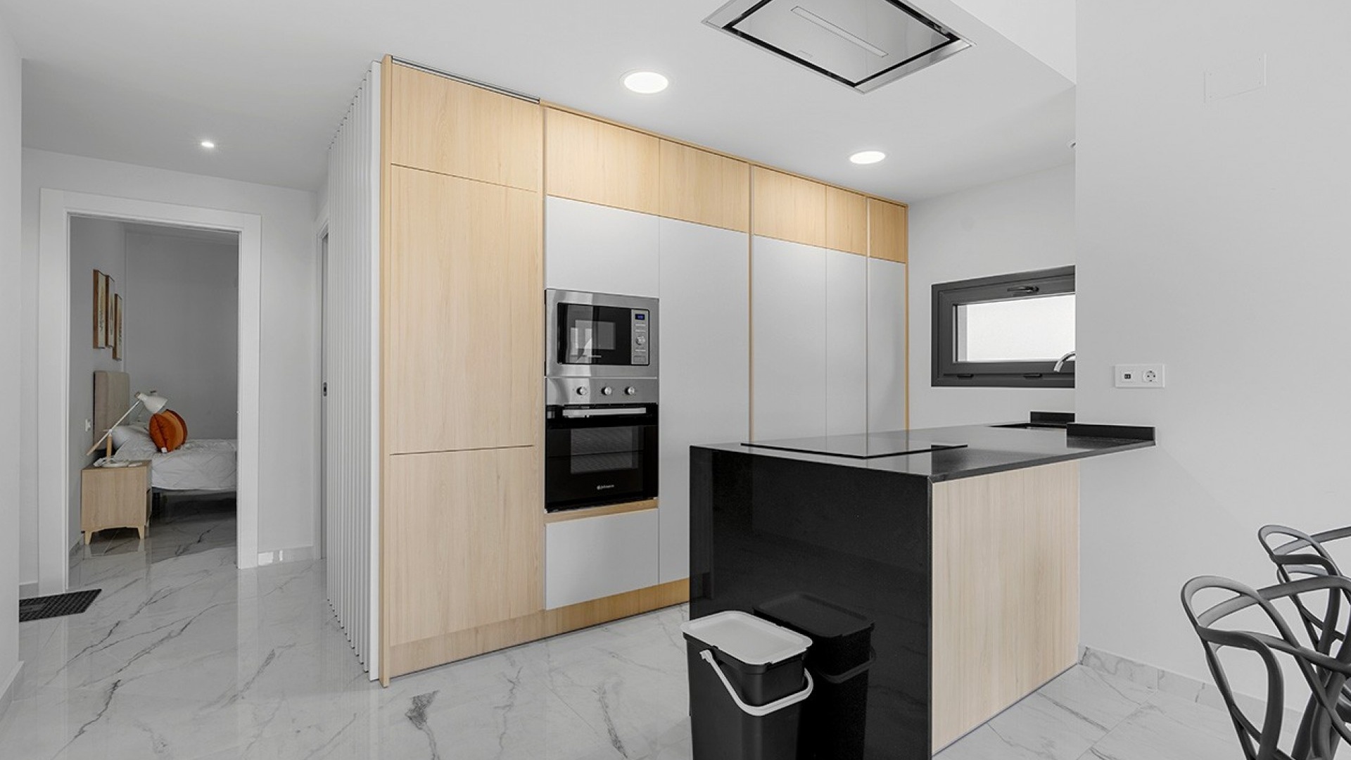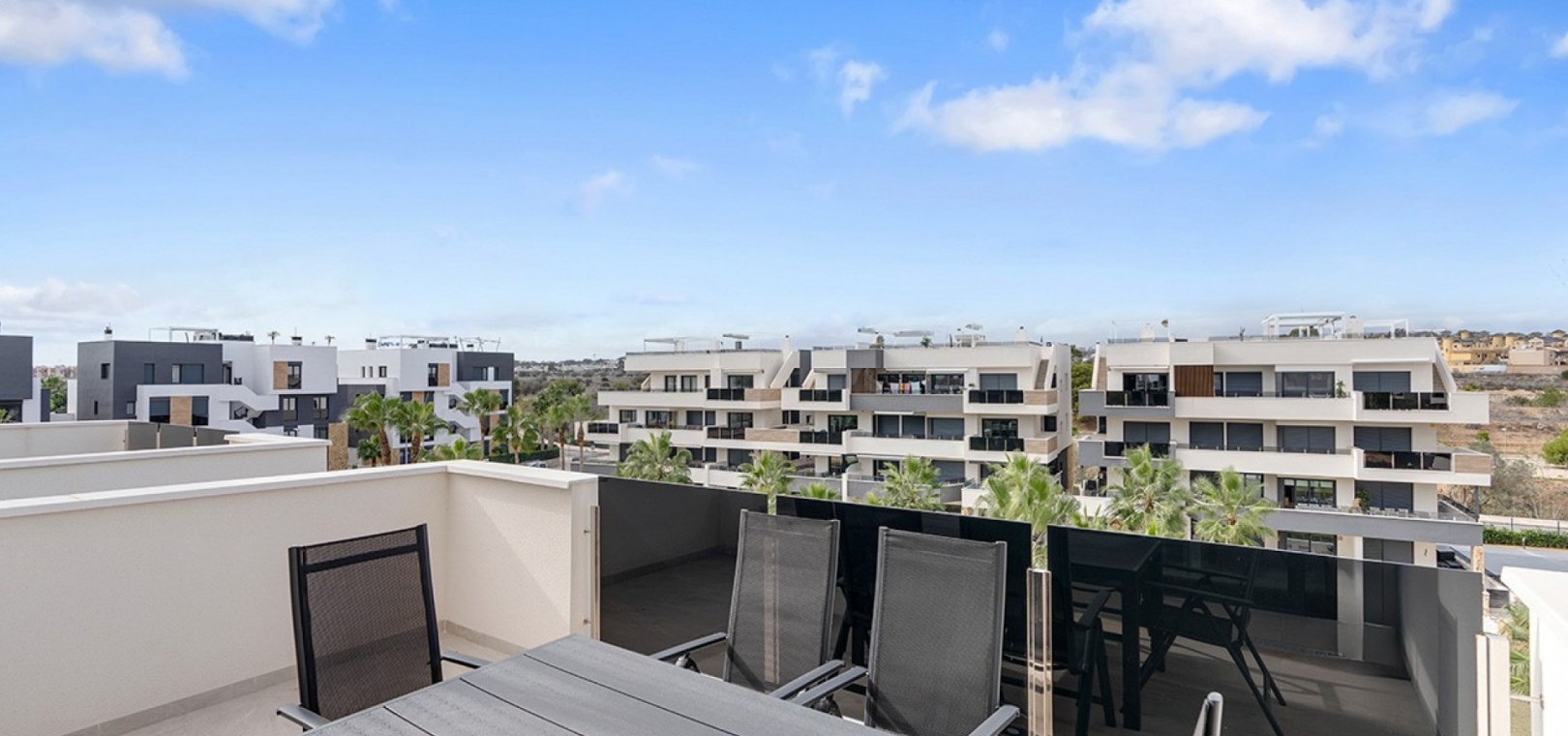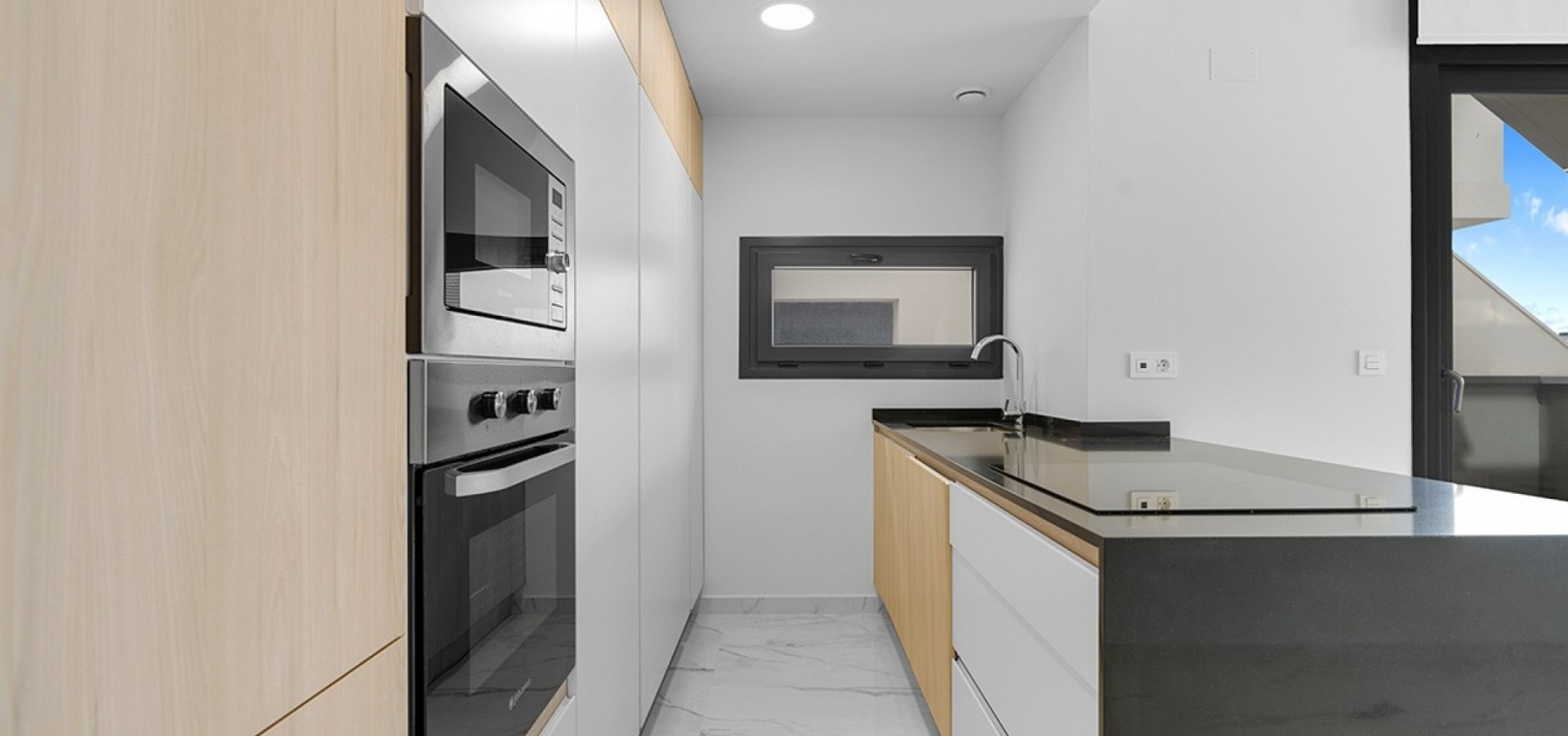 Die Wohnung verfügt über eine Wohnfläche von 71,69 m² und verteilt sich auf zwei geräumige Schlafzimmer mit Einbauschränken und zwei Badezimmer, eines davon en-suite, die elegant und mit modernen Materialien gestaltet sind. Die offene Küche ist mit integrierten Geräten und hochwertigen Materialien ausgestattet und direkt mit einem großzügigen, lichtdurchfluteten Wohn- und Essbereich verbunden. Vom Wohnzimmer aus gelangt man auf eine private Terrasse, auf der man das Klima der Costa Blanca genießen kann. Darüber hinaus verfügt die Immobilie über eine 60,85 m² große private Sonnenterrasse mit Außendusche, ideal zum Entspannen, Grillen oder Genießen des Panoramablicks.