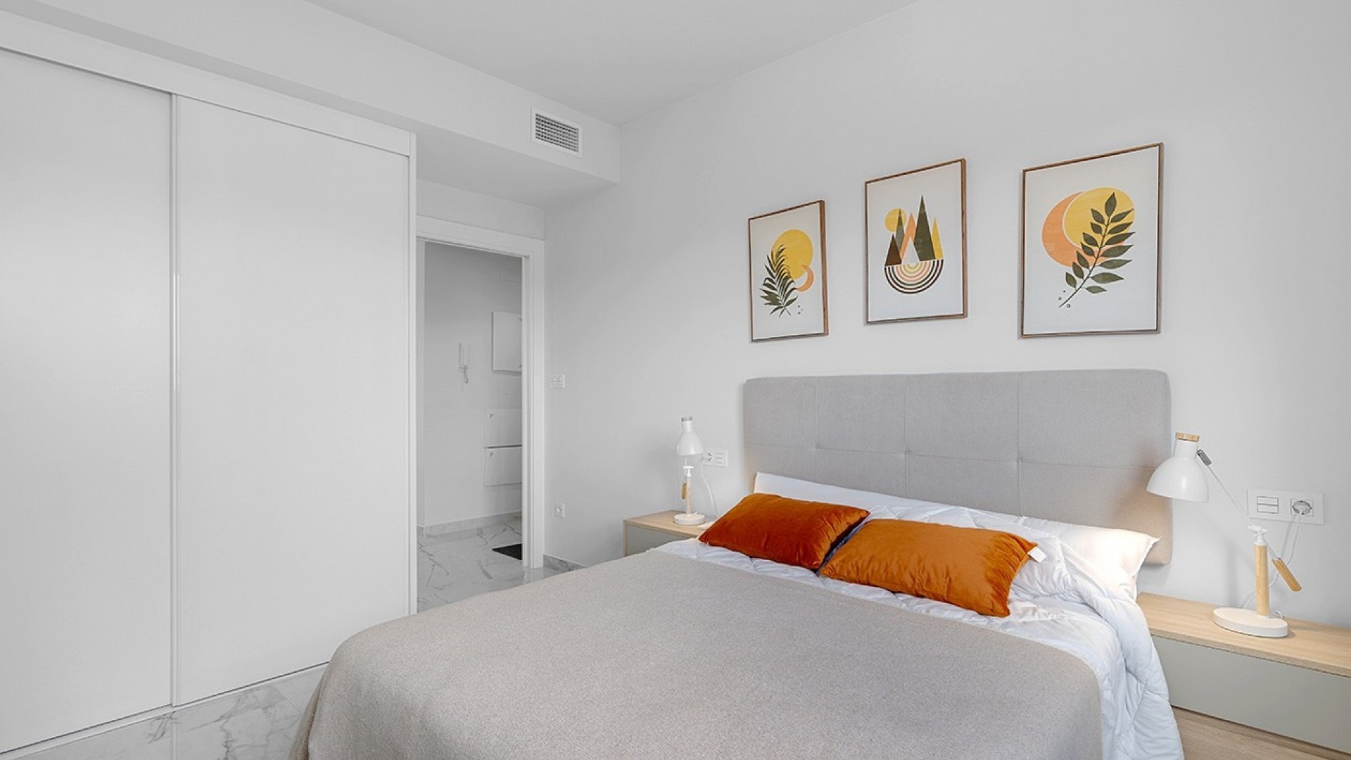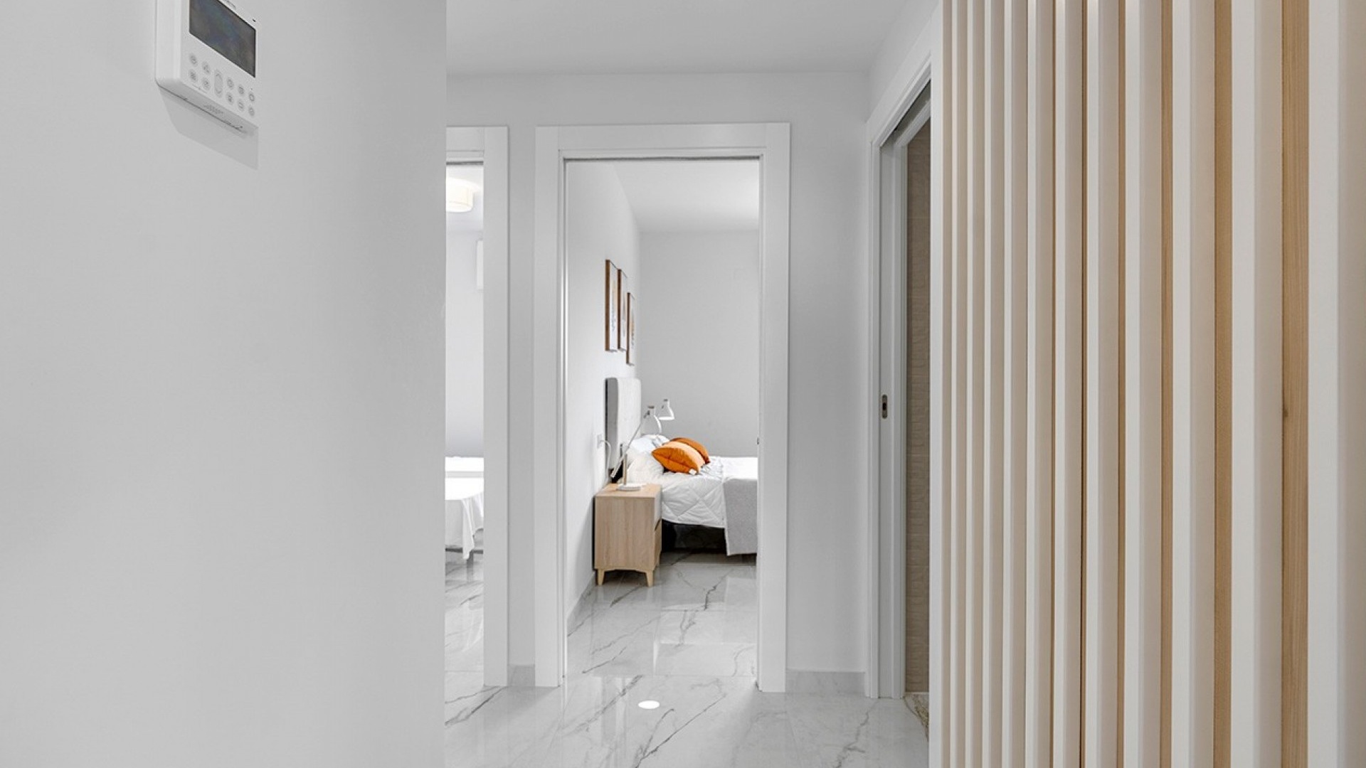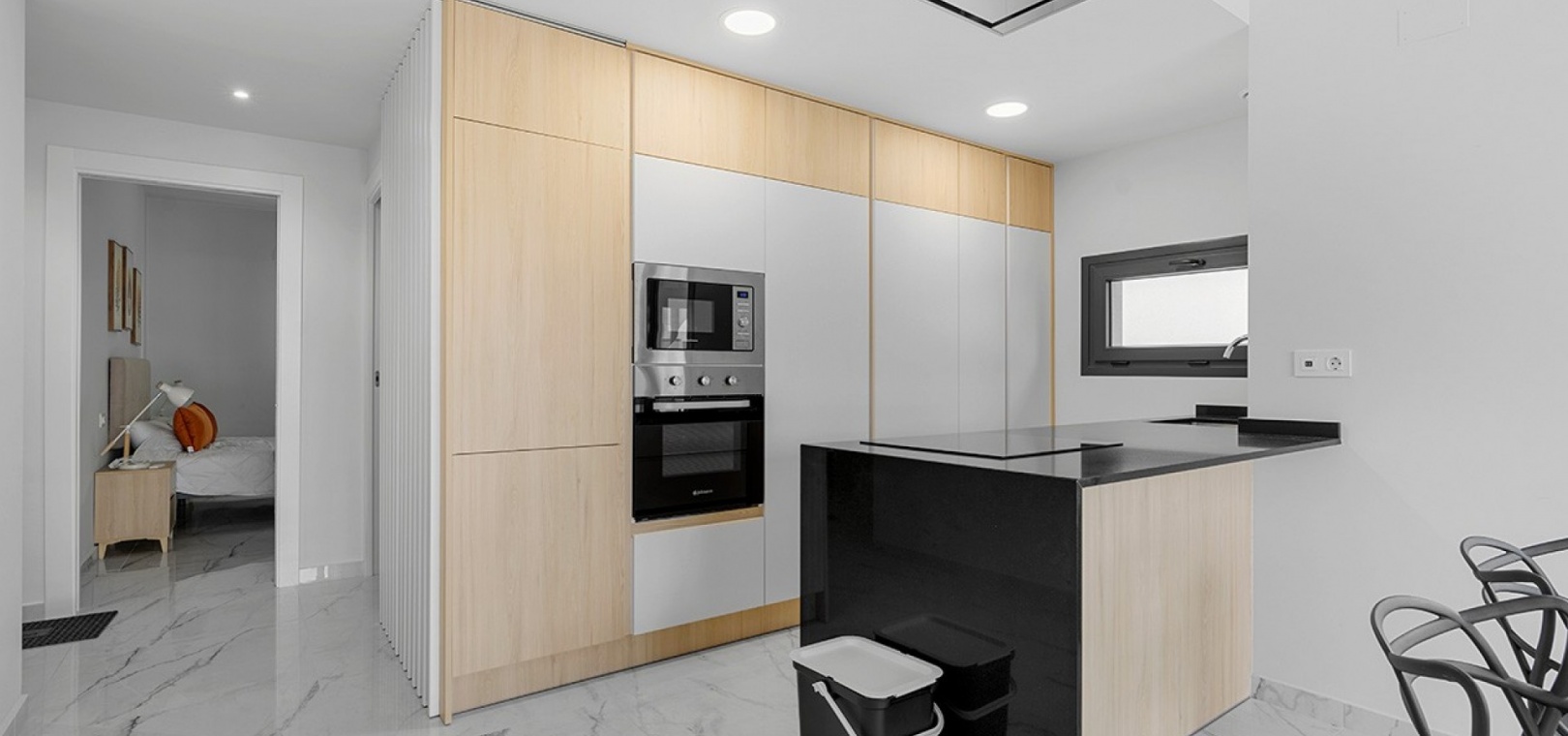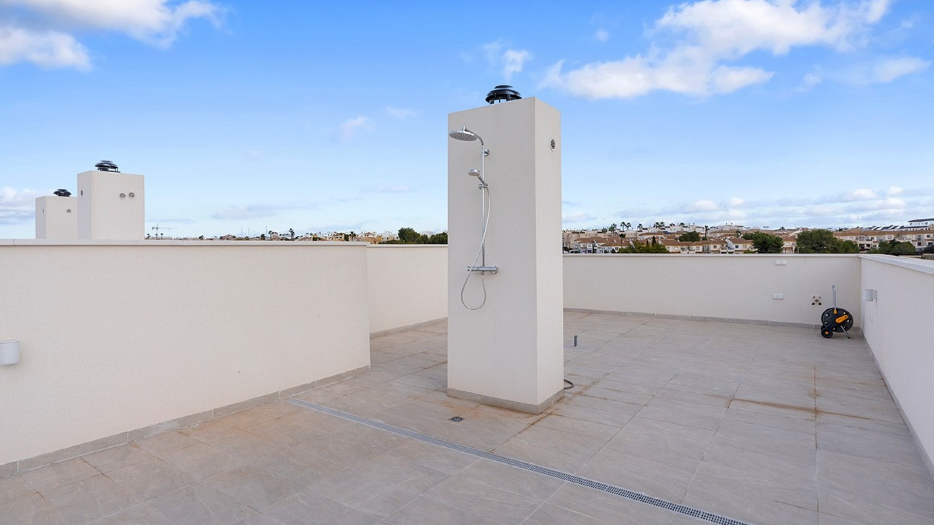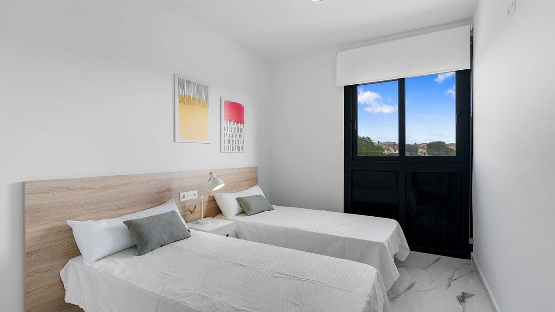 Die Wohnung verfügt über eine Wohnfläche von 71,69 m² und verteilt sich auf zwei geräumige Schlafzimmer mit Einbauschränken und zwei Badezimmer, eines davon en-suite, die elegant und mit modernen Materialien gestaltet sind. Die offene Küche ist mit integrierten Geräten und hochwertigen Materialien ausgestattet und direkt mit einem großzügigen, lichtdurchfluteten Wohn- und Essbereich verbunden. Vom Wohnzimmer aus gelangt man auf eine private Terrasse, auf der man das Klima der Costa Blanca genießen kann. Darüber hinaus verfügt die Immobilie über eine 60,85 m² große private Sonnenterrasse mit Außendusche, ideal zum Entspannen, Grillen oder Genießen des Panoramablicks.