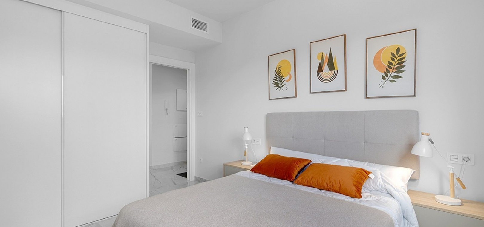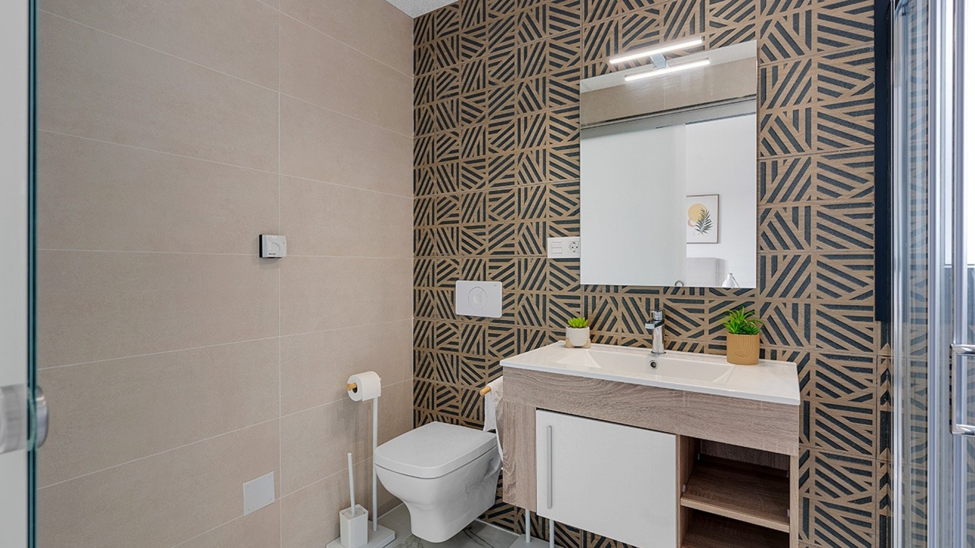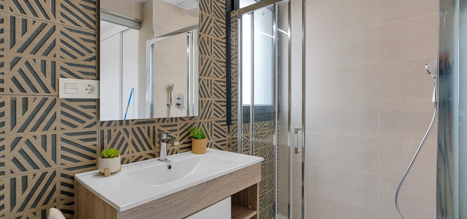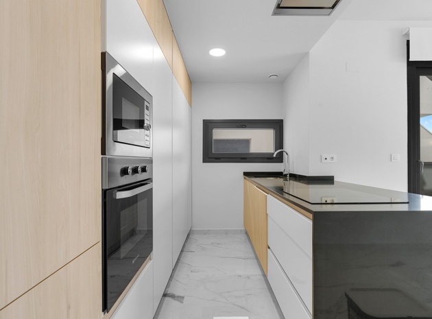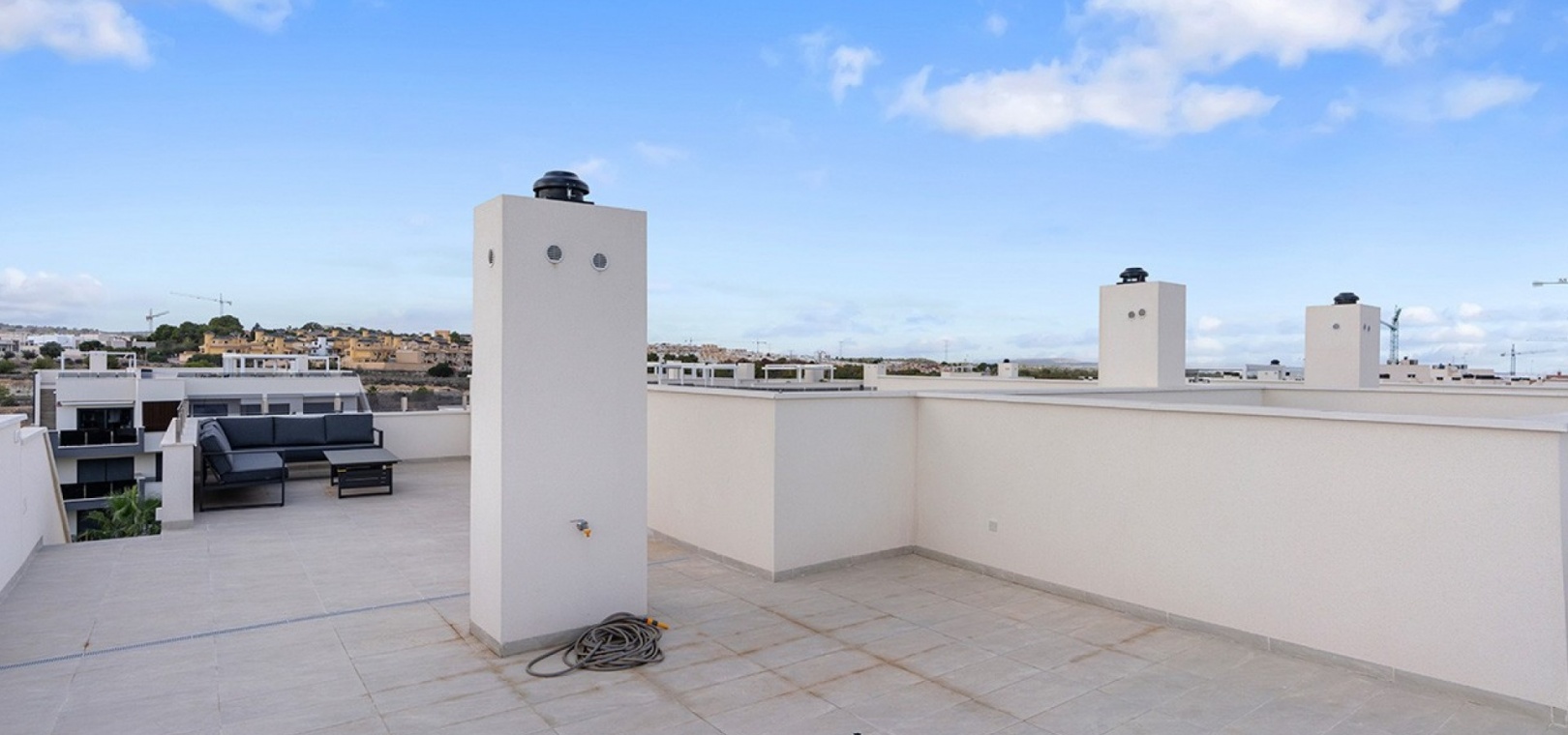 Die Wohnung verfügt über eine Wohnfläche von 71,69 m² und verteilt sich auf zwei geräumige Schlafzimmer mit Einbauschränken und zwei Badezimmer, eines davon en-suite, die elegant und mit modernen Materialien gestaltet sind. Die offene Küche ist mit integrierten Geräten und hochwertigen Materialien ausgestattet und direkt mit einem großzügigen, lichtdurchfluteten Wohn- und Essbereich verbunden. Vom Wohnzimmer aus gelangt man auf eine private Terrasse, auf der man das Klima der Costa Blanca genießen kann. Darüber hinaus verfügt die Immobilie über eine 60,85 m² große private Sonnenterrasse mit Außendusche, ideal zum Entspannen, Grillen oder Genießen des Panoramablicks.