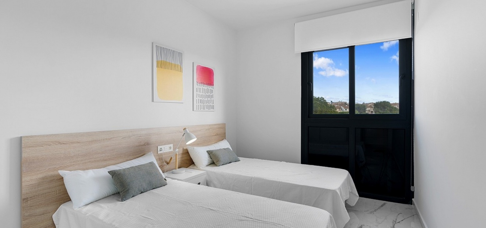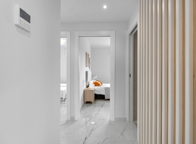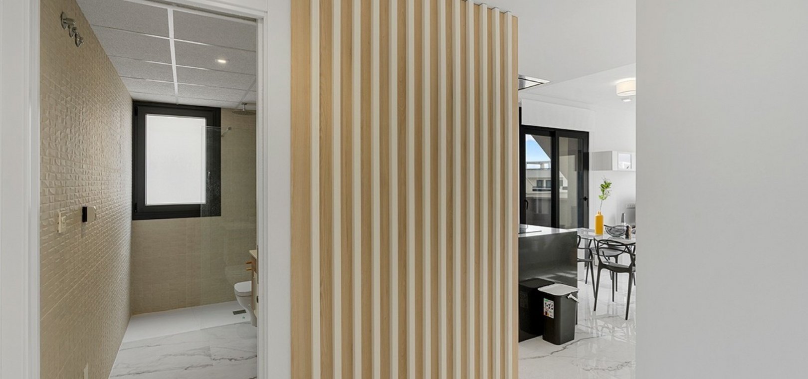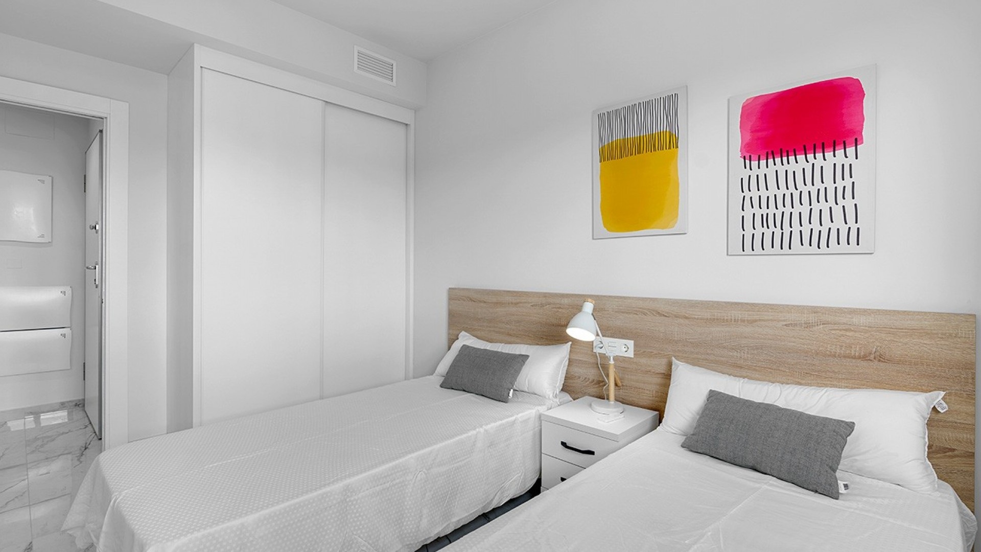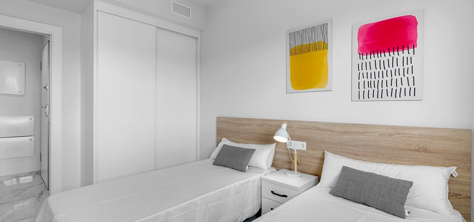 Die Wohnung verfügt über eine Wohnfläche von 71,69 m² und verteilt sich auf zwei geräumige Schlafzimmer mit Einbauschränken und zwei Badezimmer, eines davon en-suite, die elegant und mit modernen Materialien gestaltet sind. Die offene Küche ist mit integrierten Geräten und hochwertigen Materialien ausgestattet und direkt mit einem großzügigen, lichtdurchfluteten Wohn- und Essbereich verbunden. Vom Wohnzimmer aus gelangt man auf eine private Terrasse, auf der man das Klima der Costa Blanca genießen kann. Darüber hinaus verfügt die Immobilie über eine 60,85 m² große private Sonnenterrasse mit Außendusche, ideal zum Entspannen, Grillen oder Genießen des Panoramablicks.