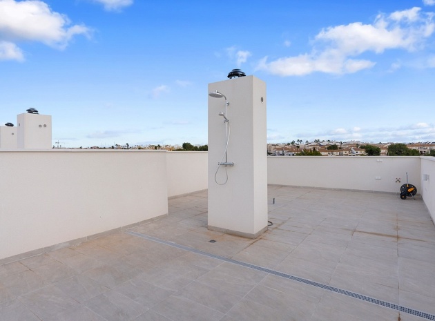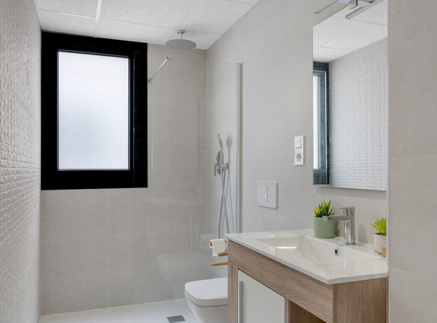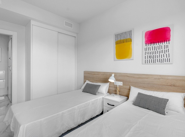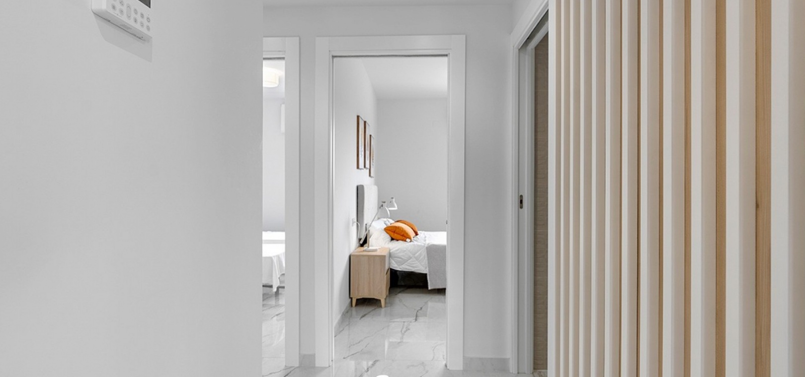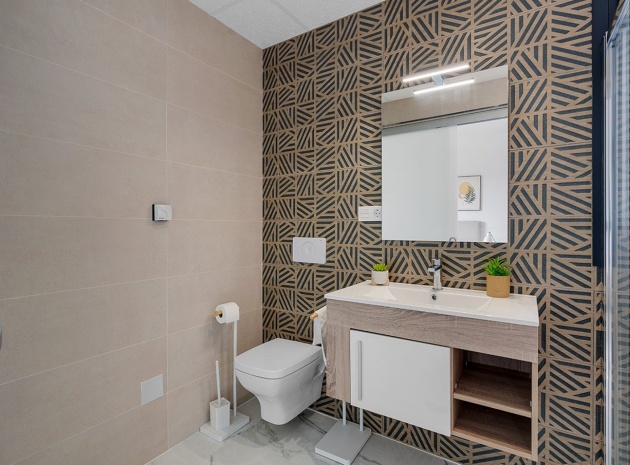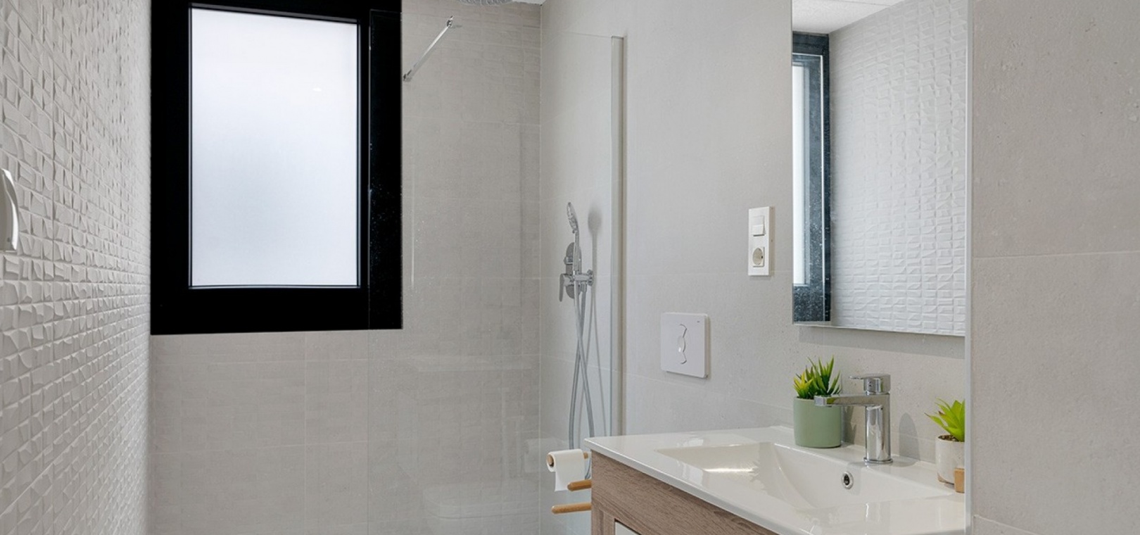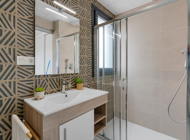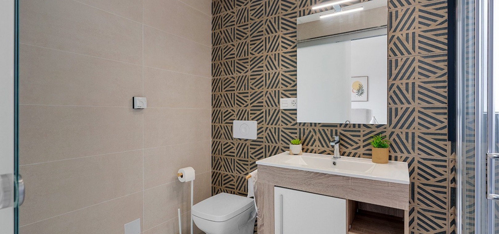 Die Wohnung verfügt über eine Wohnfläche von 71,69 m² und verteilt sich auf zwei geräumige Schlafzimmer mit Einbauschränken und zwei Badezimmer, eines davon en-suite, die elegant und mit modernen Materialien gestaltet sind. Die offene Küche ist mit integrierten Geräten und hochwertigen Materialien ausgestattet und direkt mit einem großzügigen, lichtdurchfluteten Wohn- und Essbereich verbunden. Vom Wohnzimmer aus gelangt man auf eine private Terrasse, auf der man das Klima der Costa Blanca genießen kann. Darüber hinaus verfügt die Immobilie über eine 60,85 m² große private Sonnenterrasse mit Außendusche, ideal zum Entspannen, Grillen oder Genießen des Panoramablicks.