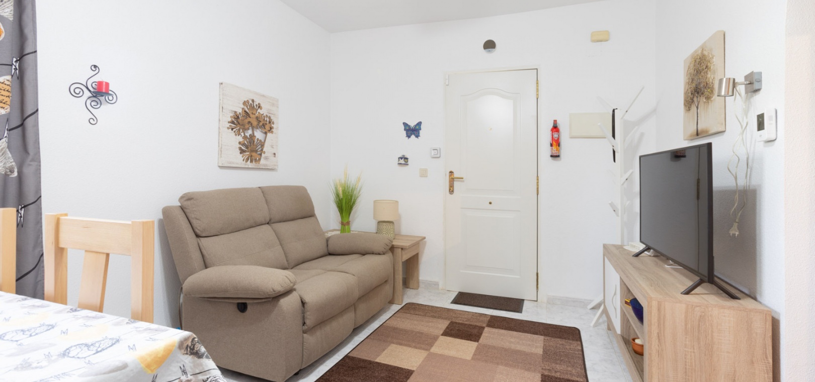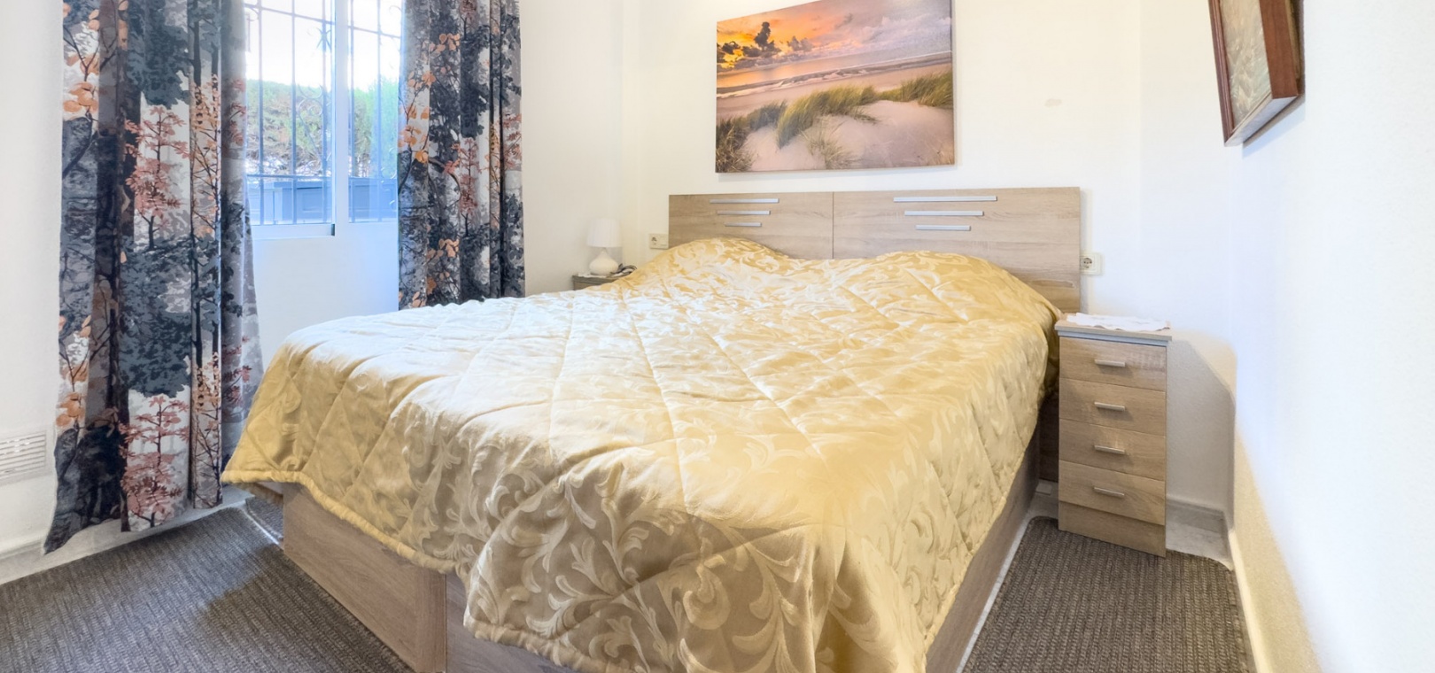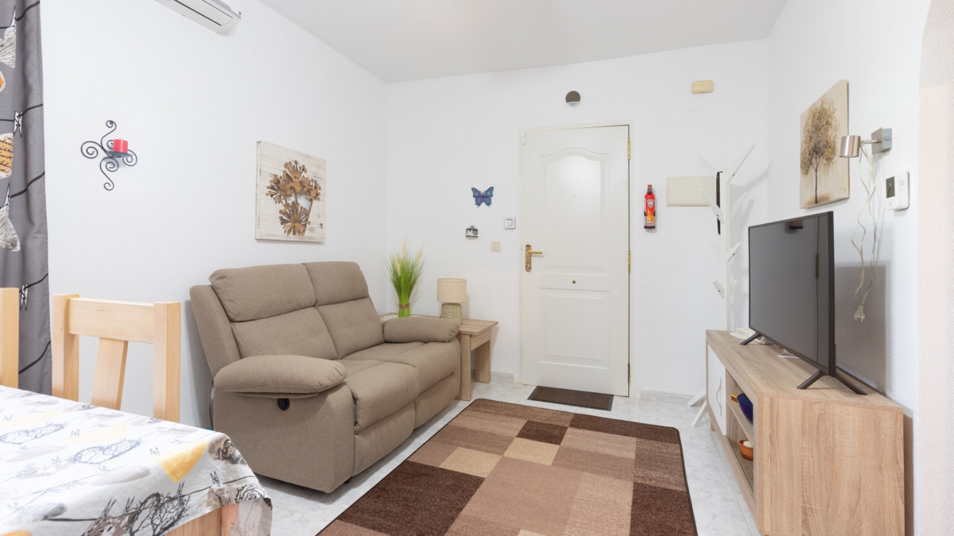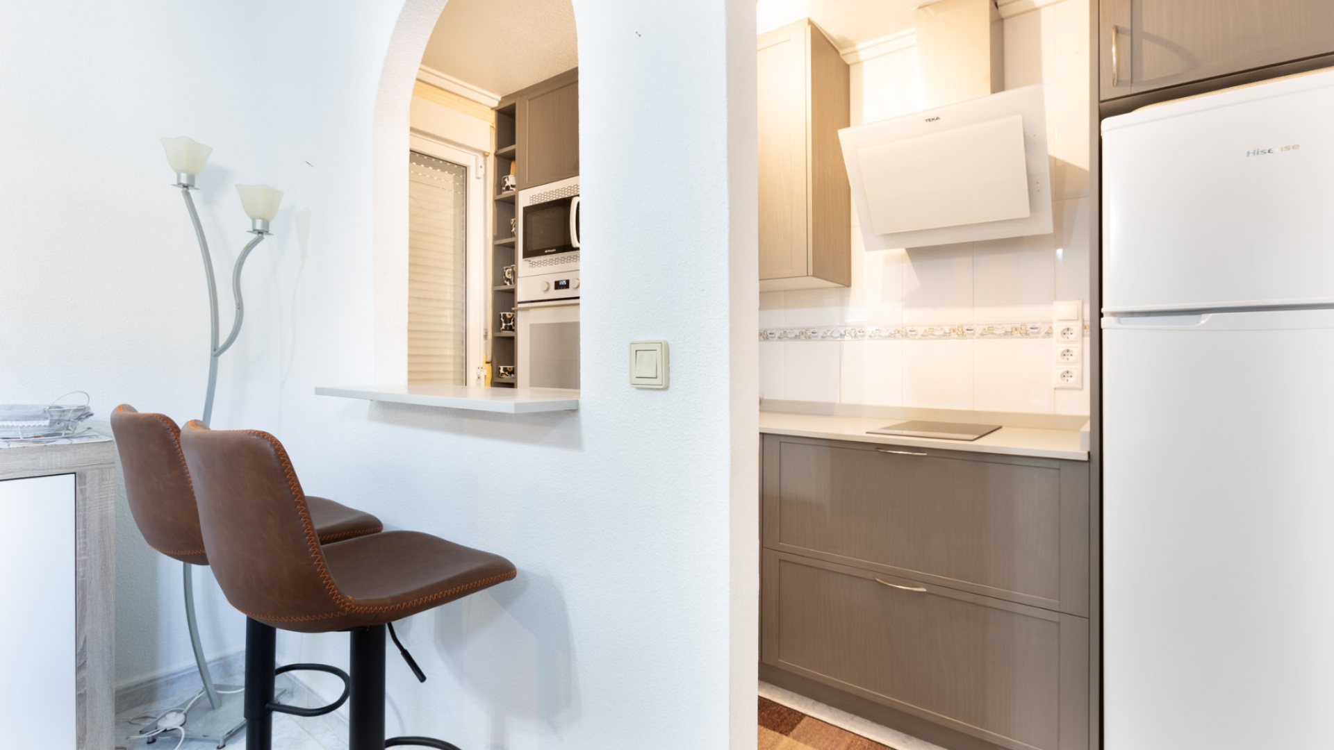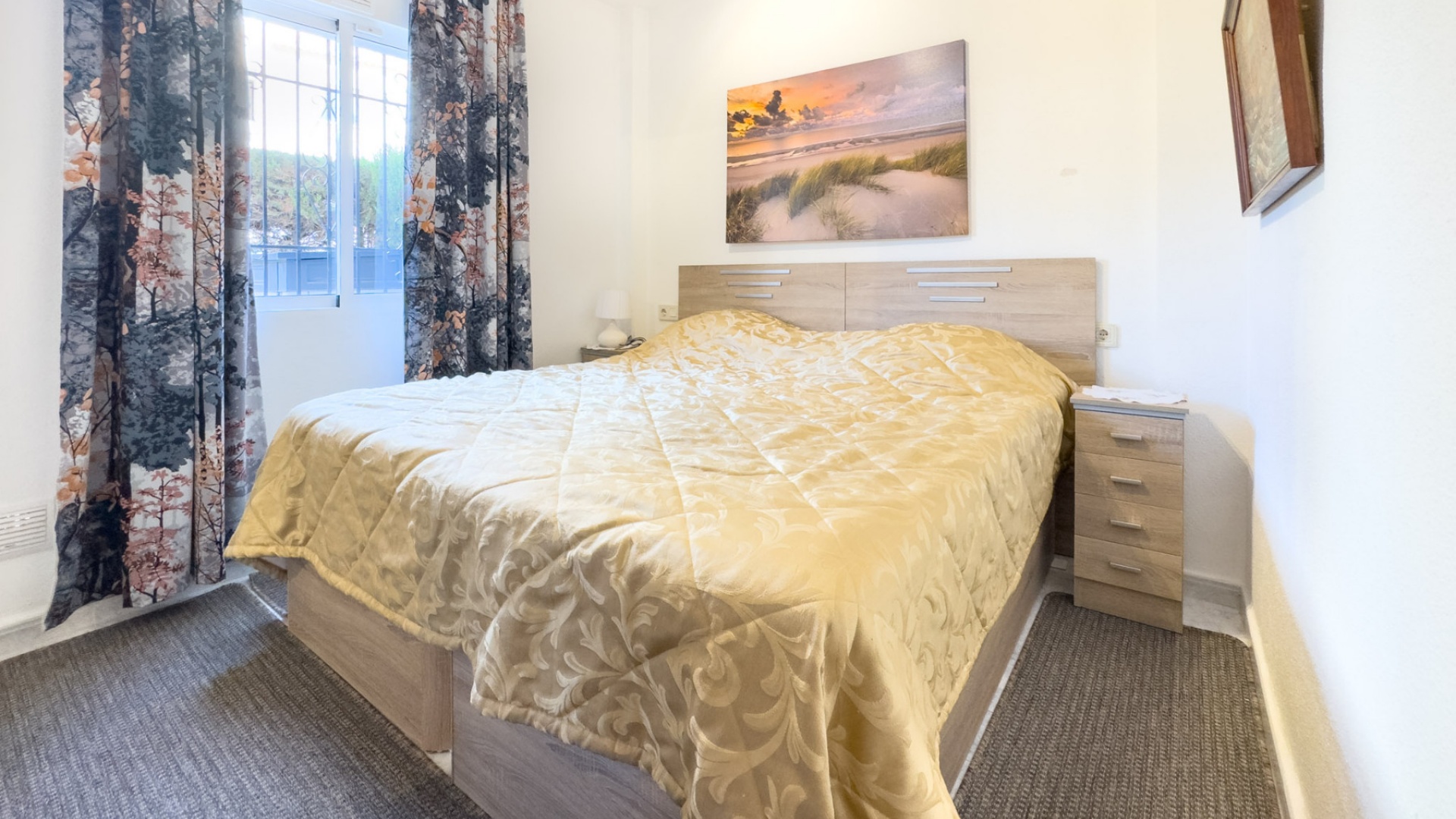 Die Wohnung verfügt über zwei geräumige Schlafzimmer und ein gepflegtes Badezimmer. Die Küche wurde kürzlich modern renoviert, und die Klimaanlage sorgt ganzjährig für ein angenehmes Raumklima. Ein großer Vorteil dieser Immobilie ist der private, eingezäunte Garten, der auch Platz für ein Auto bietet und durch ein praktisches privates Tor erreichbar ist. Dies trägt zum Komfort des Alltags bei und bietet zusätzliche Privatsphäre und Sicherheit.